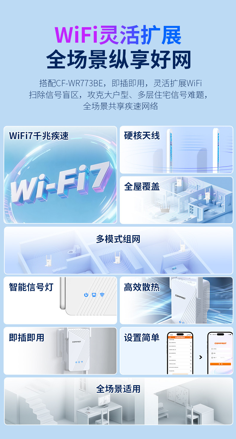 [Comfast]Wifi 7 Signal Extender Wireless Network Signal Booster Amplifier 5g Dual-Band High-Speed Gigabit Wall-Penetrating Repeater Home Long-Distance Routing Extension Bridge