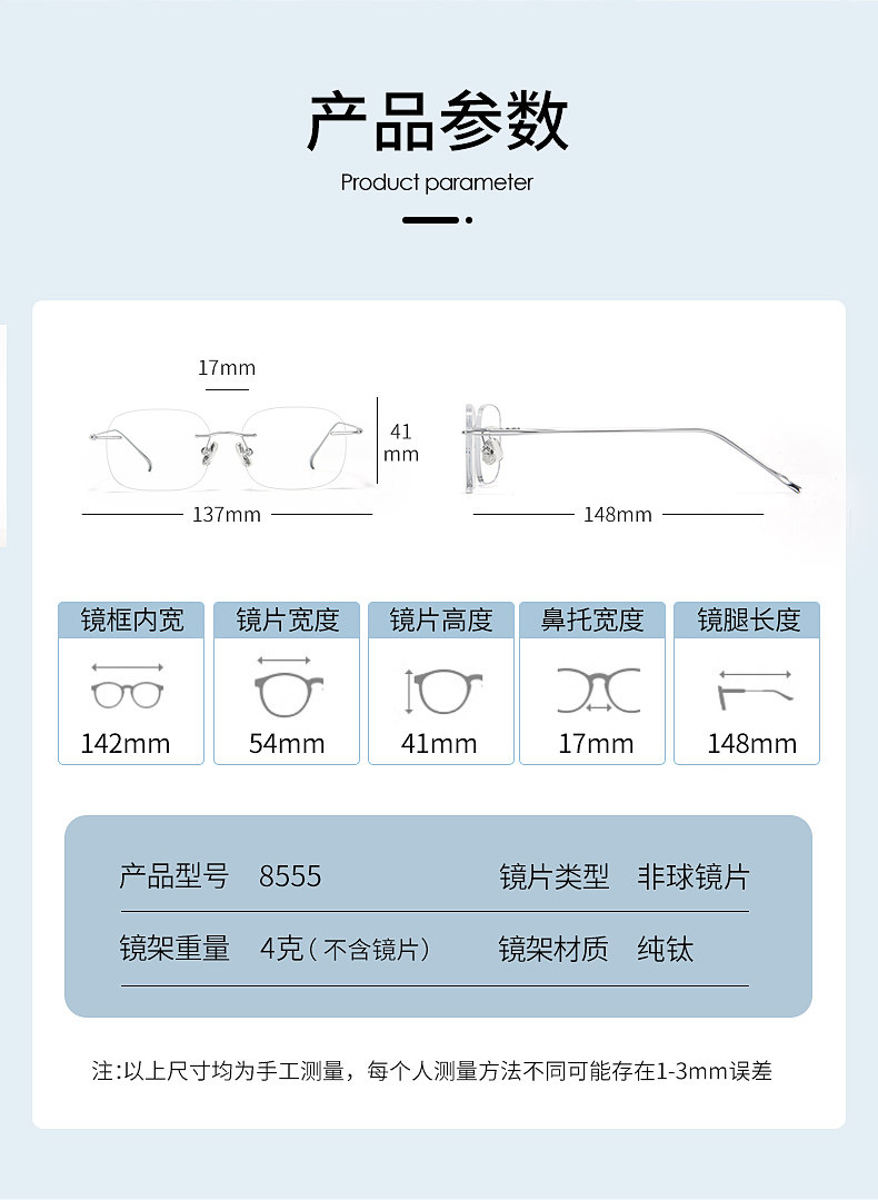 | Color Classification | [Japanese Imported Pure Titanium] Xf8555 Temperament Silver,[Pure Titanium Imported from Japan] Xf8555 Rose Gold,[Japanese Imported Pure Titanium] Cf8555 Versatile Black,[Japanese Imported Pure Titanium] My8555 Rose Gold-Cat Eye,[Japanese Imported Pure Titanium] My8555 Starlight Silver-Cat Eye,[Pure Titanium Imported from Japan] Db8555 Rose Gold-Polygon,[Pure Titanium Imported from Japan] Db8555 Starlight Silver-Polygon |