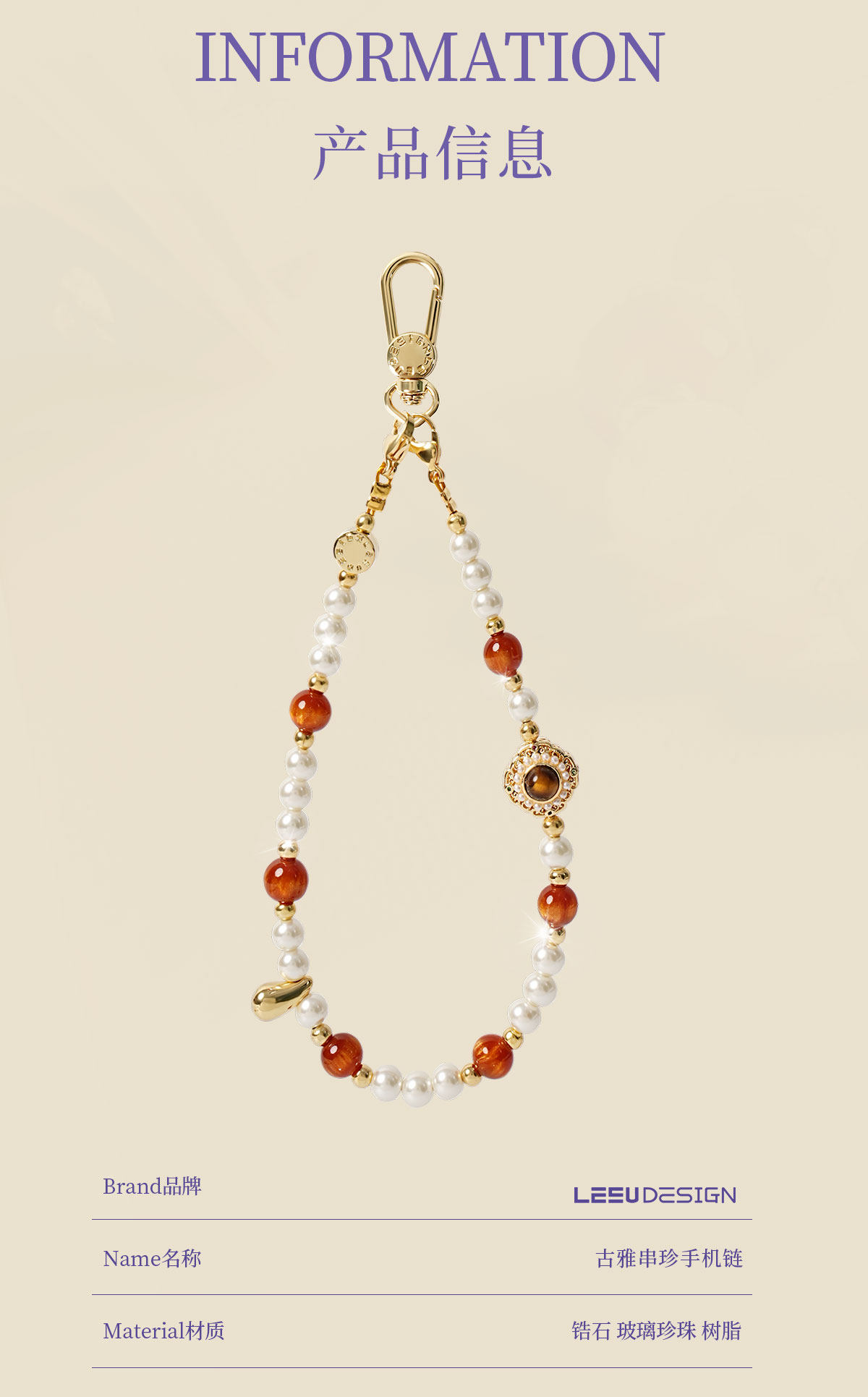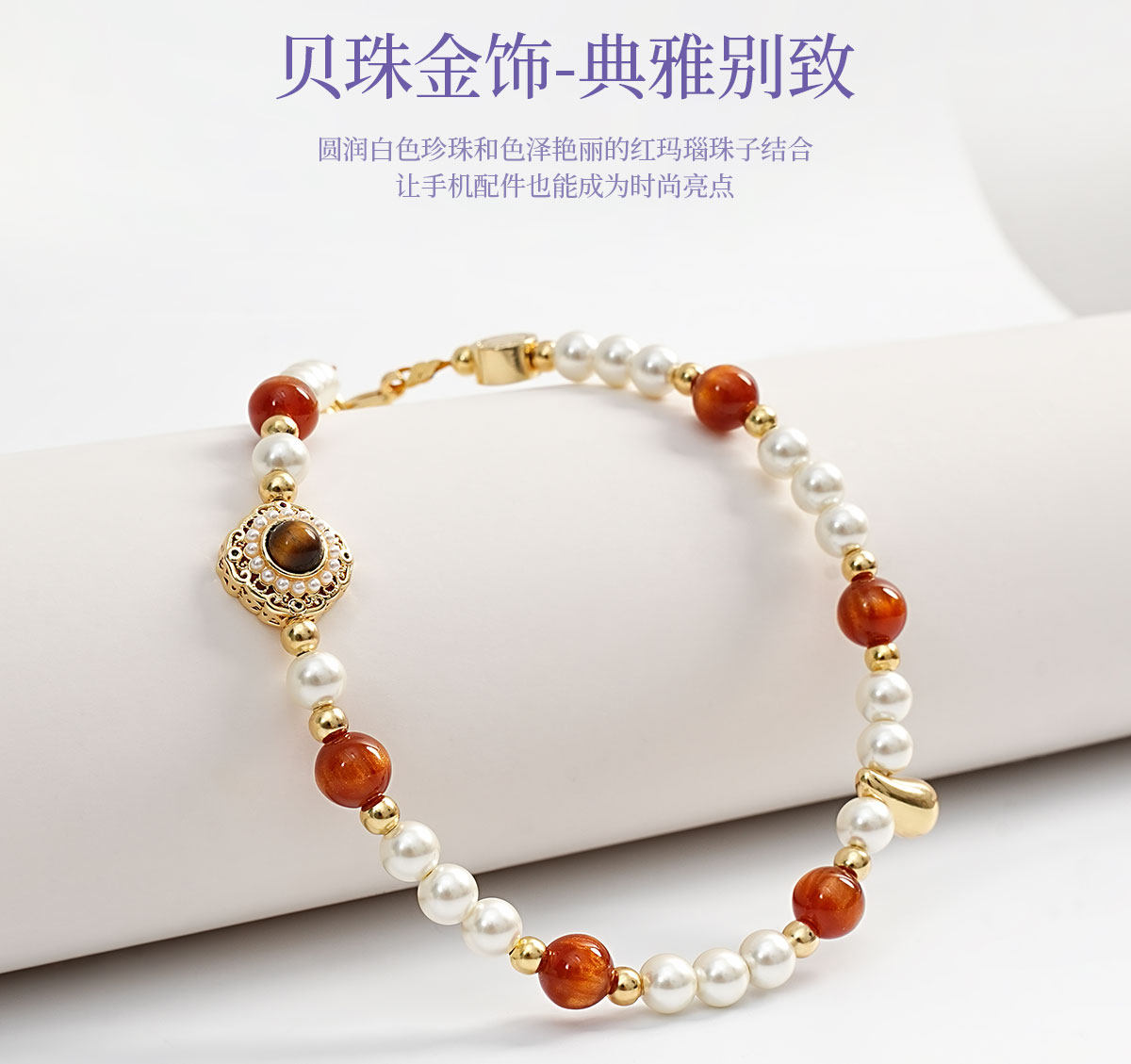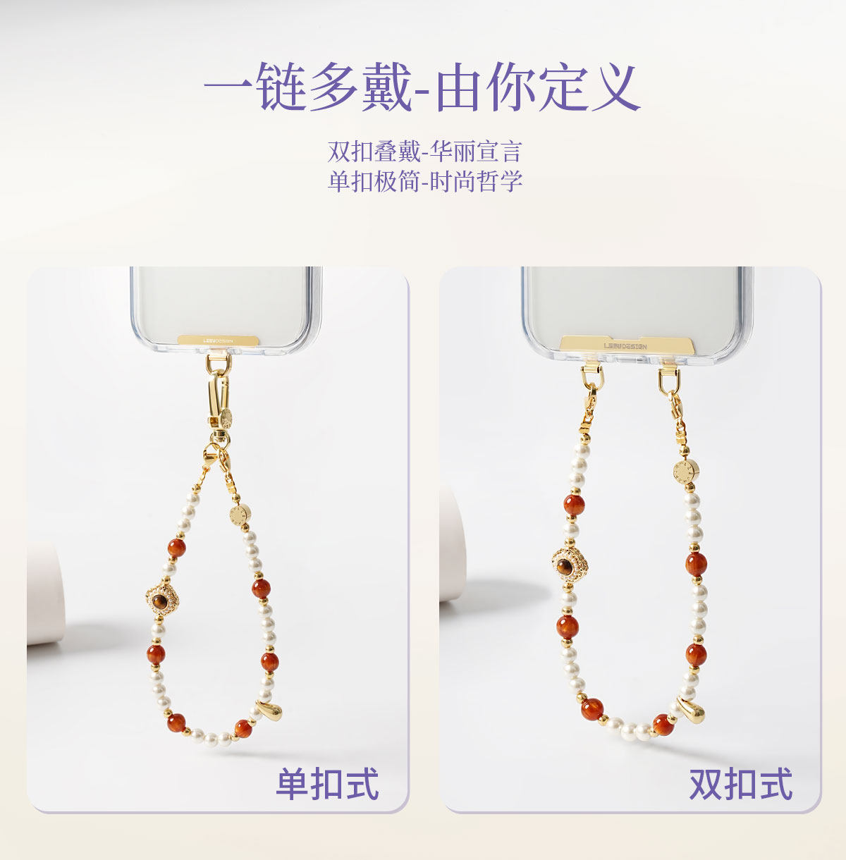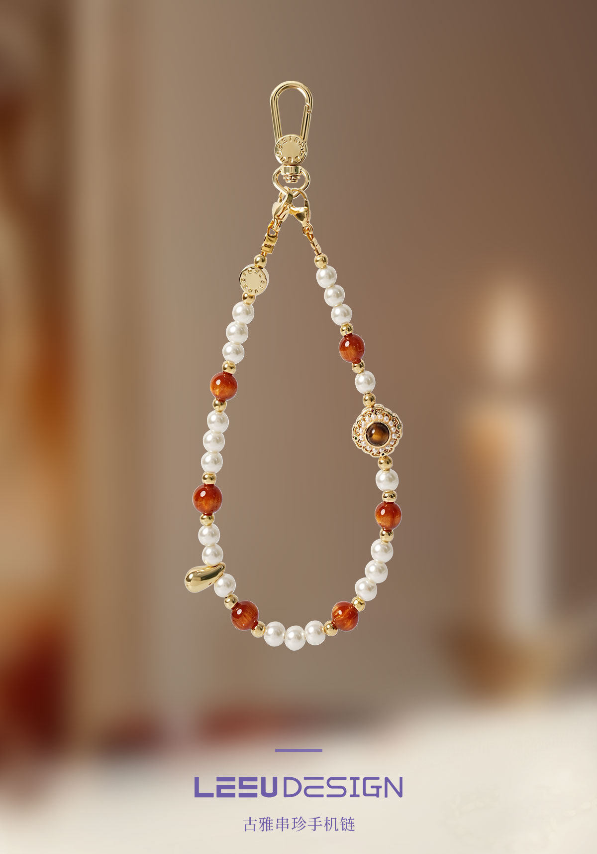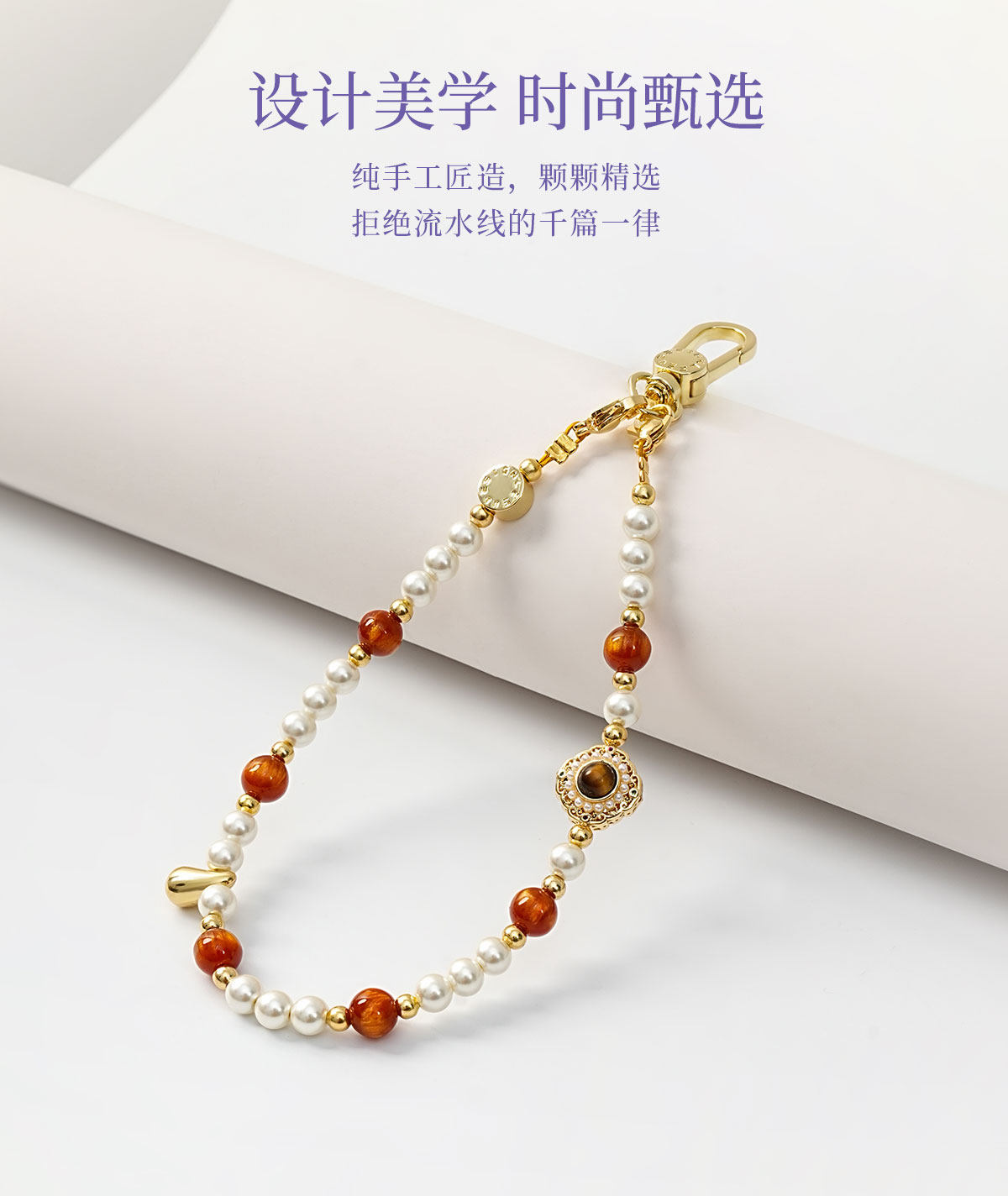 Leeudesign New High-End Mobile Phone Chain, Luxury Tiger Eye Stone Pearl Phone Lanyard, Double Buckle Wrist Strap, Anti-Lost Short Pendant, Bag Accessory for Women