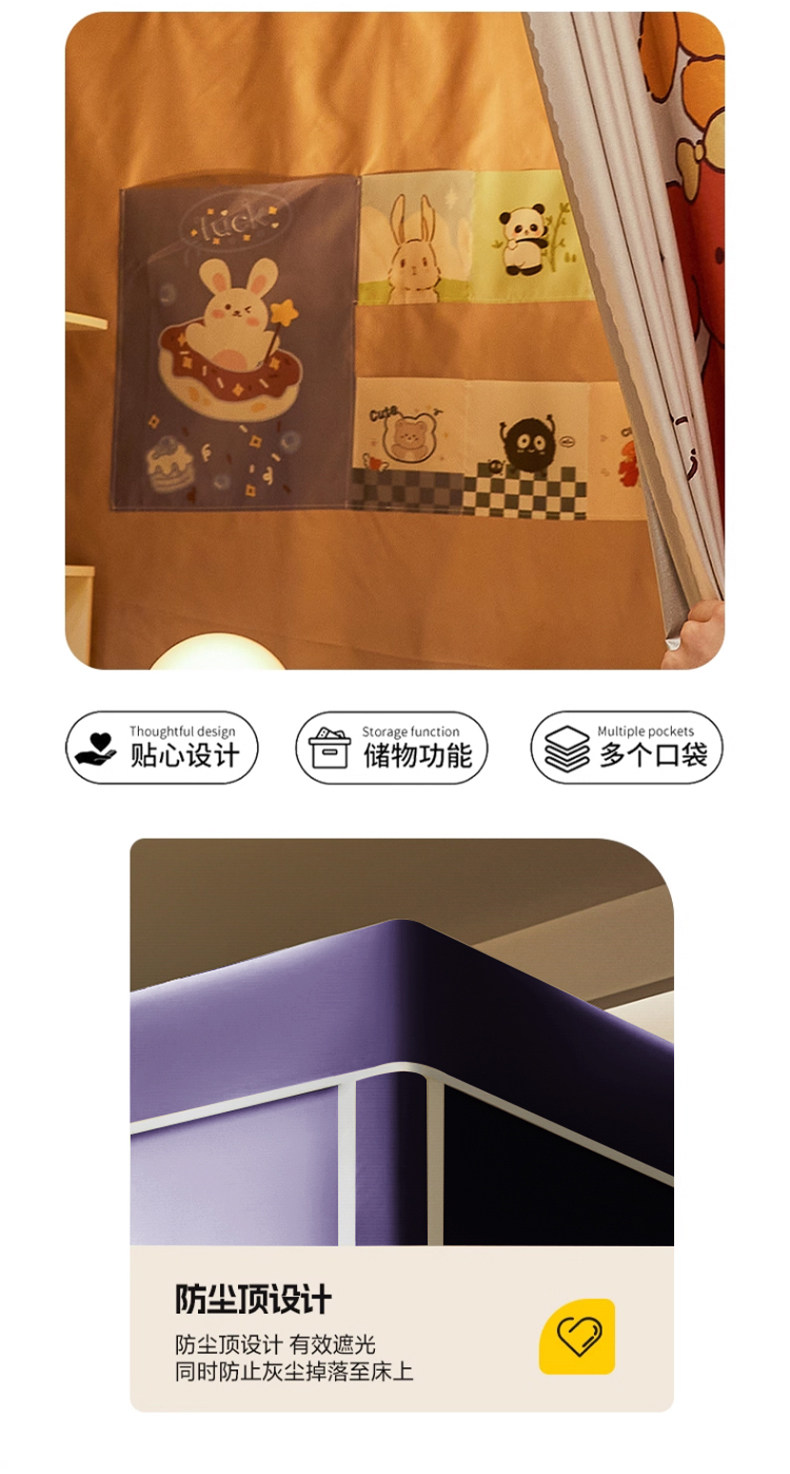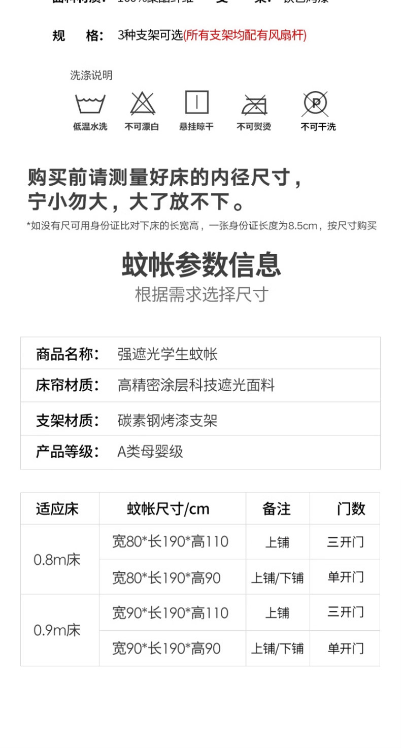| Applicable Bed Size | 0.8m Bed - Universal Single Door for Lower Bunk[Super Light-Blocking + No Splicing Bracket]80X190 Height 90cm,0.8m Bed - Upper Bed with Three High Doors[Super Light-Blocking + No Splicing Bracket]80X190 Height 110cm,0.9m Bed - Universal Single Door for Lower Bunk[Super Light-Blocking + No Splicing Bracket]90X190 Height 90cm,0.9m Bed - Upper Bed with Three High Doors[Super Light-Blocking + No Splicing Bracket]90X190 Height 110cm |