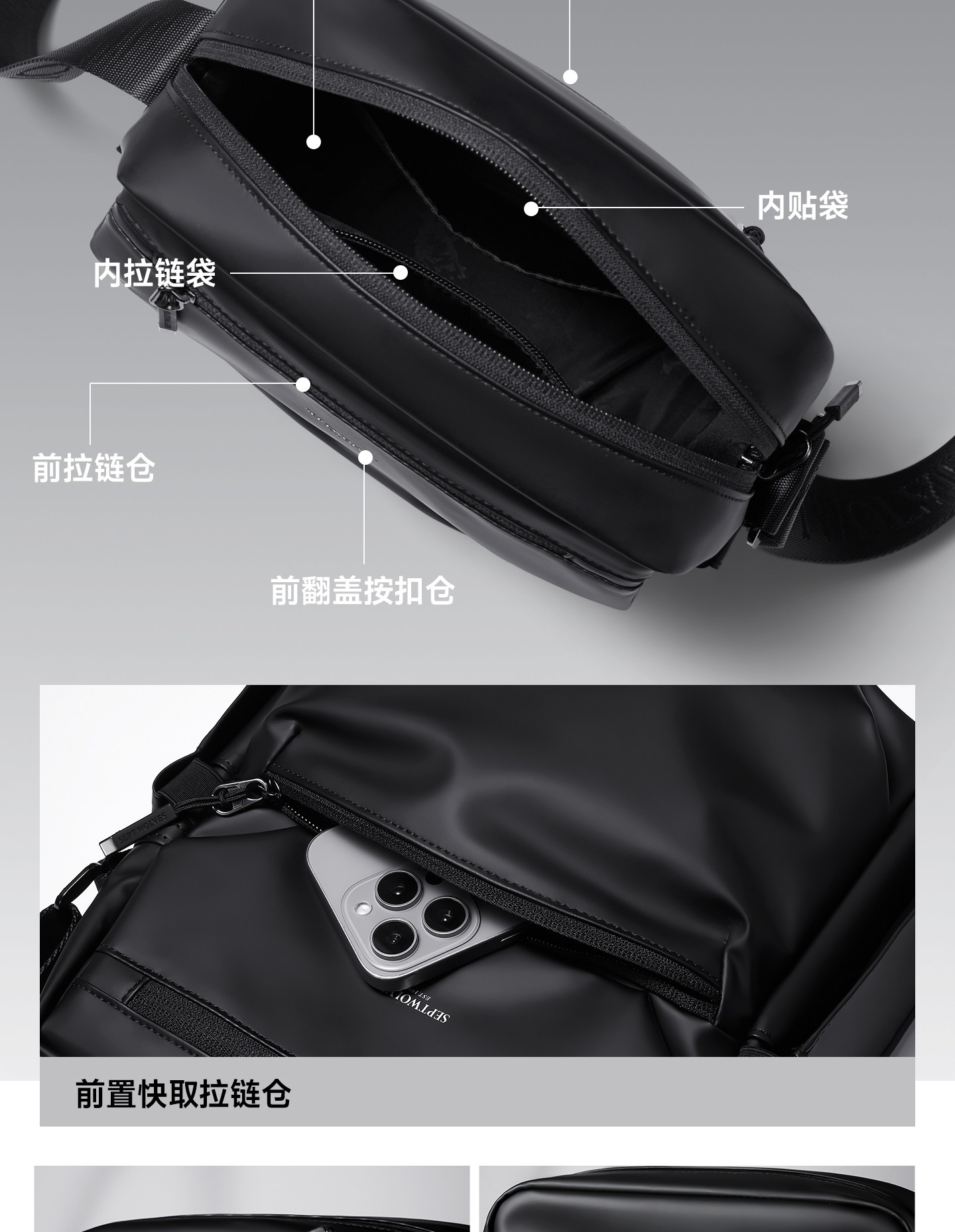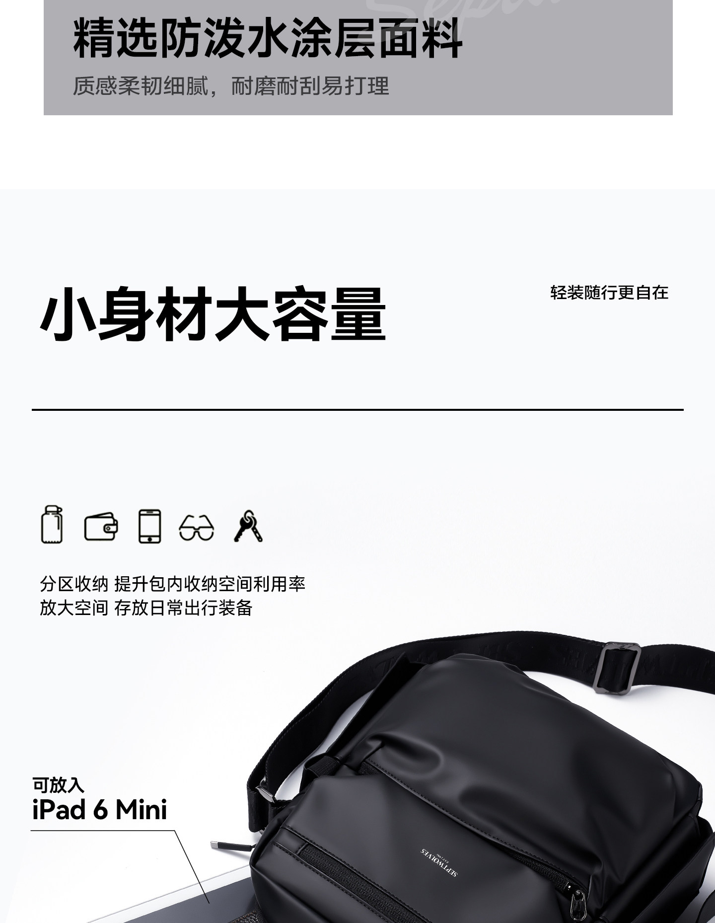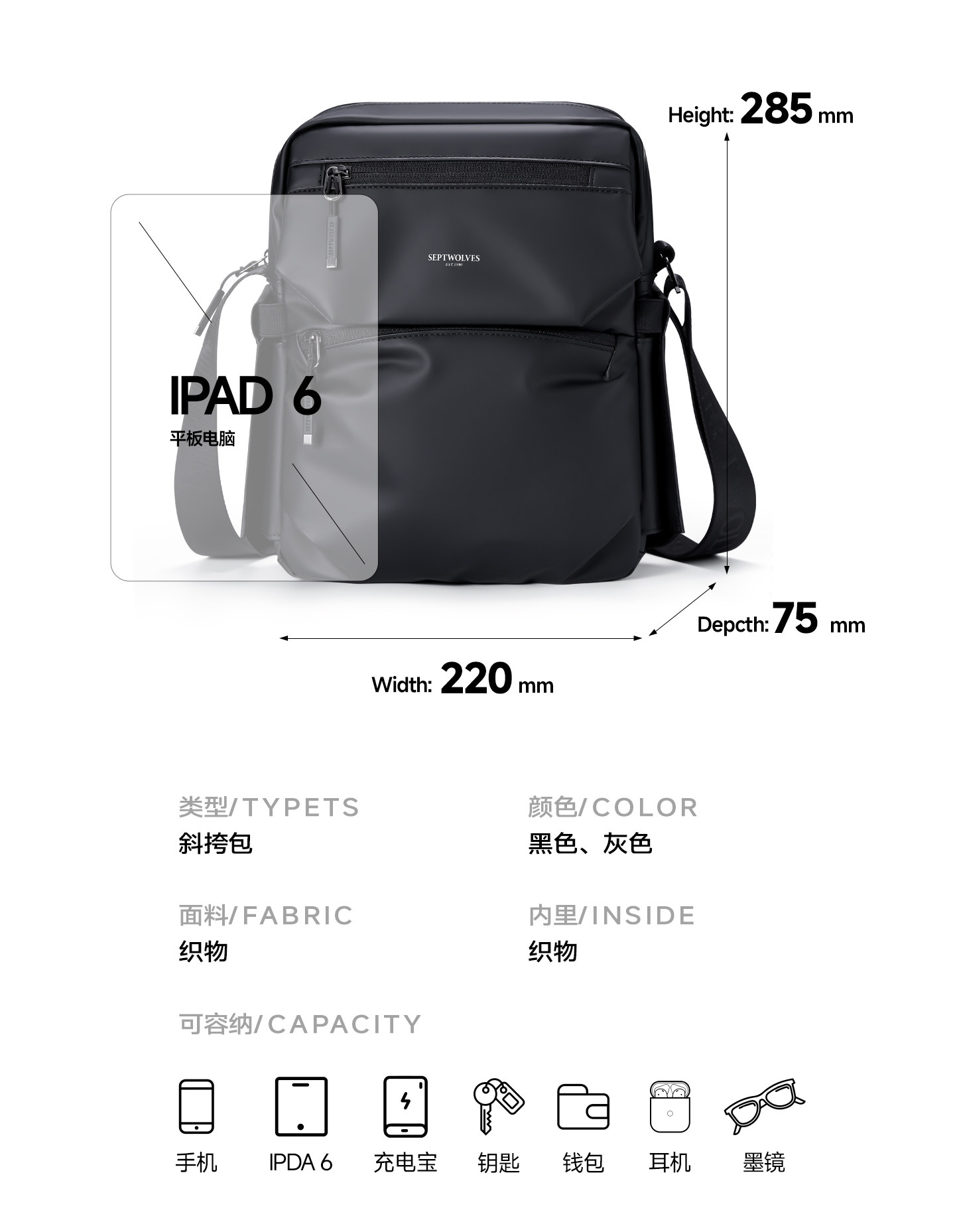 Septwolves Crossbody Bag Men's Shoulder Bag Casual Fashion Men's Bag Commuter Water-Repellent Large Capacity Shoulder Bag Men's Bag