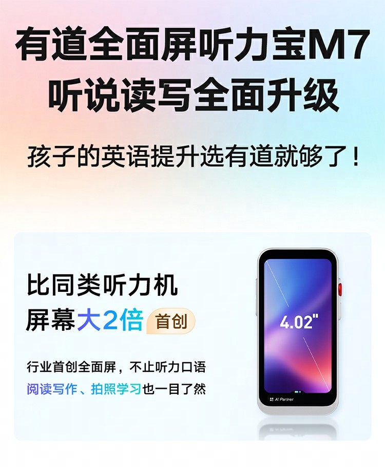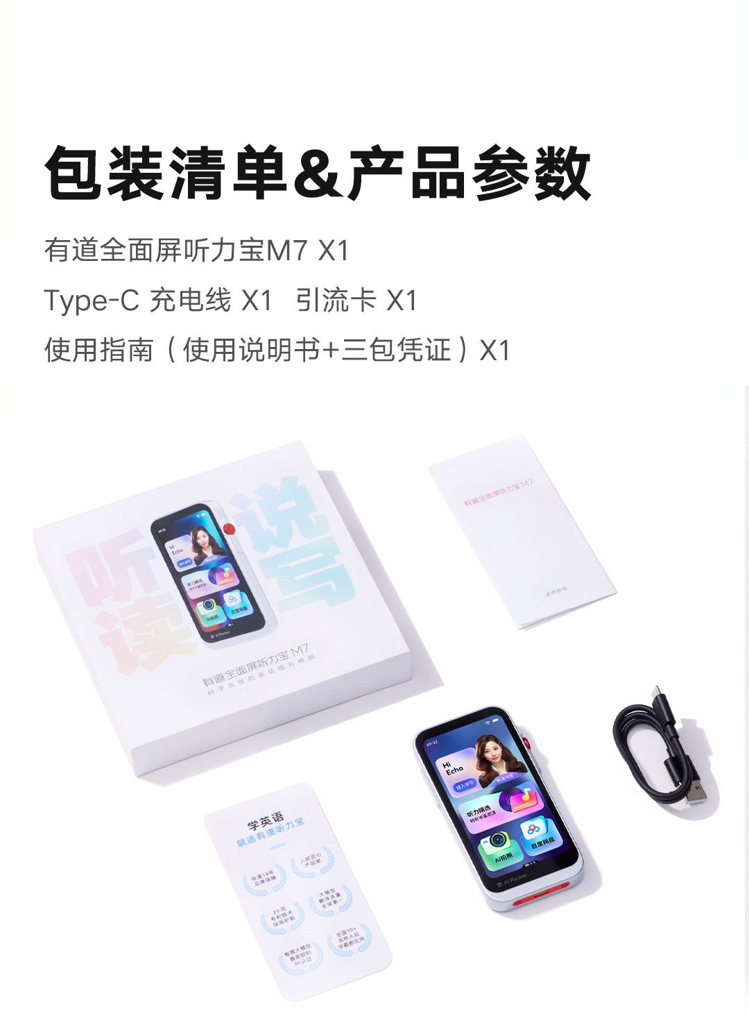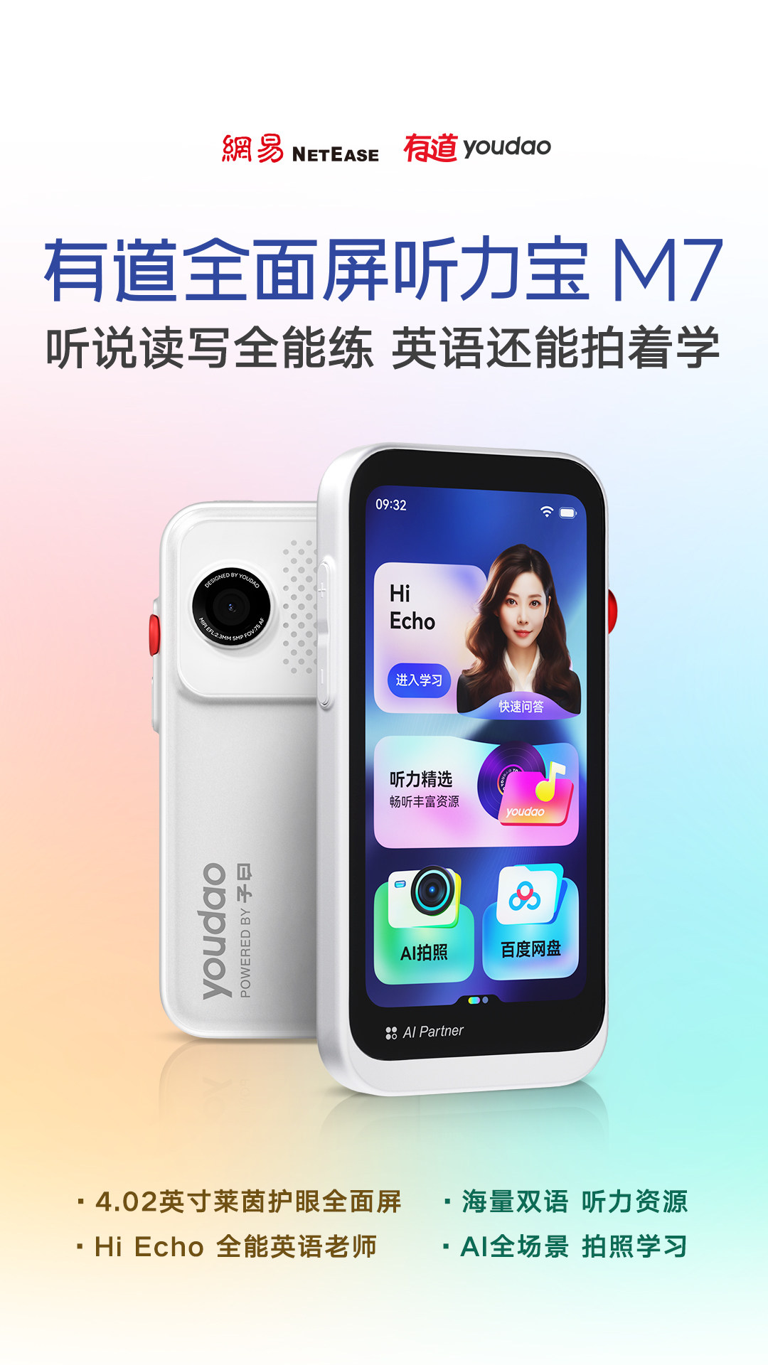 Netease Youdao Full-Screen Listening Device M7 English Repeater Ai English Device Children's Listening Practice Tool Portable English Listening and Speaking Device Listening Player Student-Specific Learning Machine for Primary, Middle, and High School Students