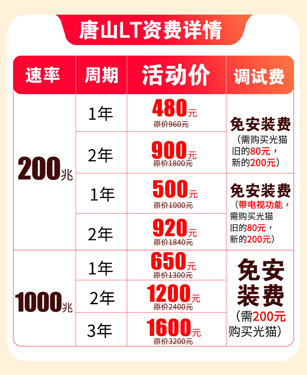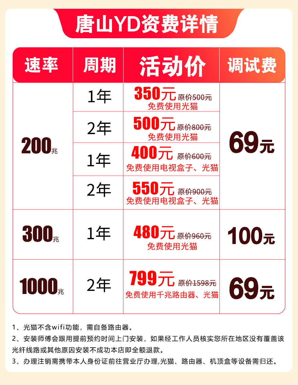 | Value-Added Services | Tangshan Broadband 1000m Fiber Optic Broadband Order Contact Customer Service,Tangshan Telecom Broadband [480 Yuan = 200 Megabytes/Year] Free Installation Fee,Tangshan Telecom Broadband [800 Yuan = 200 Megabytes/2 Years] Free Installation Fee,Tangshan Telecom Broadband [1101 Yuan = 200 Megabytes/3 Years] Free Installation Fee,Tangshan Telecom Broadband [620 Yuan = 1000 Megabytes/Year] Free Installation Fee,Telecom Broadband [1100 Yuan = 1000 Megabytes/2 Years] Free Installation Fee,Tangshan Telecom Broadband [1395 Yuan = 1000 Megabytes/3 Years],Telecom Broadband [1395 Yuan = 1000 Megabytes/3 Years] Free Installation Fee,Tangshan Lt Broadband [480 Yuan = 200 Megabytes/Year] Free Installation Fee,Tangshan Lt Broadband [900 Yuan = 200 Megabytes/2 Years] Free Installation Fee,Tangshan Lt Broadband [500 Yuan = 200 Megabytes/Year] Free Installation,Tangshan Lt Broadband [920 Yuan = 200 Megabytes/2 Years] Free Installation Fee,Tangshan Lt Broadband [600 Yuan = 600 Megabytes/Year] Free Installation Fee,Tangshan Lt Broadband [1150 Yuan = 600 Megabytes/Two Years] Free Installation Fee,Tangshan Lt Broadband [1500 Yuan = 600 Megabytes/Three Years] Free Installation Fee,Tangshan Lt Broadband [650 Yuan = 1000 Megabytes/Year] Free Installation,Tangshan Lt Broadband [1200 Yuan = 1000 Megabytes/2 Years] Free Installation,Tangshan Lt Broadband [1600 Yuan = 1000 Megabytes/3 Years] Free Installation,Tangshan Yd Broadband [350 Yuan = 200 Megabytes/1 Year] Free to Use Optical Modem,Tangshan Yd Broadband [500 Yuan = 200 Mbit/S / 2 Years] - Free Optical Modem Included,Tangshan Yd Broadband: [¥400 = 200Mbps/Year] Includes Free Optical Modem + Free Tv Box,Tangshan Yd Broadband [¥550 = 200Mbps/2 Years] - Free Optical Modem + Free Tv Box Included,Tangshan Yd Broadband [480 Yuan = 300 Mbps/Year] - Free Optical Modem Included,Tangshan Yd Broadband [799 Yuan = 1000 Mbps/2 Years] - Free Optical Modem + Free Gigabit Router Included |