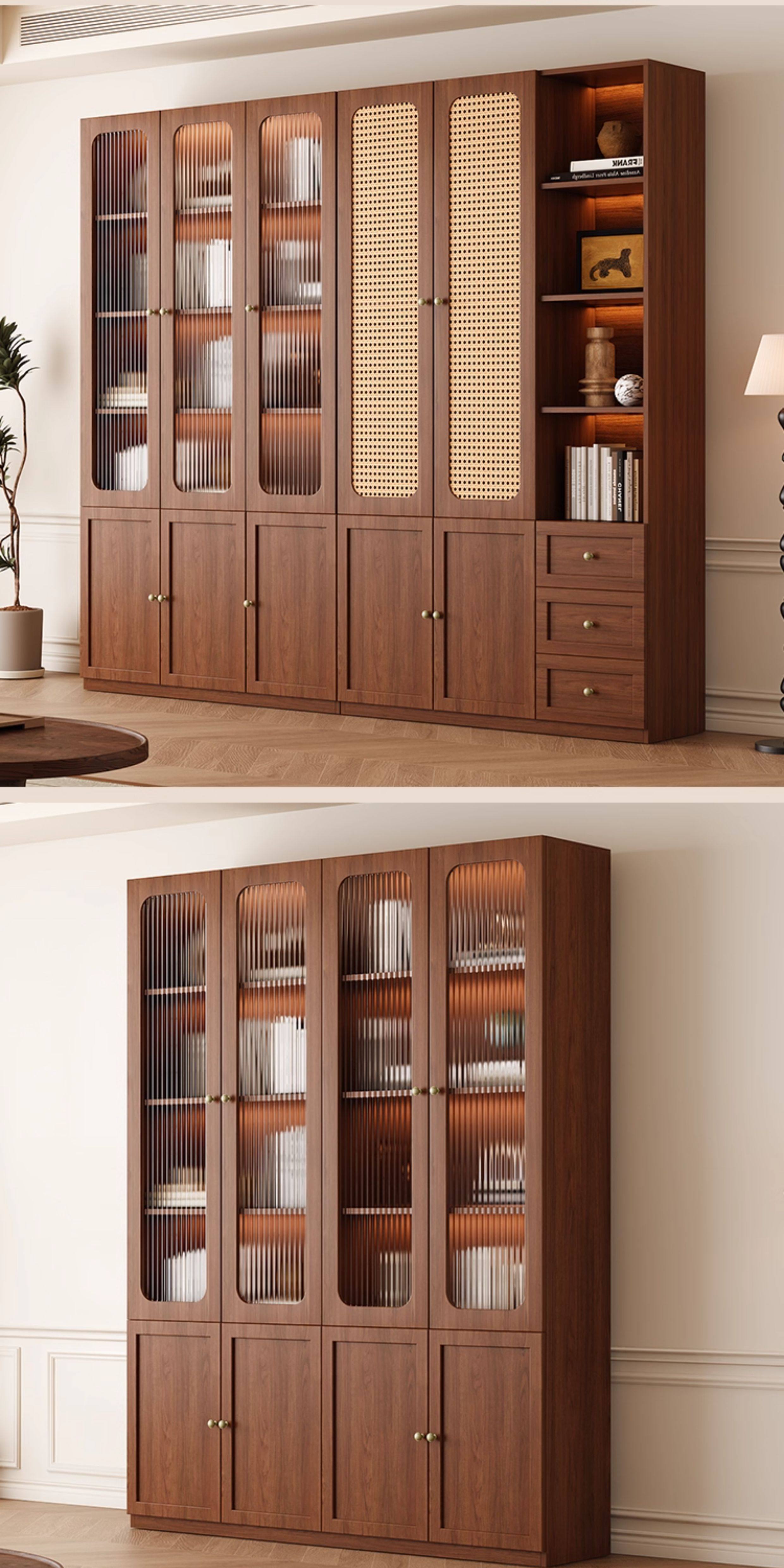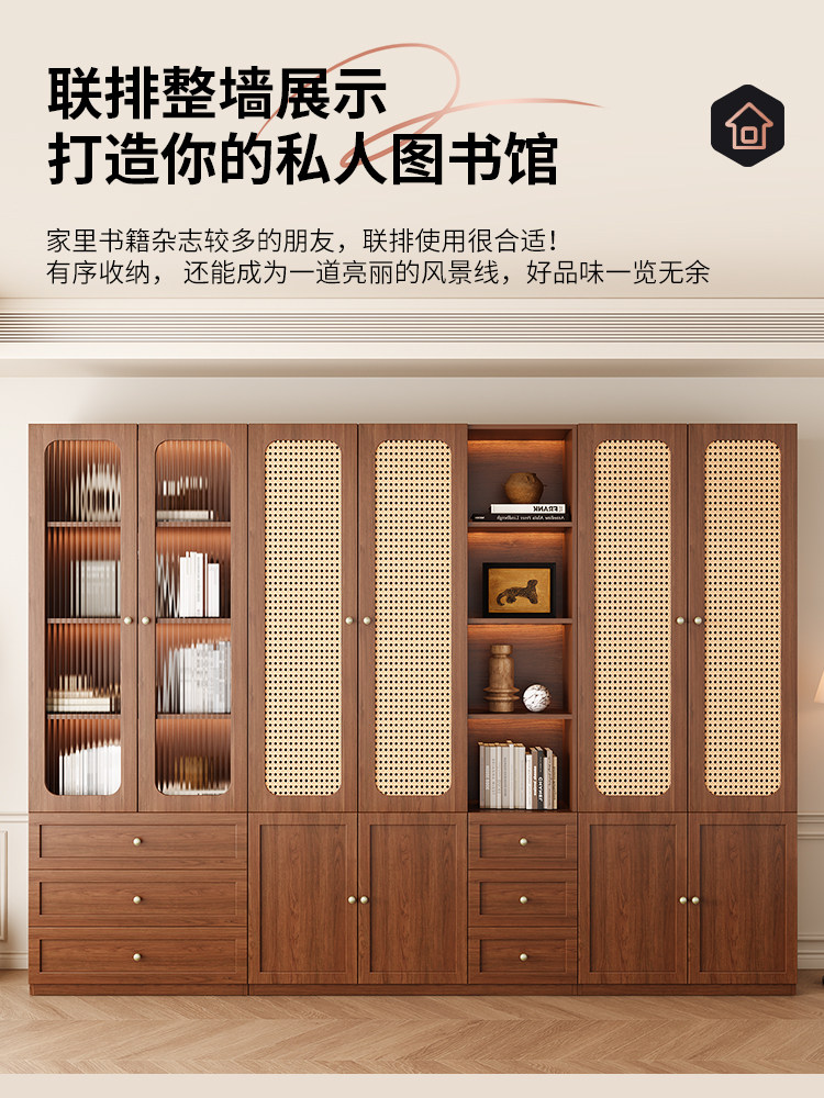 Rattan Bookcase with Vintage Style, Antique Glass Door, Integrated Wine Cabinet, Full Wall-To-Ceiling Storage, Living Room Wall-Mounted Bookshelf
