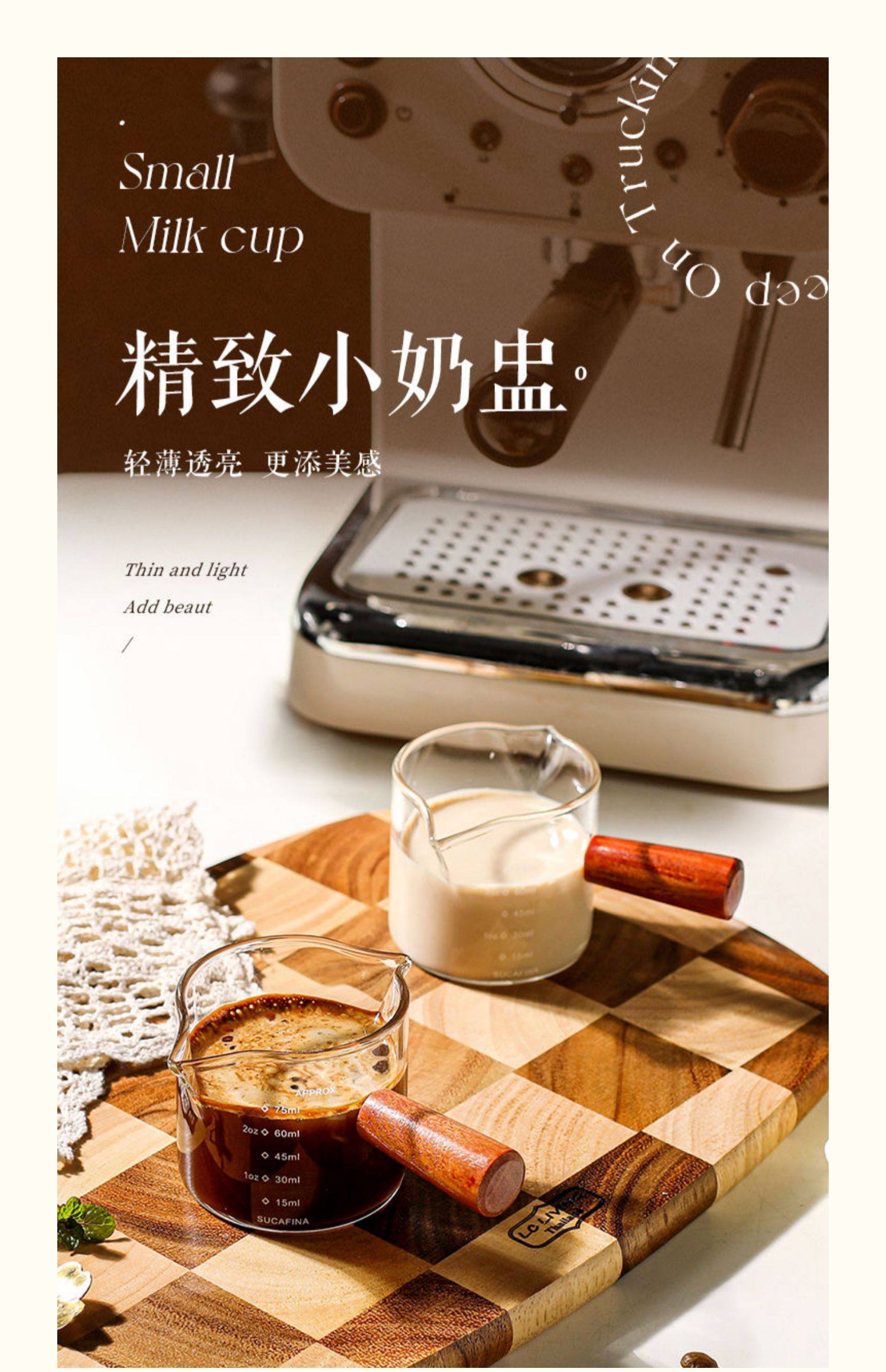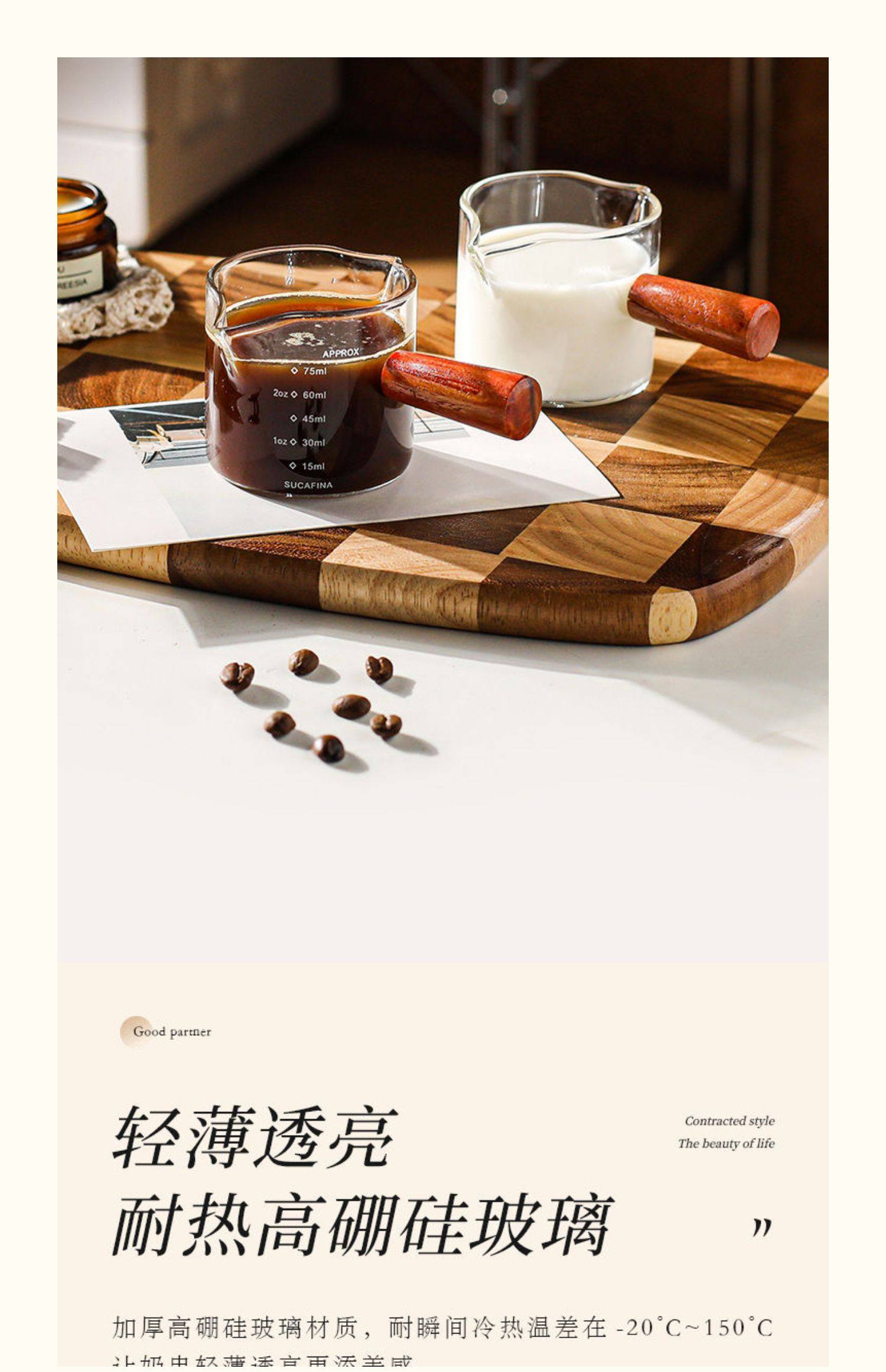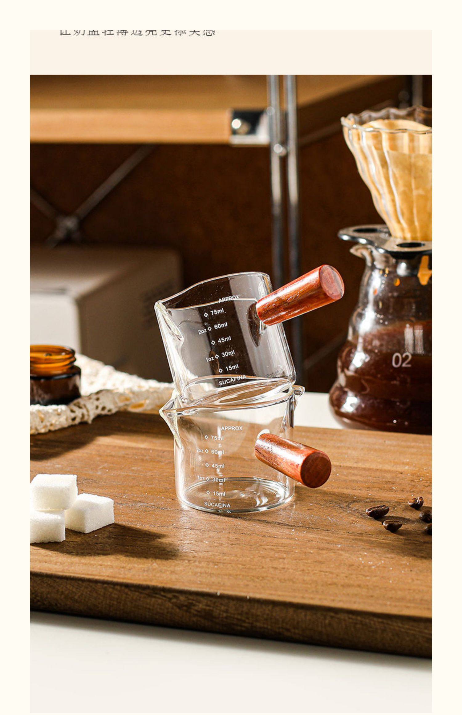 Shot Glass Double Spout Ounce Cup Glass Milk Jug Wooden Handle Measuring Cup with Scale Milk Jug Double Spout Espresso Ounce
