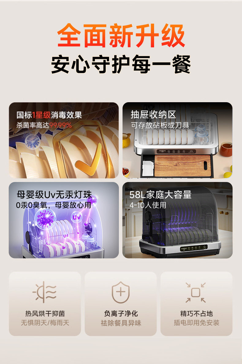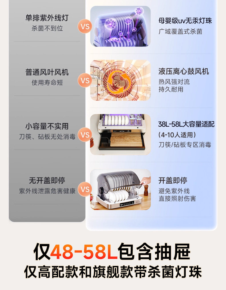 | Color Classification | 38L Standard Edition: Pasteurized High-Temperature Sterilization + Drying & Drain-Free Function + Stainless Steel Shelves (No Uv Light),38L Premium Edition: Uv Sterilization + Pasteurization + Drying & Drain-Free + Stainless Steel Shelves,38L Flagship Version: Mercury-Free Lamp Beads Sterilization + Pasteurization + No Draining + Stainless Steel Shelf + Negative Ions,48L Premium Edition: Uv Sterilization + Storage Drawer + Pasteurized High-Temperature Drying + Drain-Free Design + Stainless Steel Shelves,48L Flagship Version: Mercury-Free Lamp Beads + Storage Drawer + Pasteurization + No Draining + Stainless Steel Shelf + Negative Ions,58L Premium Edition: Uv Sterilization + Storage Drawer + Pasteurized High-Temperature Drying + Drain-Free Design + Stainless Steel Shelves,58L Flagship Version: Mercury-Free Lamp Beads + Storage Drawer + Pasteurization + No Draining + Stainless Steel Shelf + Negative Ions,38L Standard Edition: Pasteurized High-Temperature Sterilization + Drying & Drain-Free Function + Stainless Steel Shelves (No Uv Light),38L Standard Edition: (Pasteurized High-Temperature Sterilization + Drying & Drain-Free + Stainless Steel Shelves) - No Uv Light |