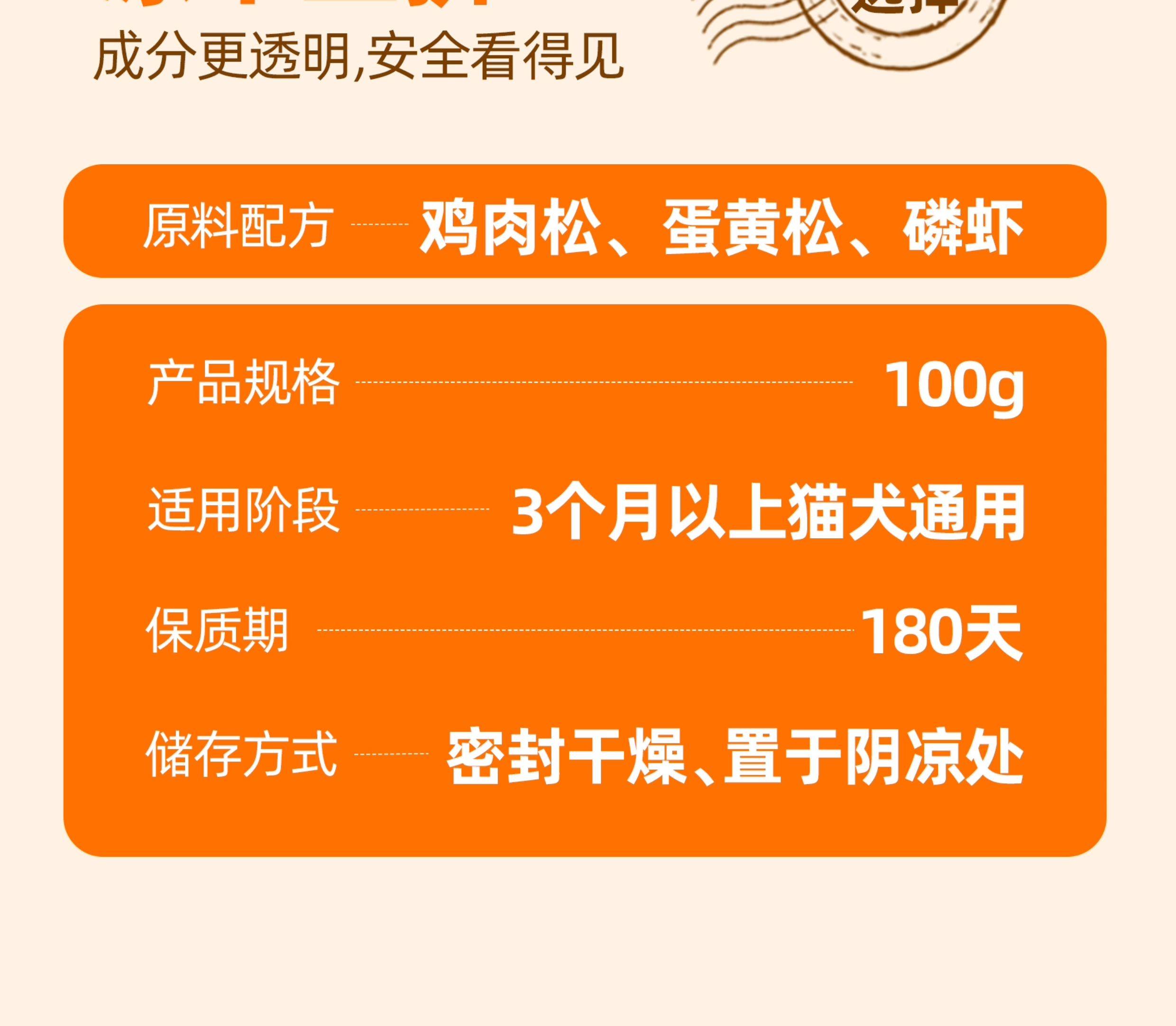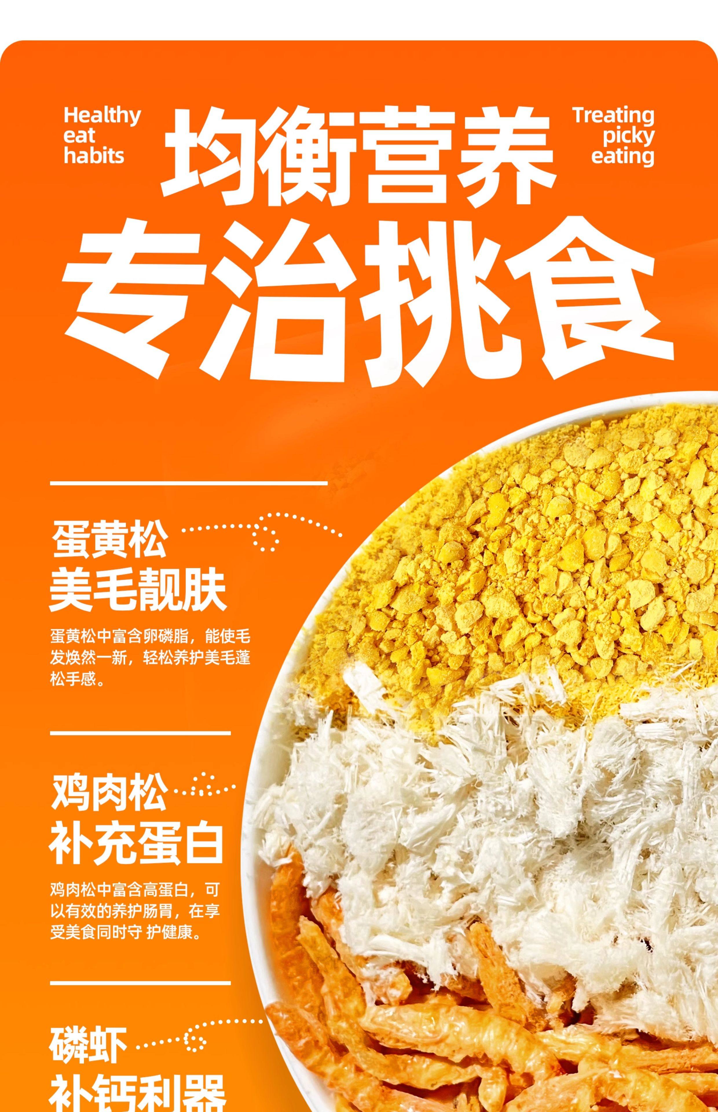 | Food Taste | ā ā Free Trial, Refundable if Not Eatenā ā ,ā Guarantee: Visible Chicken, Krill, Egg Yolk,[Can Be Mixed with Food 2.5kg]Egg Yolk Krill Chicken Floss 50g (Can Be Eaten for a Monthļ¼ļ¼,[Can Be Mixed with Food 5kg]Egg Yolk Krill Chicken Floss 50g Free 50GĀ·100G in Total (Picky Eater Nemesis),[Can Be Mixed with Food 10kg]Egg Yolk Krill Chicken Floss 100g Free 100GĀ·Total 200g (Picky Eater Nemesis),[Can Be Mixed with Food 20kg]Egg Yolk Krill Chicken Floss 200g Free 200GĀ·Total 400g (Picky Eater Nemesis),[Can Be Mixed with Food 40kg]Egg Yolk Krill Chicken Floss 400g Free 400GĀ·Total 800g (Picky Eater Nemesis) |