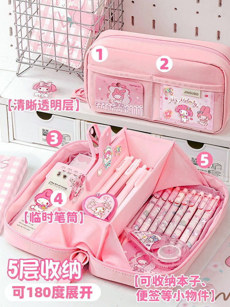 My Melody 5-Layer Extra-Large Capacity Pencil Case for Girls, Stationery Box for Female Elementary School Students, 2025 New Model Pencil Case for Middle School Students, High Aesthetic Value, Comes with Sanrio Kuromi Stickers, Transparent Girl Version