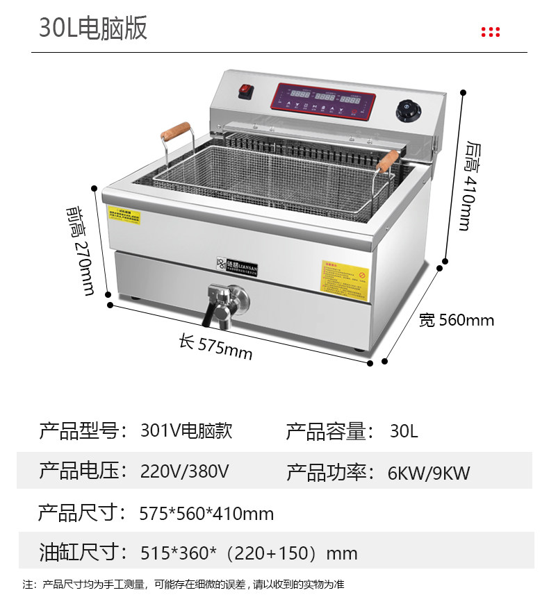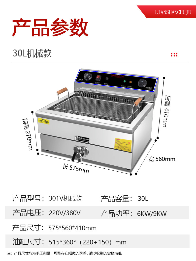 | Color Classification | (301V Mechanical Model) Desktop Large Capacity 30 Liters-220-6Kw,(301V Mechanical Model) Desktop Large Capacity 30 Liters-380-9Kw,(301V Computer Model) Desktop Large Capacity 30 Liters-220-6Kw,(301V Computer Model) Desktop Large Capacity 30 Liters-380-9Kw,(301V Mechanical Model) Desktop Large Capacity 30 Liters-220-6Kw (with Oil Return Pan),(301V Mechanical Model) Desktop Large Capacity 30 Liters-380-9Kw (with Oil Return Plate),(301V Computer Model) Desktop Large Capacity 30 Liters-220-6Kw (with Oil Return Pan),(301V Computer Model) Desktop Large Capacity 30 Liters-380-9Kw (with Oil Return Pan),904E Double Cylinder Four Screen Computer Version Fryer 220V/4.5Kw+4.5Kw,904E Double Cylinder Four Screen Computer Version Fryer 380V/6.6Kw+6.6Kw |