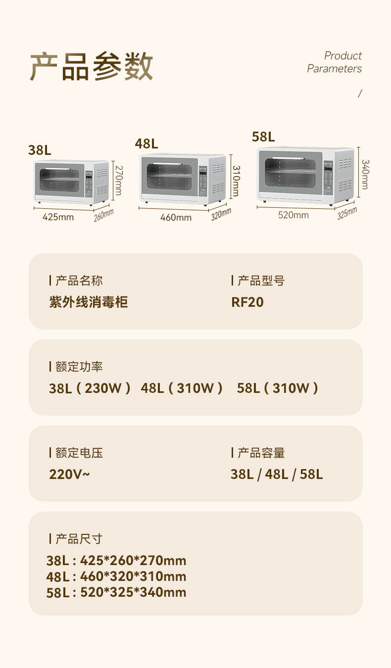 | Color Classification | [38L Upgraded Model] Two-Star Philips Ultraviolet Sterilization [Sterilization + Drying + 0 Ozone],[38L Luxury Model] Two-Star Ultraviolet Mercury-Free Lamp Beads + Drying + 24H Sterile Storage,【48L Premium】Two-Star Rated • Uv-C Mercury-Free Lamp Beads + Drying Function + 24H Sterile Storage,【58L Premium】Two-Star Rated • Uv-C Mercury-Free Lamp Beads + Drying Function + 24H Sterile Storage,【38L Flagship Model】 Two-Star Rated • Mother & Baby Grade Uvc Mercury-Free Lamp Beads + Drying Function + Sterilized Storage + Negative Ion Technology,【48L Flagship Model】Two-Star Rated · Mother & Baby Grade Uvc Mercury-Free Lamp Beads + Drying Function + Sterilized Storage + Negative Ion Technology,【58L Flagship Model】Two-Star Rated • Mother & Baby Grade Uvc Mercury-Free Lamp Beads + Drying Function + Sterilized Storage + Negative Ion Technology,[38L Temperature Adjustment Model] Two-Star·100°Adjustable Temperature + Maternal and Infant Grade Uvc Mercury-Free Lamp Beads + 72 H Storage + Negative Ions,[48L Temperature Adjustment Model] Two-Star·100°Adjustable Temperature + Maternal and Infant Grade Uvc Mercury-Free Lamp Beads + 72H Storage + Negative Ions,[58L Temperature Adjustment Model] Two-Star·100°Adjustable Temperature + Maternal and Infant Grade Uvc Mercury-Free Lamp Beads + 72H Storage + Negative Ions,[10L Mini Model] Small Capacity·Philips Ultraviolet Sterilization [Sterilization + Drying + 0 Ozone],[38L Upgraded Model] Two-Star Philips Ultraviolet Sterilization [Sterilization + Drying + 0 Ozone],[10L Mini Model] Small Capacity·Philips Ultraviolet Sterilization [Sterilization + Drying + 0 Ozone],【38L Premium Model】 Two-Star Rated • Uv-C Mercury-Free Lamp Beads + Drying Function + 24H Sterile Storage,【38L Premium】Two-Star Rated • Uv Mercury-Free Lamps + Drying Function + 24H Sterilization |