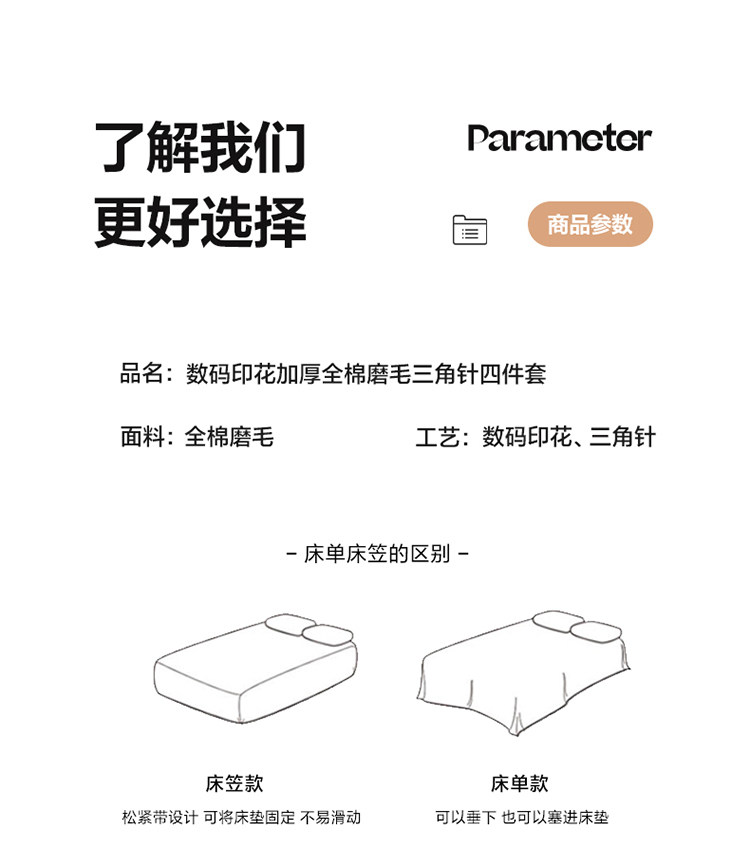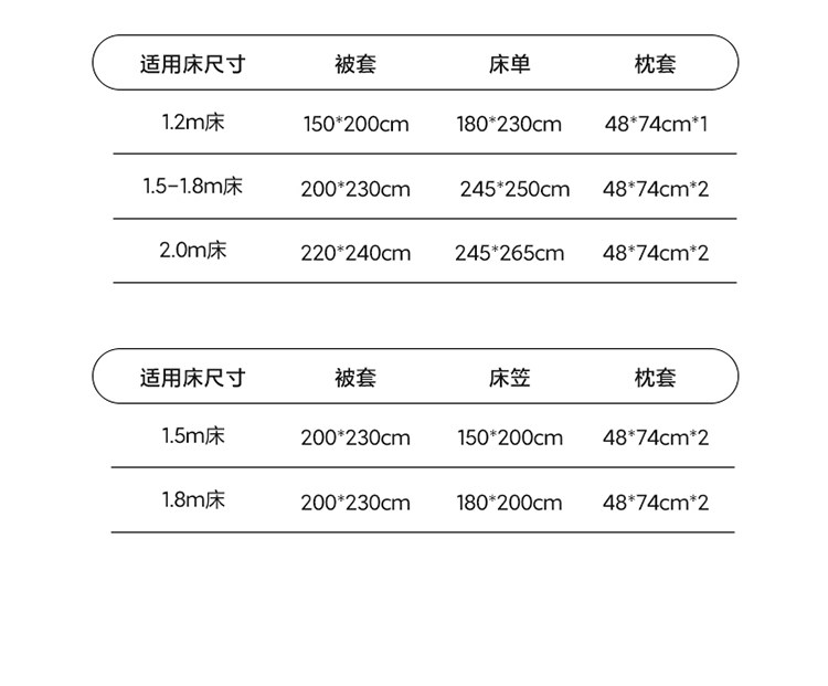 | Applicable Bed Size | 1.2m Bed [Three-Piece Bed Sheet Set] Suitable for 150*200cm Quilt Core,1.5m Bed [Sheet Set of Four] Suitable for 200*230cm Quilt Core,1.8m Bed [Sheet Set of Four] Suitable for 200*230cm Quilt Core,2.0m Bed [Sheet Set of Four] Suitable for 220*240cm Quilt Core,1.5m Bed [Four-Piece Fitted Sheet Set] Suitable for 200*230cm Quilt Core,1.8m Bed [Four-Piece Fitted Sheet Set] Suitable for 200*230cm Quilt Core |