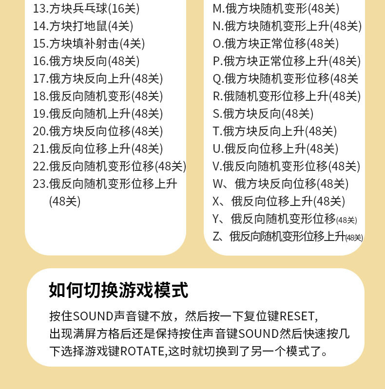 | Color Classification | 5inch Extra Large Screen Vertical Screen Blue[Dual Mode Gameplay]Rechargeable Model,5inch Extra Large Screen Vertical Screen Green[Dual Mode Gameplay]Rechargeable Model,5inch Extra Large Screen Vertical Screen Red[Dual Mode Gameplay]Rechargeable Model,5inch Extra Large Screen Vertical Screen Silver[Dual Mode Gameplay]Rechargeable Model,5inch Extra Large Screen Vertical Screen Black[Dual Mode Gameplay]Rechargeable Model,5inch Extra Large Screen Vertical Screen Blue[Dual Mode Gameplay]Battery Model,5inch Extra Large Screen Vertical Screen Silver[Dual Mode Gameplay]Battery Model,5inch Extra Large Screen Vertical Screen Green[Dual Mode Gameplay]Battery Model,5inch Extra Large Screen Vertical Screen Red[Dual Mode Gameplay]Battery Model,5inch Extra Large Screen Vertical Screen Black[Dual Mode Gameplay]Battery Model,5inch Extra Large Screen Horizontal Blue[Dual Mode Gaming]Rechargeable Model,5inch Extra Large Screen Horizontal Screen Green[Dual Mode Gaming]Rechargeable Model,5inch Extra Large Screen Horizontal Screen Orange[Dual Mode Gaming]Rechargeable Model,5inch Extra Large Screen Horizontal Khaki Color[Dual Mode Gaming]Rechargeable Model,5inch Extra Large Screen Horizontal Blue[Dual Mode Gameplay]Battery Model,5inch Extra Large Screen Horizontal Screen Green[Dual Mode Gameplay]Battery Model,5inch Extra Large Screen Horizontal Khaki Color[Dual Mode Gameplay]Battery Model,5inch Extra Large Screen Horizontal Screen Orange[Dual Mode Gameplay]Battery Model,4.1inch Blue Light Large Screen Charging Model Blue[Dual Power Supply Mode],4.1inch Blu-Ray Large Screen Charging Model Red[Dual Power Supply Mode],4.1inch Blue Light Large Screen Charging Model Orange[Dual Power Supply Mode],4.1inch Blu-Ray Large Screen Charging Model Black[Dual Power Supply Mode],3.5inch Classic Large Screen Blue[Dual Mode Gameplay]Comes with Aa Batteries,3.Classic Large Screen Yellow[Dual Mode Gameplay]Comes with Aa Batteries,3.5inch Classic Large Screen Green[Dual Mode Gameplay]Comes with Aa Batteries,3.5inch Classic Large Screen Orange[Dual Mode Gameplay]Comes with Aa Batteries |