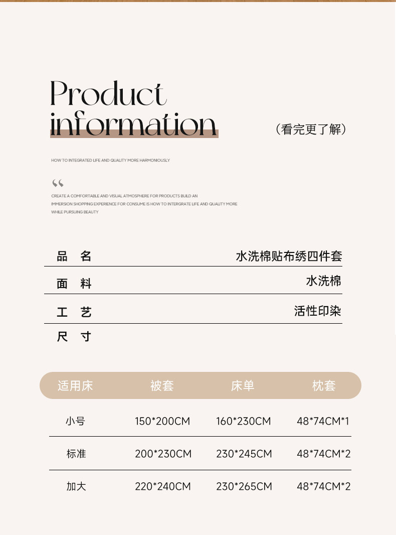 | Applicable Bed Size | 0.9m Bed[Three-Piece Bed Sheet Set]-Suitable for 150X200Cm Quilt Core,1.2m Bed[Three-Piece Bed Sheet Set]-Suitable for 150X200Cm Quilt Core,1.5m Bed[Four-Piece Bed Sheet Set]-Suitable for 200X230Cm Quilt Core,1.8m Bed[Four-Piece Bed Sheet Set]-Suitable for 200X230Cm Quilt Core,2.0m Bed[Four-Piece Bed Sheet Set]-Suitable for 220X240Cm Quilt Core,★0.9m Bed[Three-Piece Fitted Sheet Set]-Suitable for 150X200Cm Quilt Core,★1.5m Bed[Four-Piece Fitted Sheet Set]-Suitable for 200X230Cm Quilt Core,★1.8m Bed[Four-Piece Fitted Sheet Set]-Suitable for 200X230Cm Quilt Core |