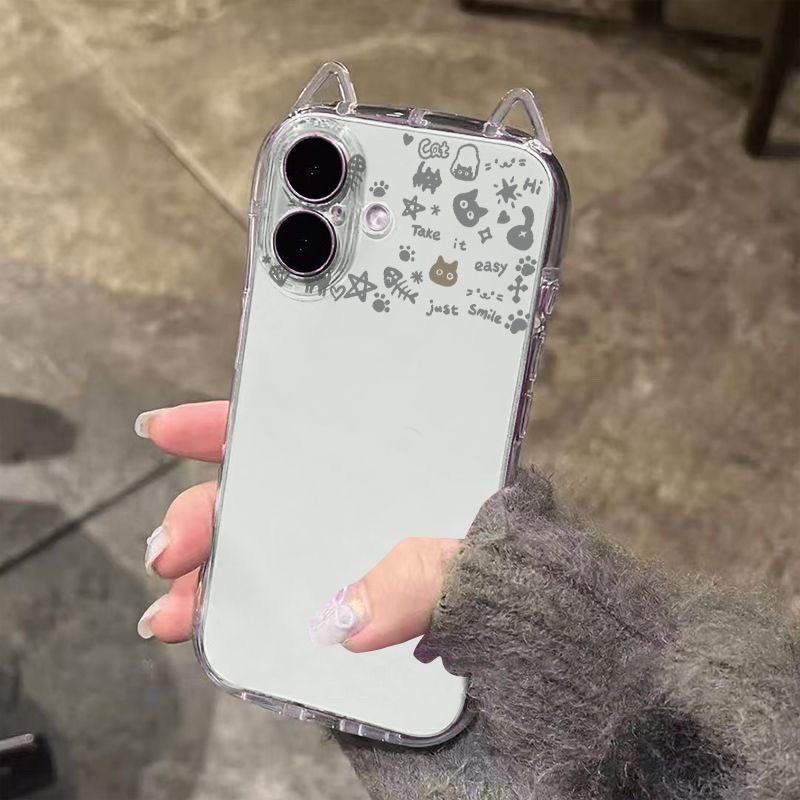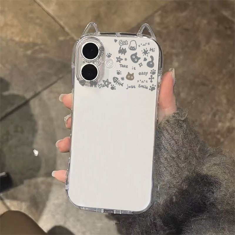 Transparent Cat Ears Cute Cat Doodle Suitable for Apple 17 Cat Ears Apple 17Pro Phone Case iPhone 15 Pro Max Simple Air Cushion