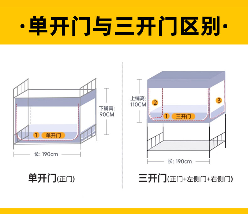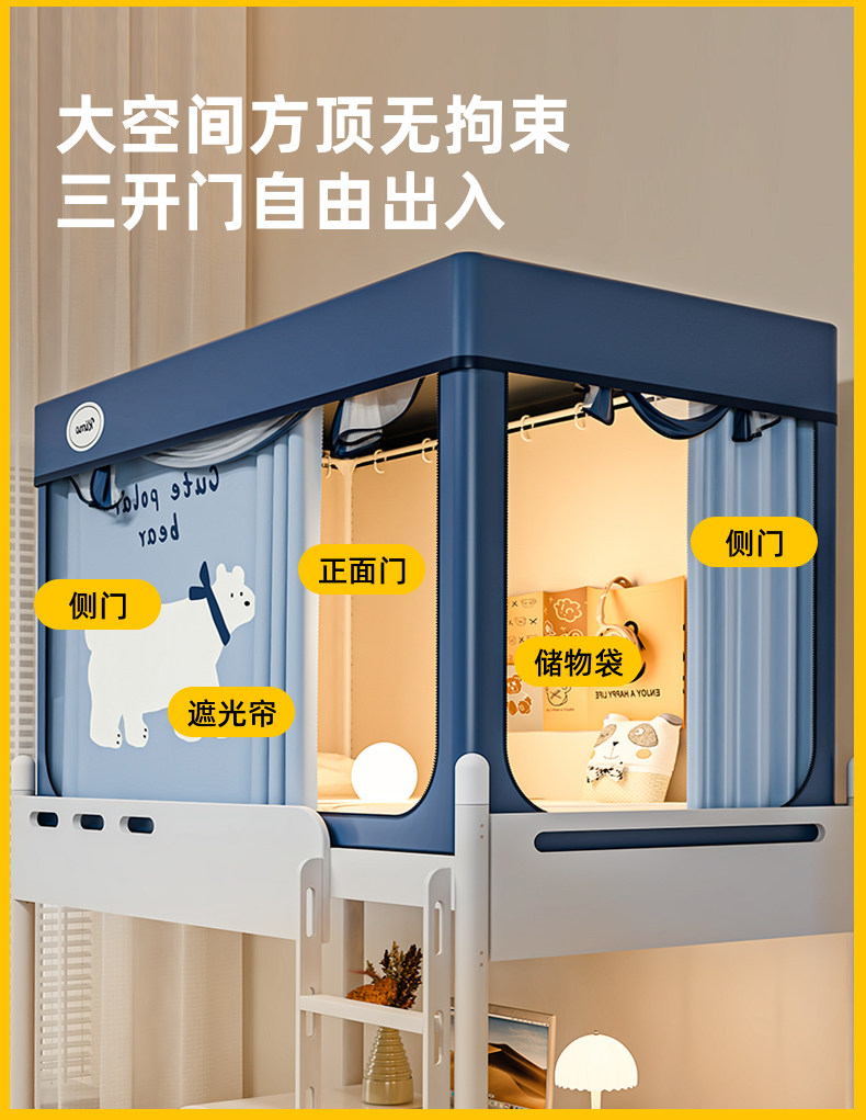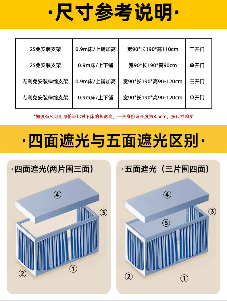| Applicable Bed Size | 0.9m Bed - Universal Single Door for Upper and Lower Bunks[2S Installation-Free Bracket, Ready to Use]Width 90Xlength 190Xh90Cm,0.9m Bed - Upper Bed with Three High Doors[2S Installation-Free Bracket, Ready to Use]Width 90Xlength 190Xh110Cm,0.9m Bed - Universal Single Door for Upper and Lower Bunks[Patented Installation-Free Bracket with Adjustable Height]Width 90Xlength 190Xh90~120Cm,0.9m Bed - Upper Bed with Three High Doors[Patented Installation-Free Bracket with Adjustable Height]Width 90Xlength 190Xh90~120Cm |