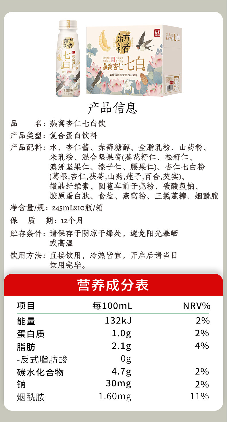 | Taste | [10 Bottles]Bird's Nest Almond Seven White Drink✅The Content of Compound Protein in Each Bottle Is ≥2.4g(≈2400mg),[245ml*10 Bottles]Bird's Nest Almond Seven White Drink✅,[245ml*20 Bottles]Bird's Nest Almond Seven White Drink✅,[245ml*30 Bottles]Bird's Nest Almond Seven White Drink✅ |