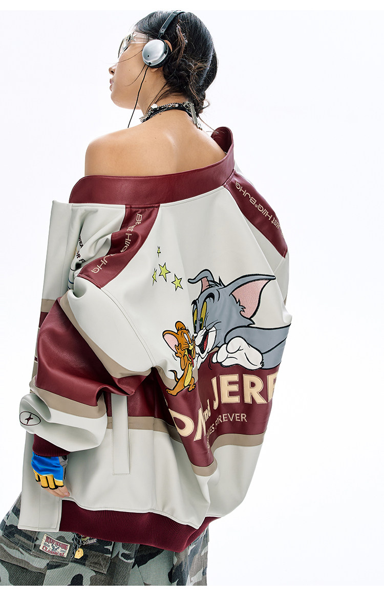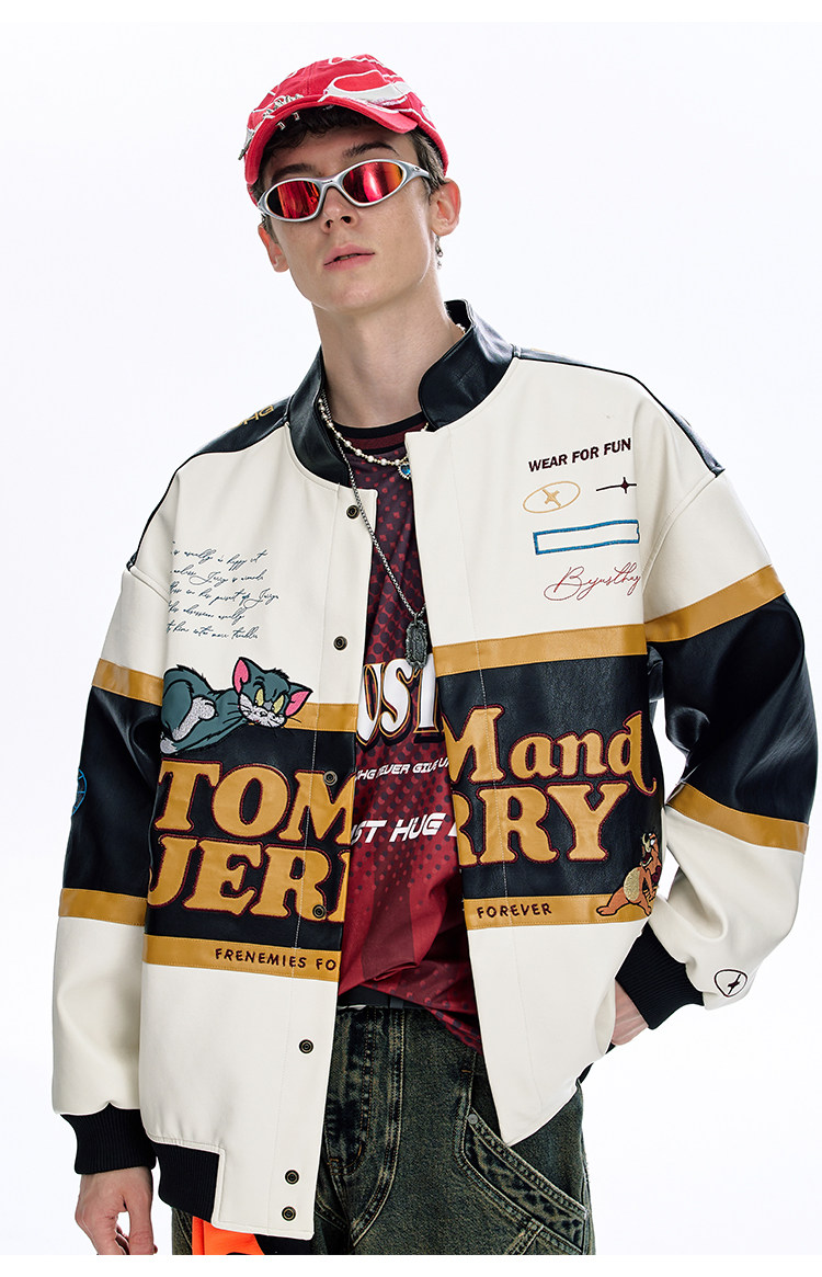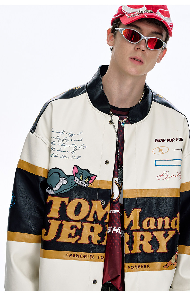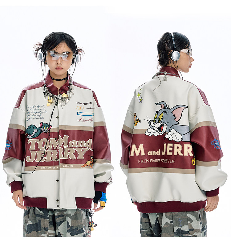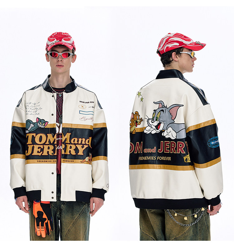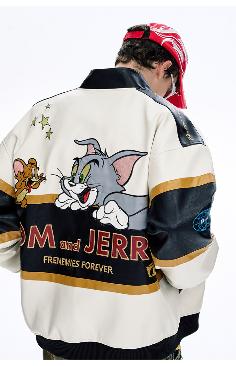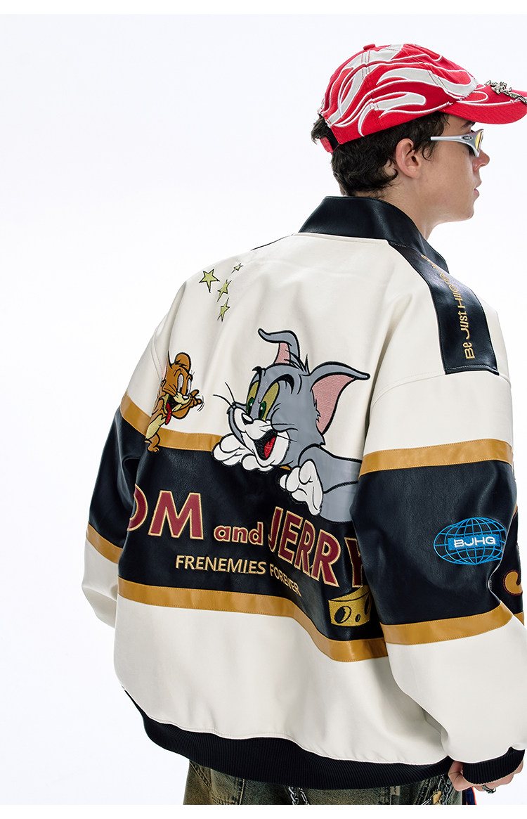 [Tom and Jerry Collaboration] Bjhg Reckless Vintage Leather Jacket for Men, Niche Racing Suit with Leather Inserts for Women