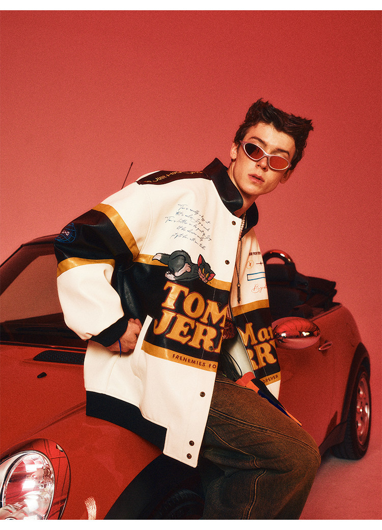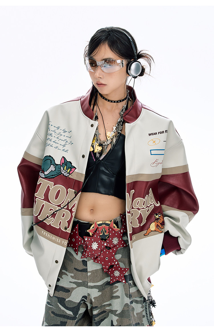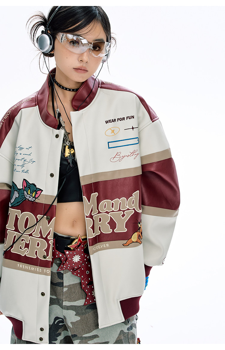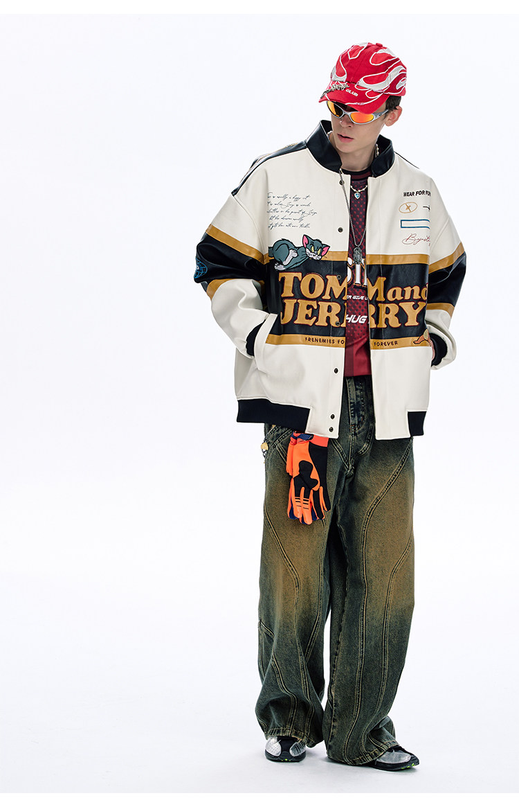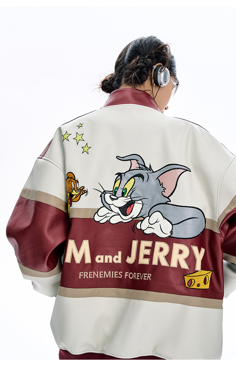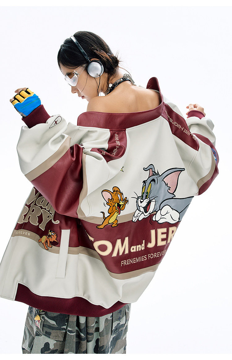 [Tom and Jerry Collaboration] Bjhg Reckless Vintage Leather Jacket for Men, Niche Racing Suit with Leather Inserts for Women