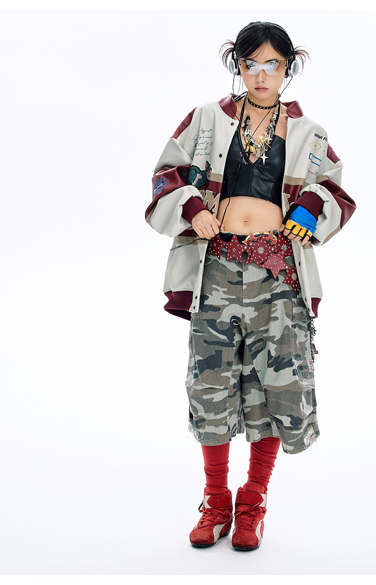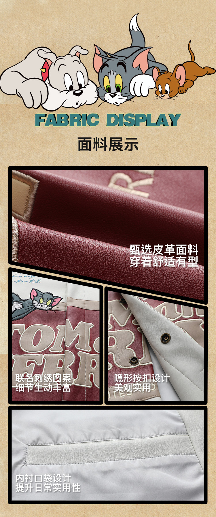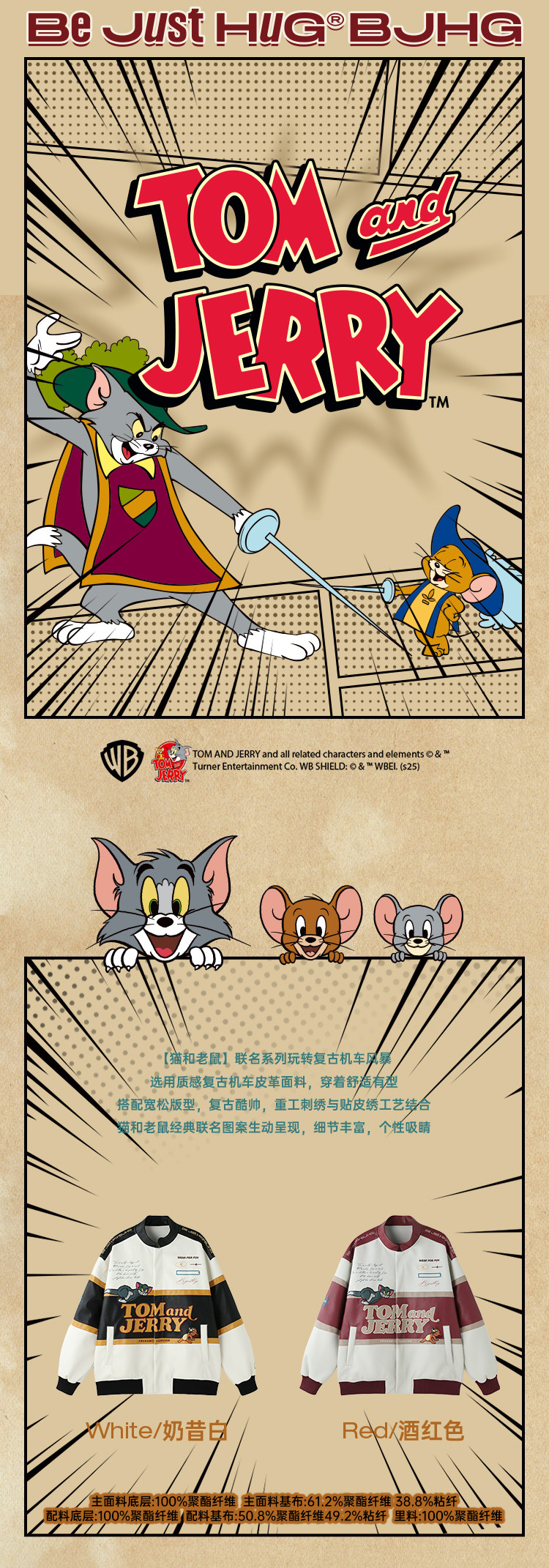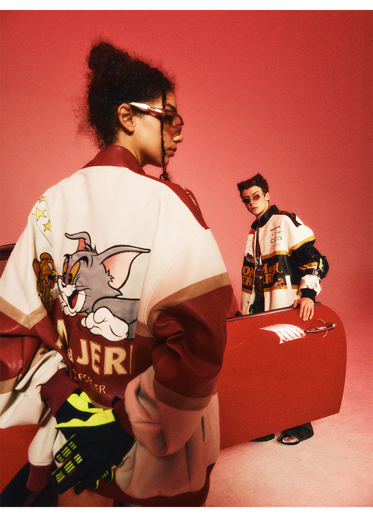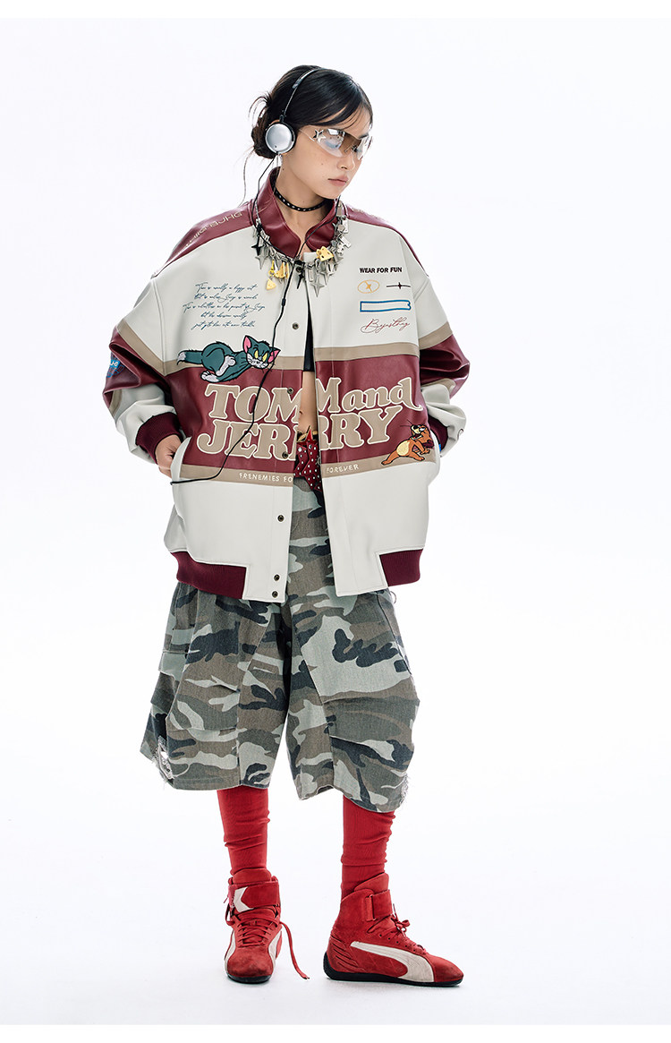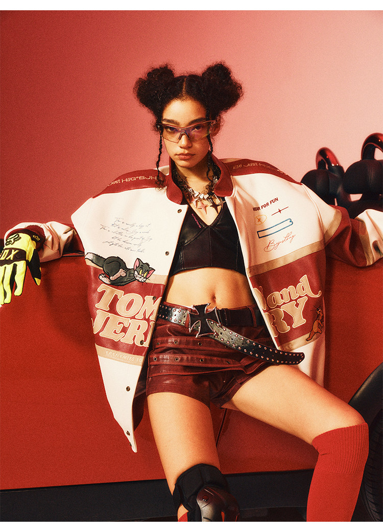 [Tom and Jerry Collaboration] Bjhg Reckless Vintage Leather Jacket for Men, Niche Racing Suit with Leather Inserts for Women