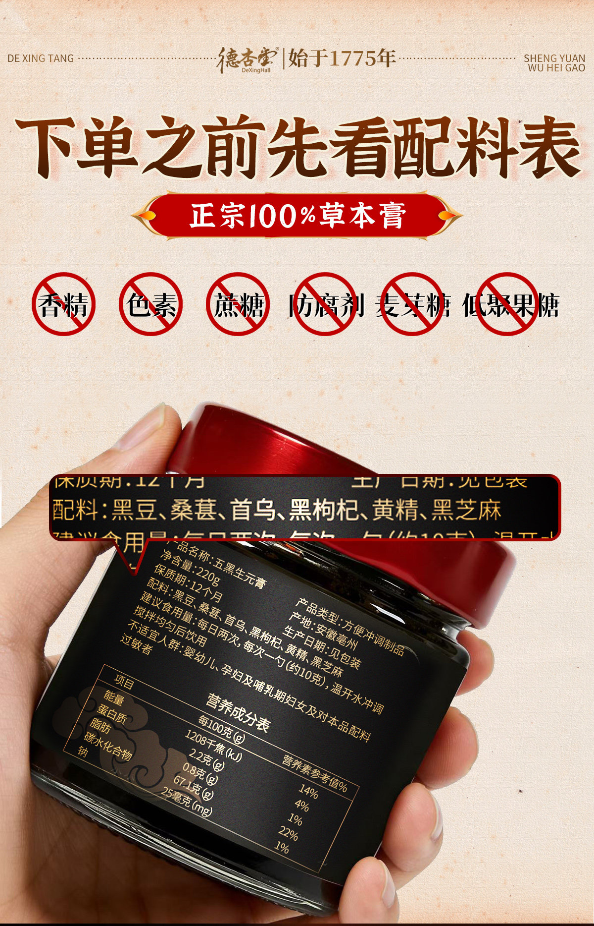 | Taste | ãTrial PackãRecommended: Buy the Monthly Pack,ã2-Bottle Trial PackãTraditional & Exquisite Herbal Paste,ã3-Bottle Monthly SupplyãDark Brown & Volumizing - Bestselling Product,ã5-Bottle Reinforcement PackãJoy Hair Black & Shiny - Protects Hairline,[Recommended for Those with Qi Deficiency and Blood Deficiency] Wuhei Ointment + Yuling Ointment,[Recommended for Those with Poor Sleep] Wuhei Paste + Jujube Kernel Paste,[Recommended for Those Who Are Wet, Fat and Weak] Wuhei Ointment + Fu Shi Ointment,ãChildcare PackageãBlack Cumin Paste + Hawthorn Paste |