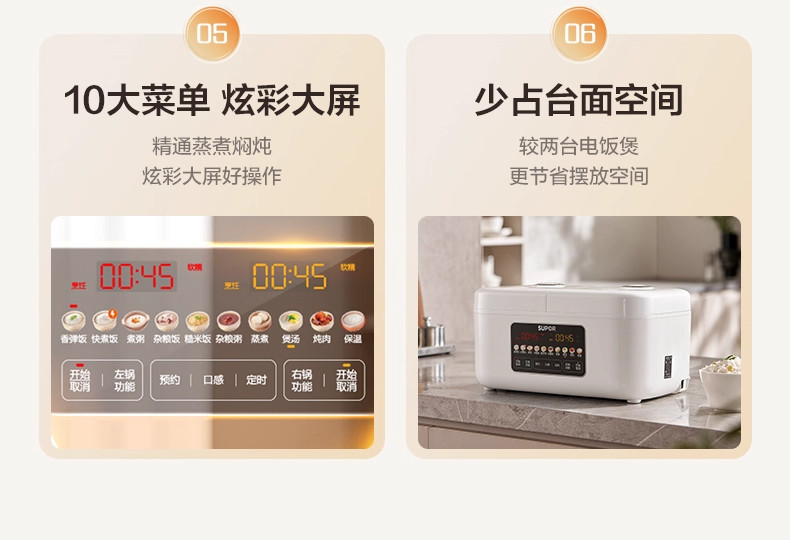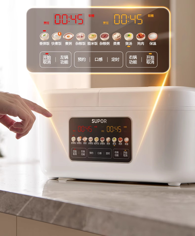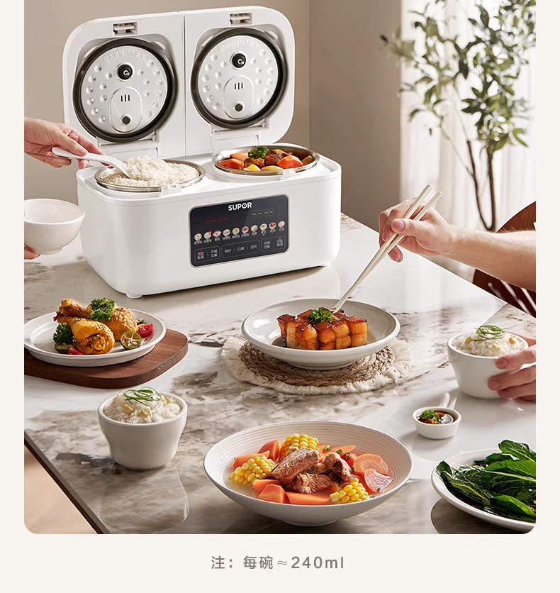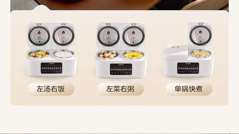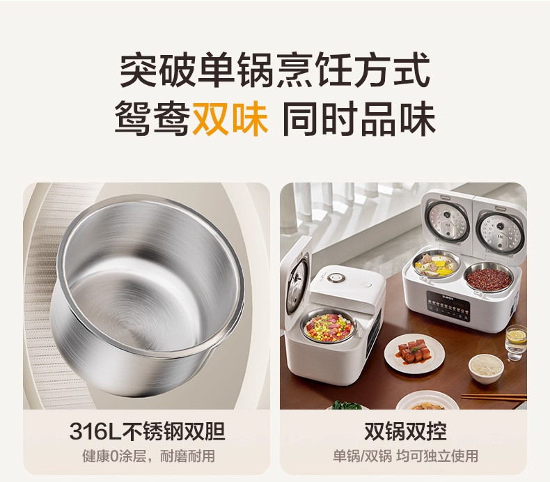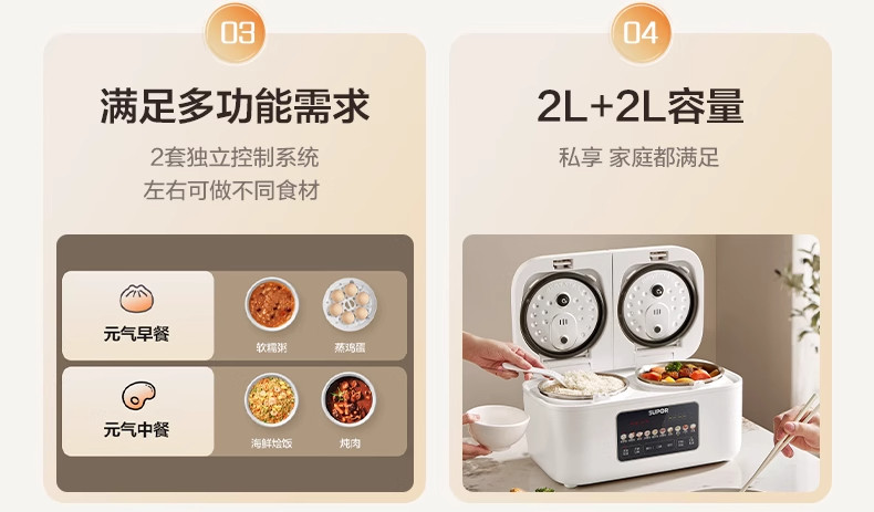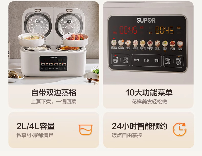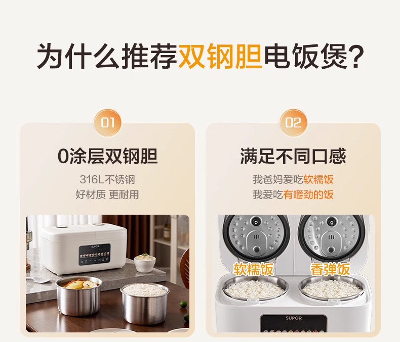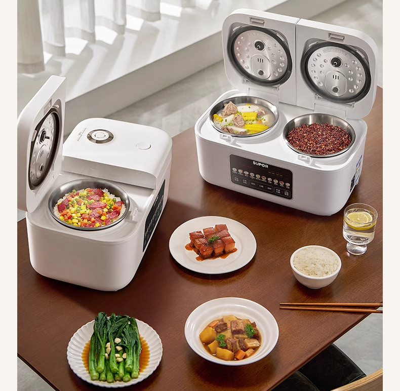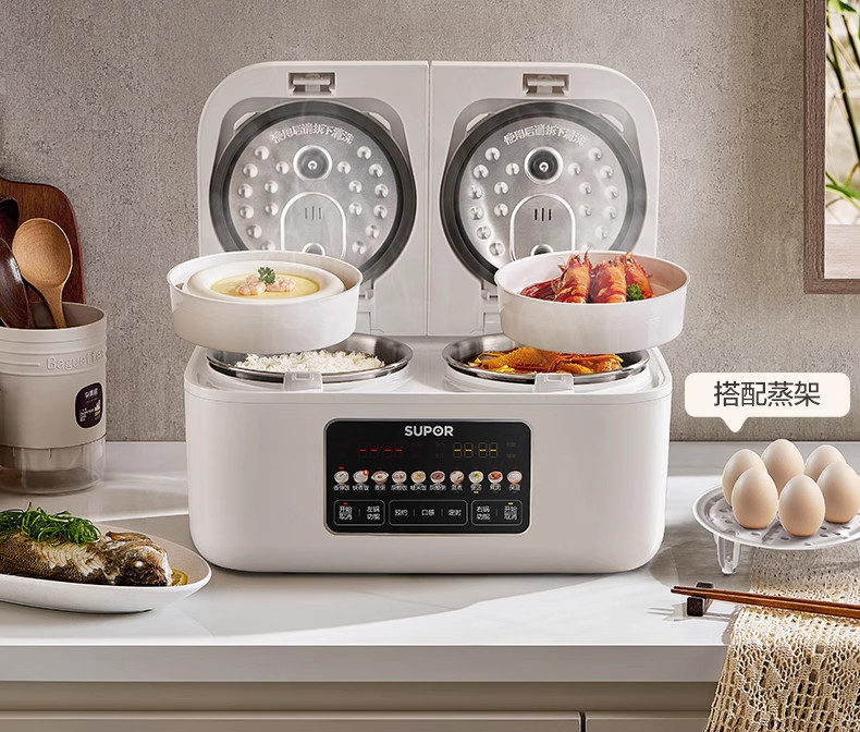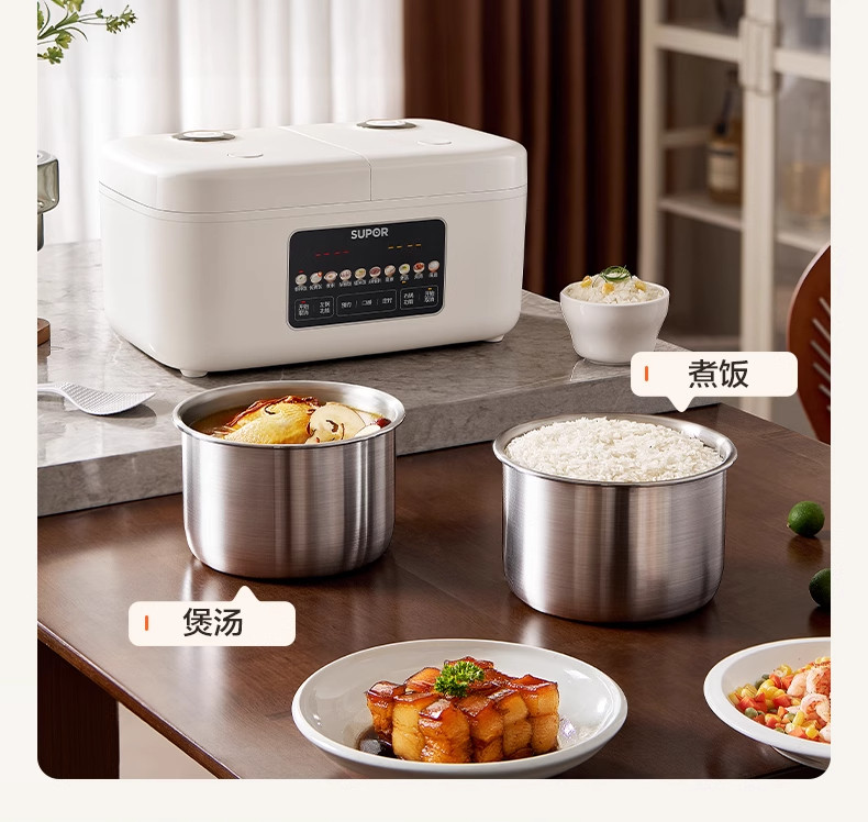Supor Rice Cooker with Dual Inner Pots for Home Use, Multifunctional Steaming and Cooking, 316L Stainless Steel, Dual Pot Dual Control Rice Cooker