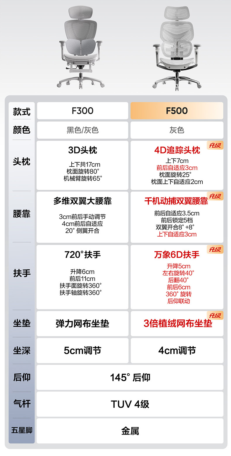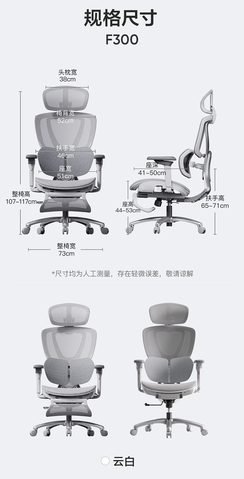 | Color Classification | F500 Without Footrest (Thousand Motorized Waist Support + Wanxiang 6D Armrest + Versatile Adaptive Headrest + 145°Leaning Back),F500 with Footrest (Thousand Motorized Waist Support + Wanxiang 6D Armrest + Versatile Adaptive Headrest + 145°Leaning Back),F300 Without Footrest (Double Wings Embrace Dynamic Waist +720°Rotating Armrest + Chair Back Lift +145°Leaning Back),F300 with Footrest (Double Wings Embracing Dynamic Waist +720 ° Rotating Armrest + Chair Back Lift +145 ° Leaning Back) |