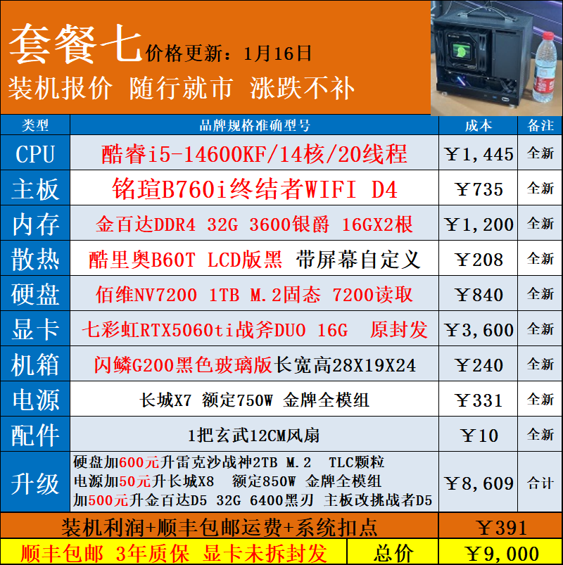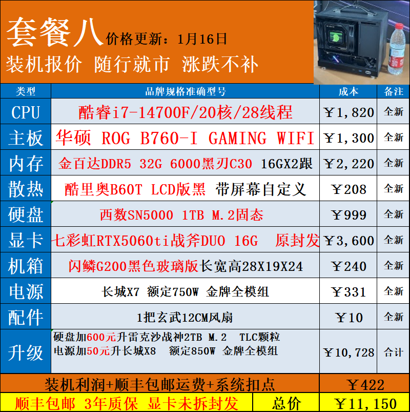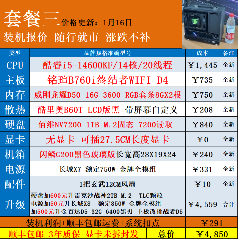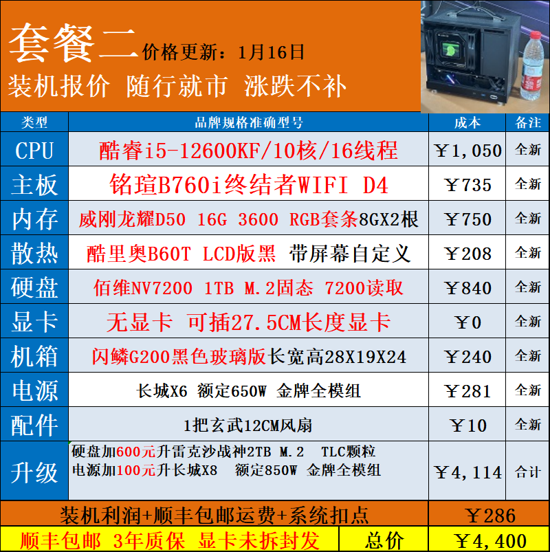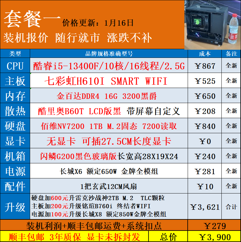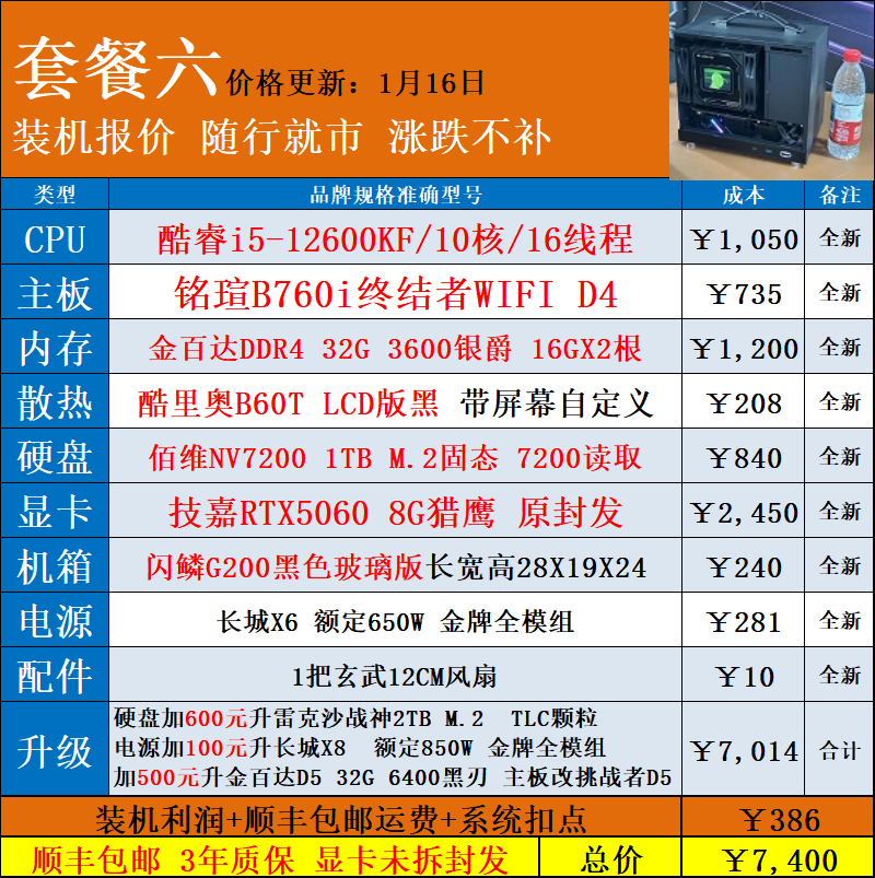 | Package Type | Package 1 I5 13400F Cardless 12.8L,Package 2 I5 12600Kf Cardless 12.8L,Package Three I5 14600Kf Cardless 12.8L,Package 4 I7 14700F Cardless 12.8L,Package 5 13400F/Rtx5060 8g,Package Six 12600Kf/Rtx5060 8g,Package 7 14600Kf/Rtx50060Ti 16g,Package 8 I7 14700F/Rtx50060Ti 16g |