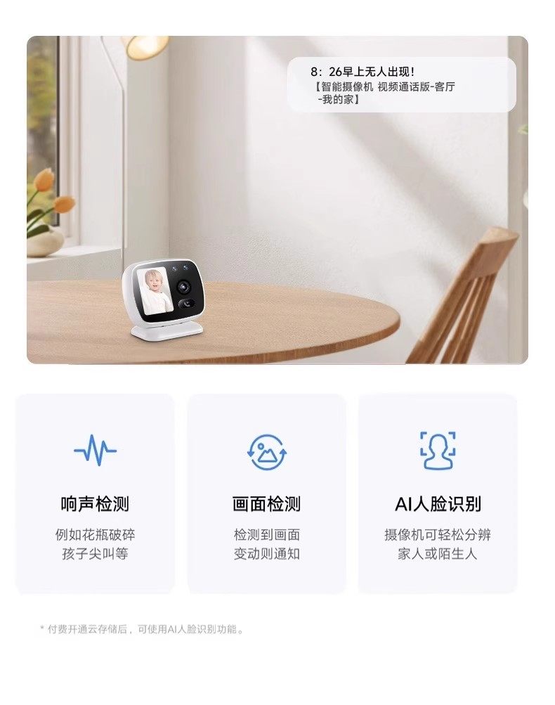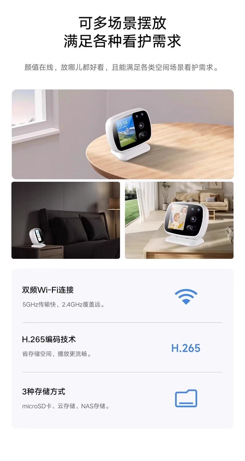 | Applicable Scenarios | Examination Room Monitoring,Remote Education and Learning,Video Conferencing and Remote Office,Natural Disaster or Emergency Event Monitoring,Remote Communication and Social Networking,Pet Care,Monitor Express Delivery and Packages,Field Monitoring,Indoor,Nanny or Caregiver Monitoring,Caring for the Elderly and Children,Door and Corridor Monitoring,Special Environment Monitoring |