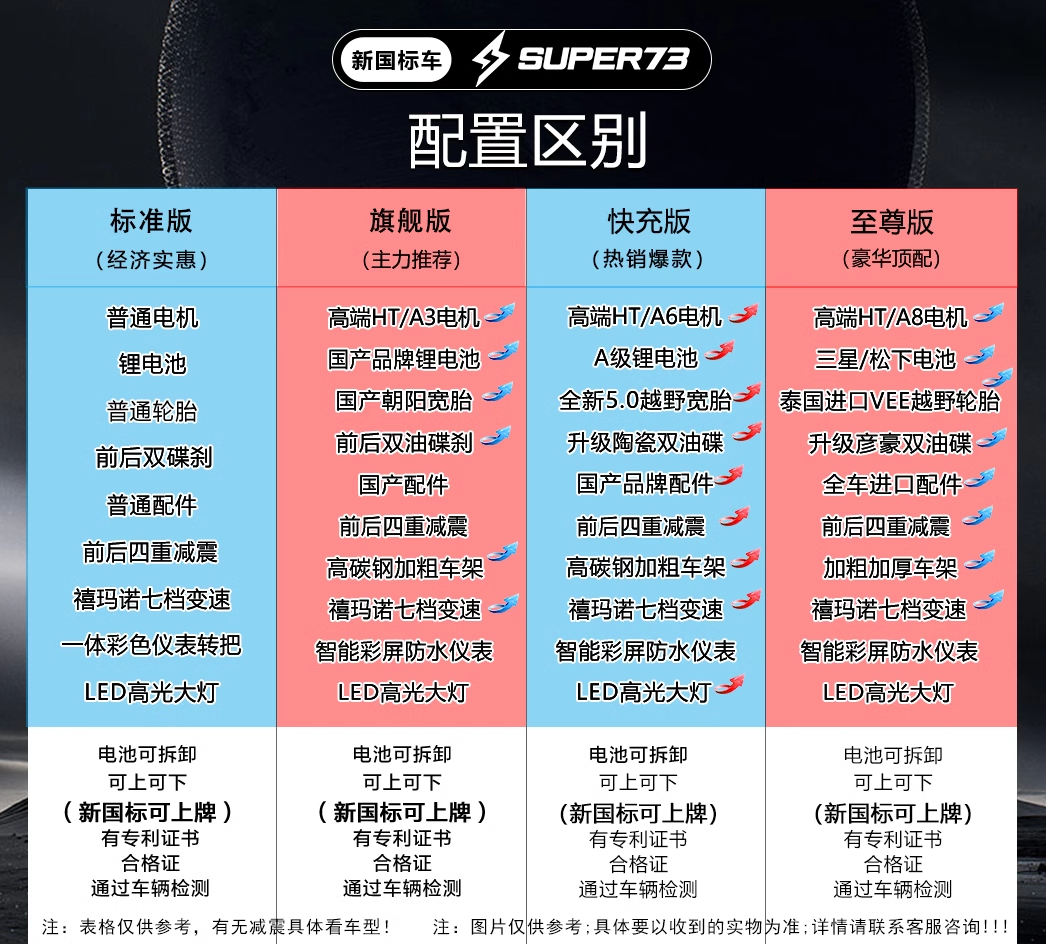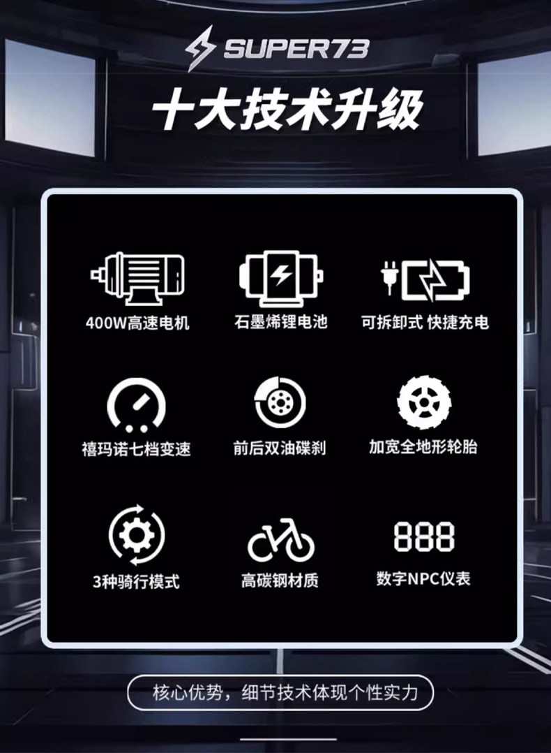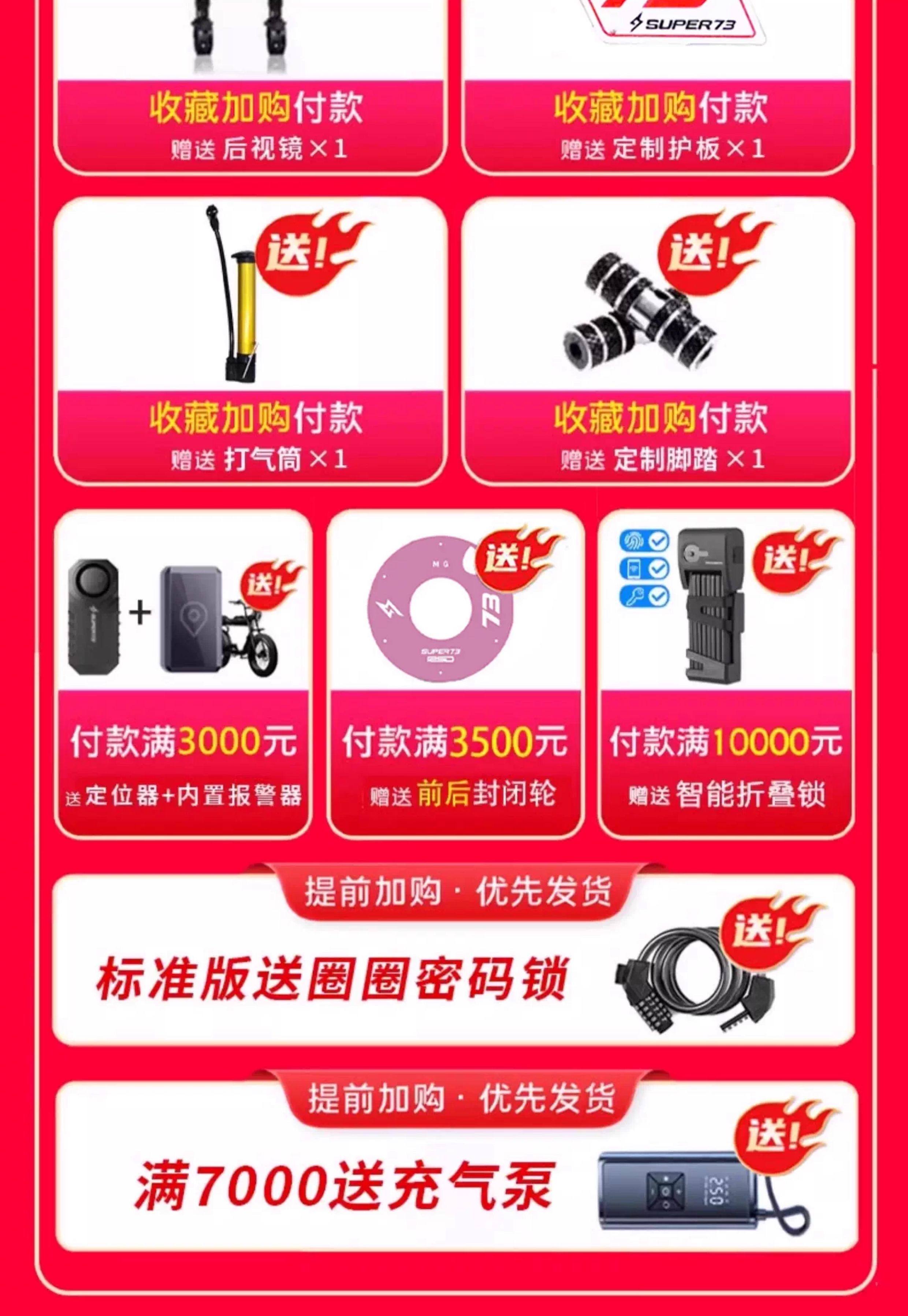 | Color Classification | [Super73-S1-Retro Version] Get Nfc 7inch for Free for Purchases over 2,500, and Get Front and Rear Closed Wheels + Customized Baskets for Purchases over 3,500,[Super73-S2-Retro Version] Get Nfc 7inch for Free for Purchases over 2,500, and Get Front and Rear Closed Wheels + Customized Basket for Purchases over 3,500,[Super73-Y1S-Retro Version] Get Nfc 7inch for Free for Purchases over 2,500, and Get Front and Rear Closed Wheels + Customized Baskets for Purchases over 3,500,[Super73-Rx-Retro Version] Get Nfc 7inch for Free for Purchases over 2,500, and Get Front and Rear Closed Wheels + Customized Basket for Purchases over 3,500,[Super73-Rxs-Retro Version] Get Nfc 7inch for Free for Purchases over 2,500, and Get Front and Rear Closed Wheels + Customized Baskets for Purchases over 3,500,[Super73-S1-Range Extended Version] Front and Rear Dual Oil Brakes/5.0 Tires/High-Speed Brushless Motor,[Super73-S2-Range Extended Version] Front and Rear Double Oil Brakes/5.0 Tires/Seven-Speed Transmission/High-Speed Brushless Motor,[Super73-Y1S-Range Extended Version] New National Standard Can Be Licensed/Double Front and Rear Oil Brakes/5.0 Tires/Seven-Speed Transmission/Front and Rear Four-Fold Shock Absorption/High-Speed Brushless Motor,[Super73-Rx-Range Extended Version] Front and Rear Dual Oil Brakes/5.0 Tires/Seven-Speed Transmission/High-Speed Brushless Motor,[Super73-Rxs-Range Extended Version] New Front and Rear Dual Oil Brakes/5.0 Tires/Seven-Speed Transmission/Front and Rear Four-Fold Shock Absorption/High-Speed Brushless Motor,【Super73-S1 Premium Edition】Dual Hydraulic Disc Brakes (Front & Rear) / Six Colors Available / Built-In Gps Tracker & Alarm / Integrated Front & Rear Closed Wheels + Custom Basket / High-Speed A9 Motor / Graphene Lithium Battery,[Super73-S2-Exclusive Edition] Dual Front and Rear Oil Brakes/Six Colors Optional/Built-In Locator and Alarm/Comes with Front and Rear Closed Wheels + Personalized Basket/Seven-Speed Transmission/High-Speed A9 Motor/Graphene Lithium Battery,[Super73-Y1S-Exclusive Edition] New National Standard Can Be Registered/Front and Rear Double Oil Brakes/Six Colors Optional/Built-In Locator and Alarm/Comes with Front and Rear Closed Wheels + Personalized Basket/Seven-Speed Transmission/High-Speed A9 Motor/ Graphene Lithium Battery,【Super73-Rx - Premium Edition】Dual Front and Rear Hydraulic Disc Brakes / Six Colors Available / Integrated Gps Tracker and Alarm / Includes Front and Rear Closed Wheels + Custom Basket / 7-Speed Shifting / Front and Rear Suspension / High-Speed A9 Motor / Graphene Lithium Battery,【Super73-Rxs - Premium Edition】Dual Front and Rear Hydraulic Disc Brakes / Six Colors Available / Built-In Gps Tracker and Alarm / Integrated Front and Rear Closed Wheels + Custom Basket / 7-Speed Shifting / Dual Suspension (Front and Rear) / High-Performance A9 Motor / Graphene Lithium Battery,[Super73-Top Version] Adjustable Front Fork/A9Tt Motor/Ceramic Oil Brake/Thailand Import Tires/Samsung Battery/Closed Wheel/Built-In Locator and Alarm,[Super73-Y1Srx Series Prepaid Color Configuration Customization] Requires Matching Other Options to Place an Order for Delivery |