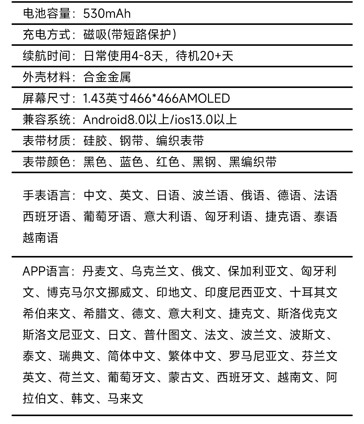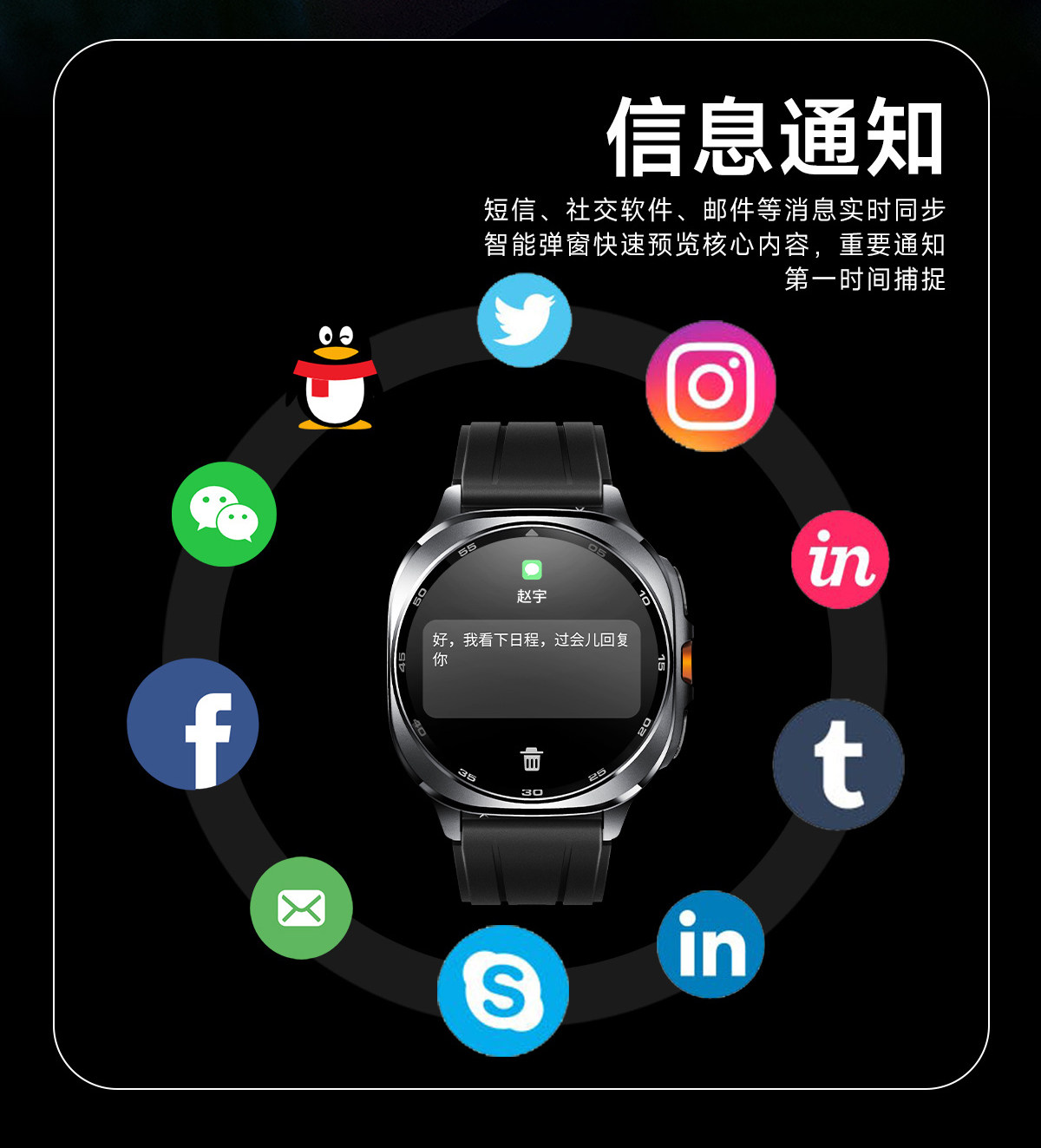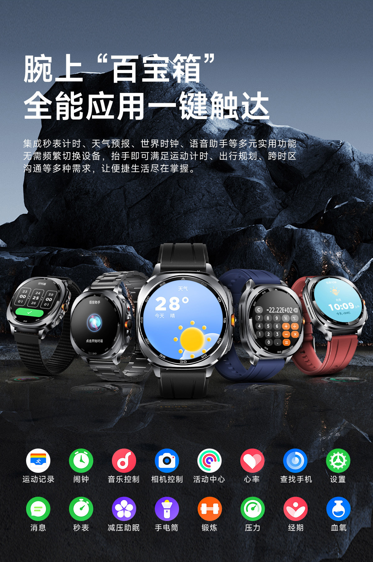 | Function | Exercise Tracking,Bluetooth,Step Counting,Audio and Video Entertainment,Health Monitoring,Reminder to Sit for a Long Time,Social Entertainment,Flashlight,Blood Pressure Monitoring,Remote Positioning,Information Push,Heart Rate Monitoring,Blood Oxygen Detection,Smart Reminder,Sleep Monitoring,Smart Q&A,Watch Features |