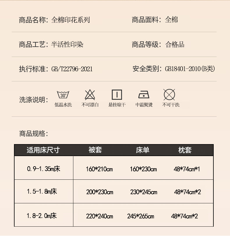 | Applicable Bed Size | 0.9m Student Bed[Three-Piece Bed Sheet Set]-Suitable for 150X200Cm Quilt Core,1.2m Single Bed[Three-Piece Bed Sheet Set]-Suitable for 150X200Cm Quilt Core,1.5m Bed[Bed Sheet Four-Piece Set]Suitable for 200X230Cm Quilt Core,1.8m Bed[Bed Sheet Four-Piece Set]Suitable for 200X230Cm Quilt Core,2.0m Bed[Bed Sheet Four-Piece Set]Suitable for 200X230Cm Quilt Core,2.2m Bed[Bed Sheet Four-Piece Set]-Suitable for 220X240Cm Quilt Core |