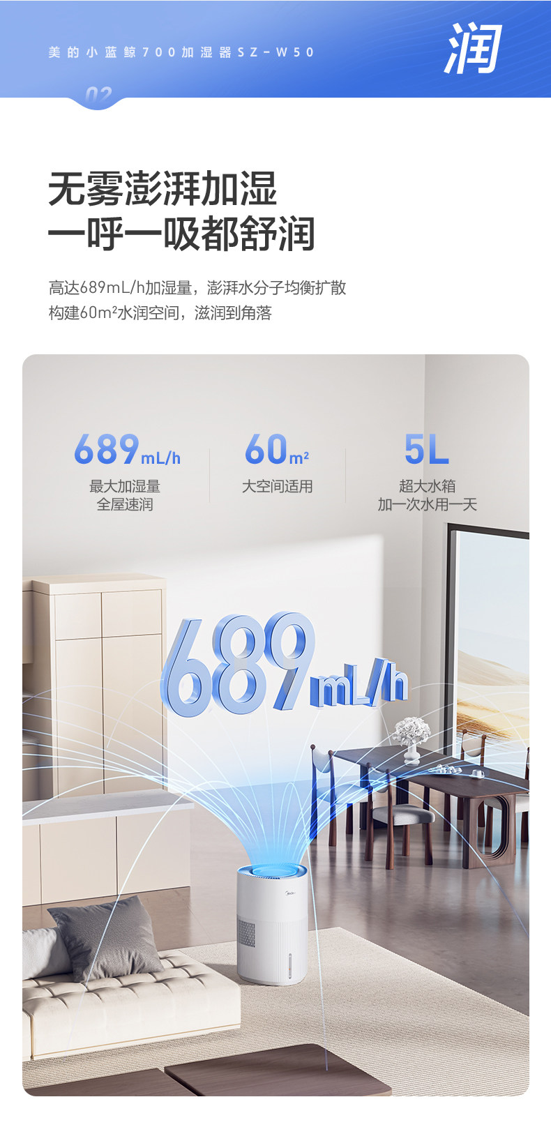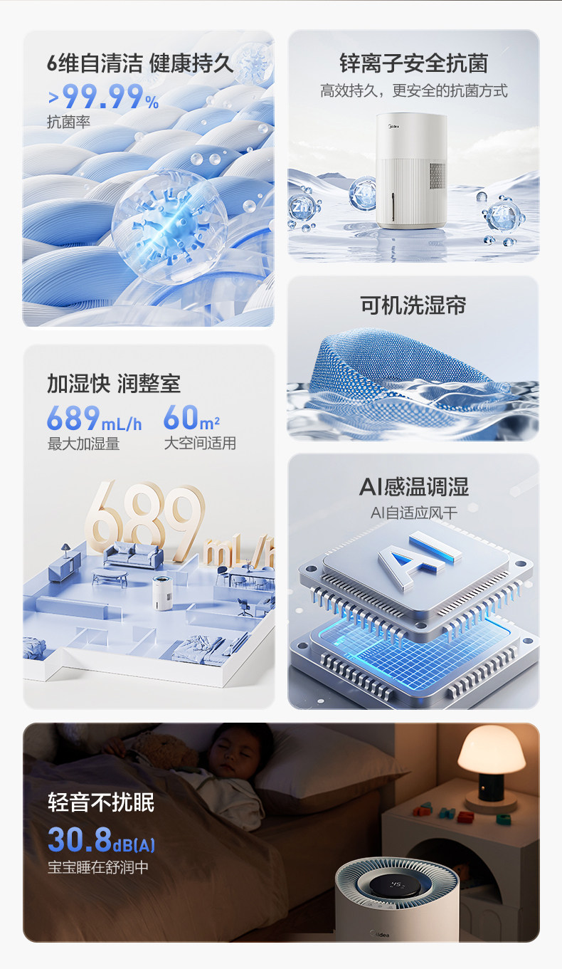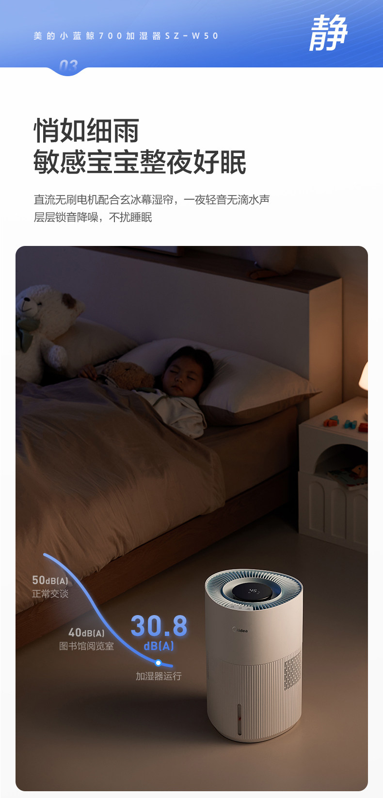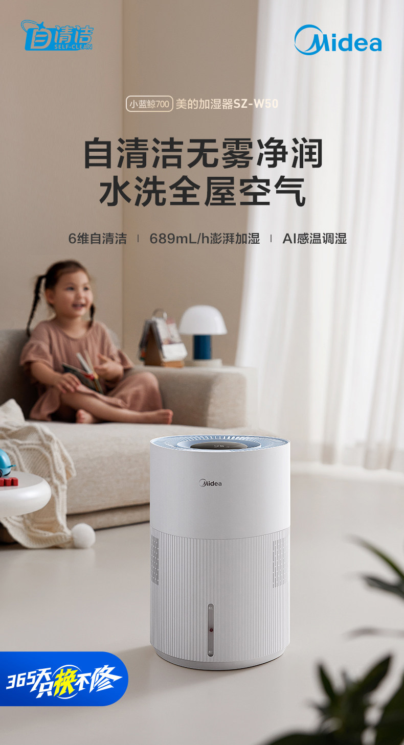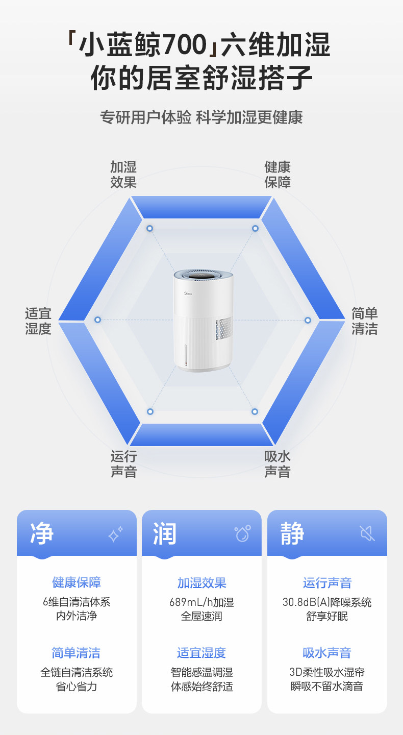 Midea Little Blue Whale 700 Fog-Free Air Humidifier W50 Purification Household Sterilization Atomizer for Pregnant Women and Baby Bedrooms