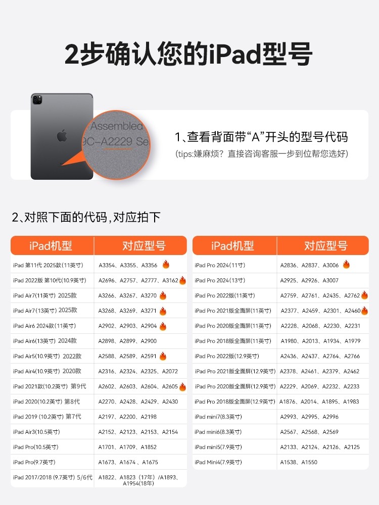 | Applicable Tablet Computer Models | IPad Air6 2024 Model (11inch),iPad Air5(10.9inch),iPad Mini7(8.3inch),iPad Air3(10.5inch),iPad Air7 2025 (11inch) M3,iPad 2021 Model (10.2inch),iPad 2018 (9.7inch),iPad Pro 2020 Version Full Screen (11inch),iPad 11Th Generation 2025 Model (11inch),iPad Pro 2025 Version (13inch),iPad Air1(9.7inch),iPad Pro 2022 Version (11inch),iPad Pro 2022 Version (12.9inch),iPad 2019 (10.2inch),iPad Mini 8.3inch,iPad Pro 2018 Version Full Screen (11inch),iPad Pro (10.5inch),iPad 2020(10.2inch),iPad Pro 2018 Version Full Screen (12.9inch),iPad Pro 2020 Version Full Screen (12.9inch),iPad Air7 2025 (13inch) M3,iPad Pro 2025 Version (11inch),iPad 2017 (9.7inch),iPad Air6 2024 Model (13inch),iPad Air4(10.9inch),iPad Pro 2024 (13inch),iPad Pro 2024 (11inch),iPad Pro 2021 Version Full Screen (11inch),iPad Pro 2021 Version Full Screen (12.9inch),iPad Air2(9.7inch),iPad 2023 New Version 10Th Generation (10.9inch) |