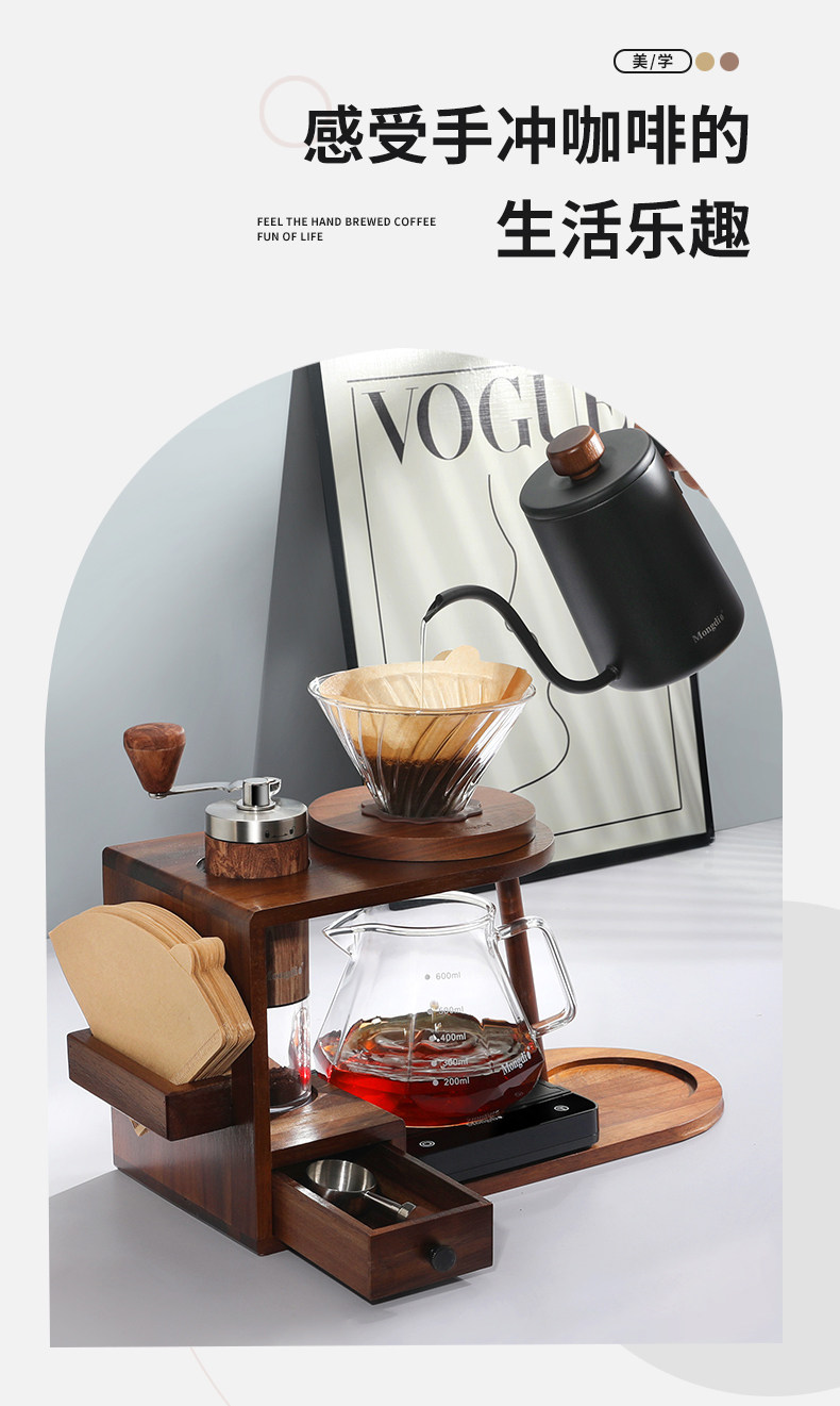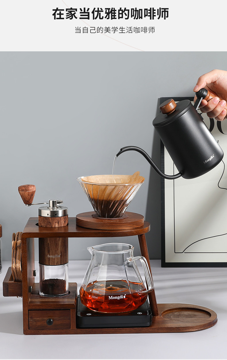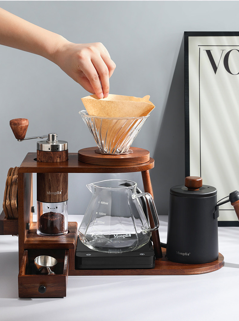 Mongdio Hand-Brewed Coffee Pot Set, Hand-Grind Coffee Machine, Storage Wooden Stand, Coffee Hand-Brewed Pot, Coffee Utensils