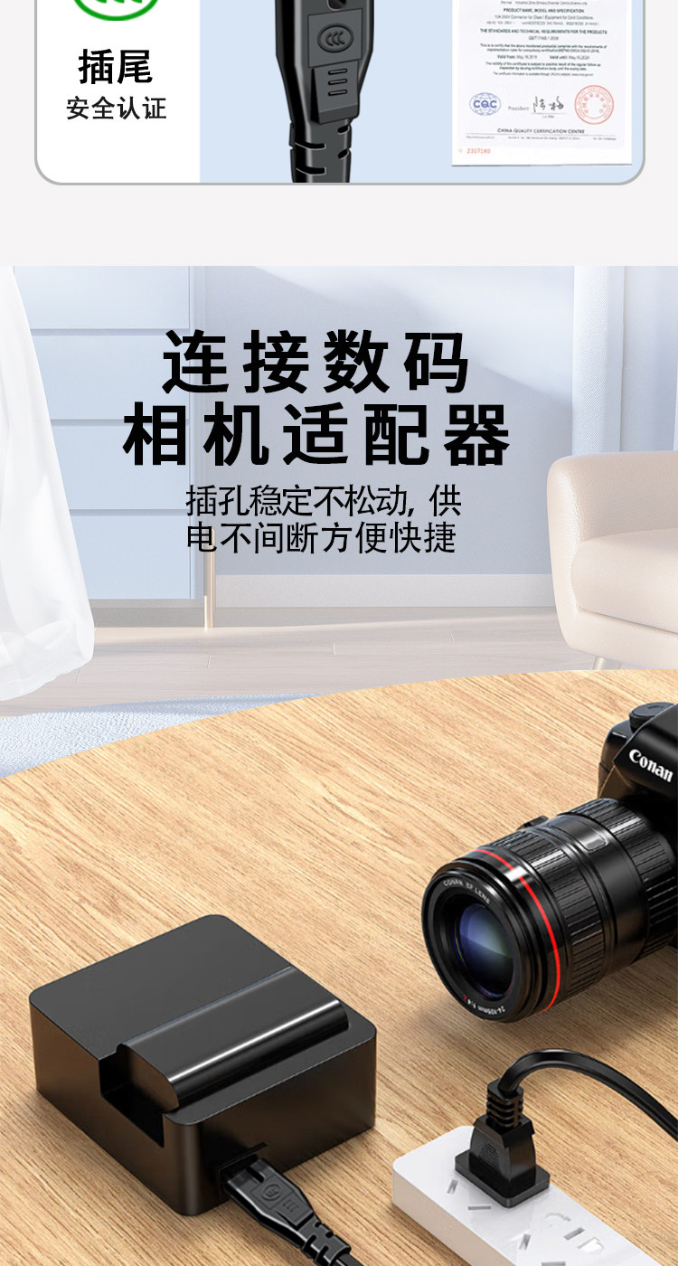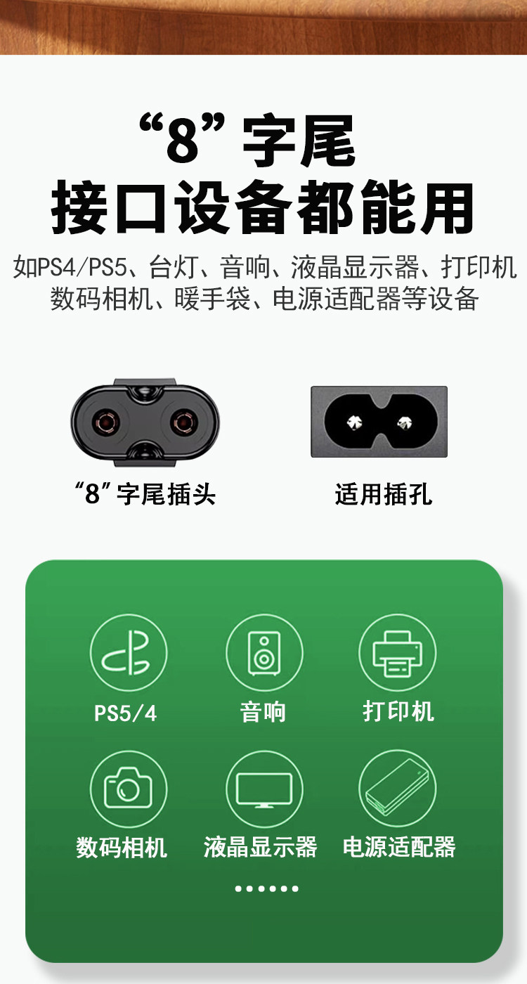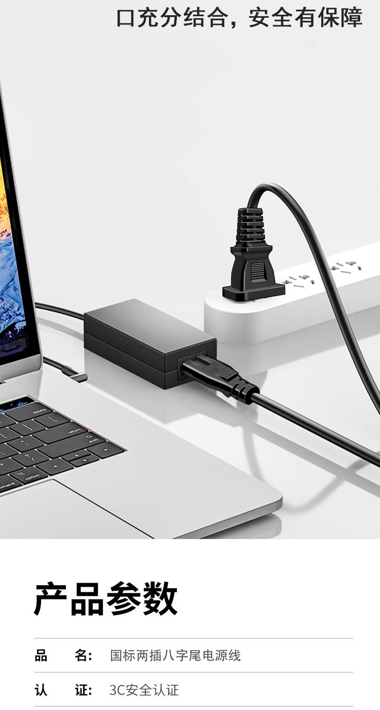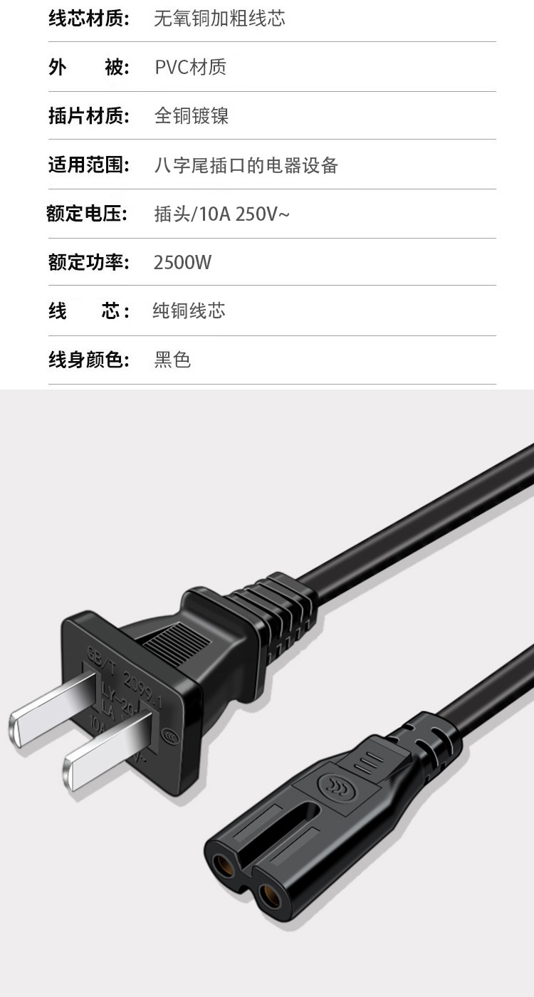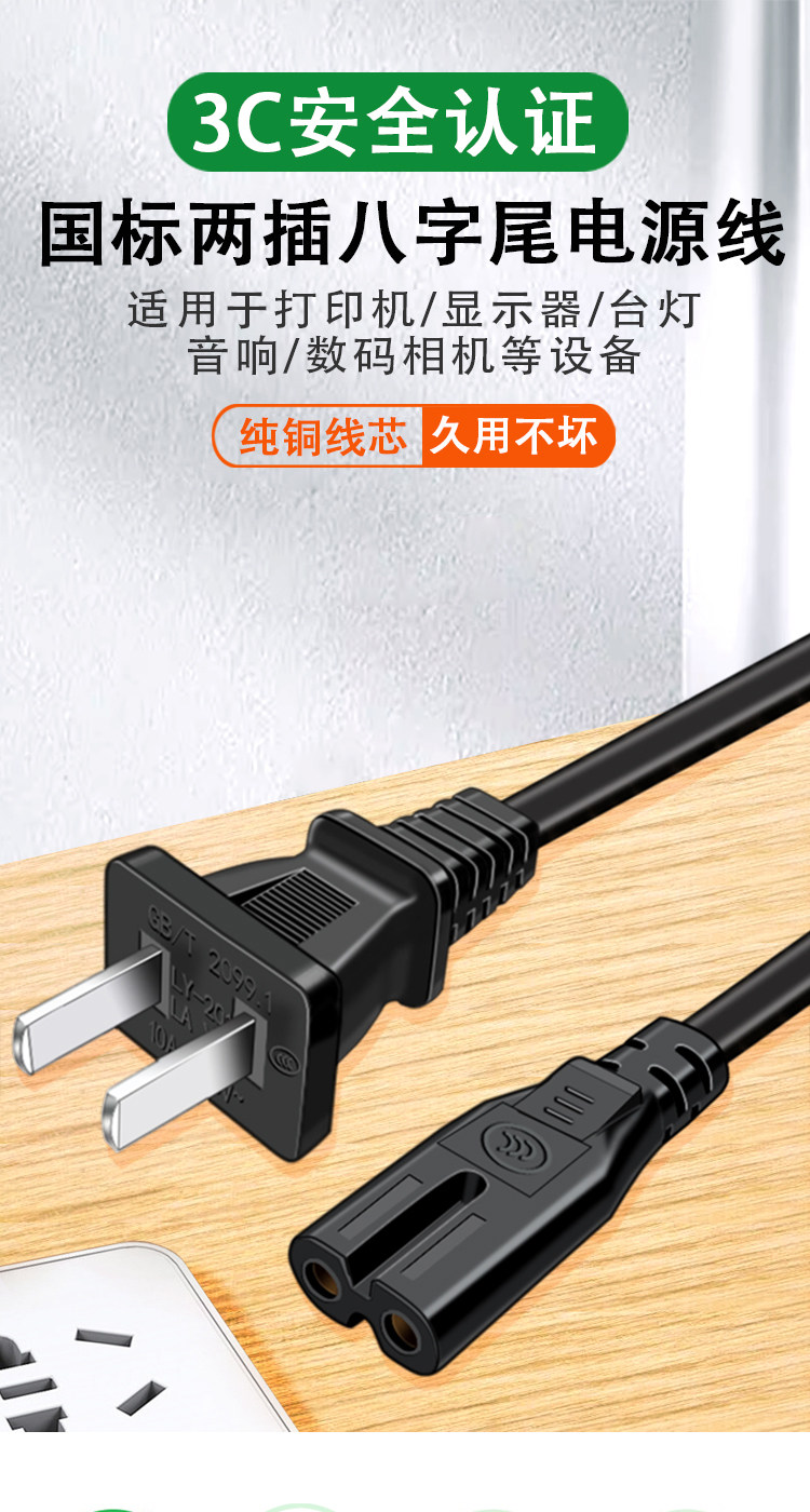 Eight-Character Power Cord, 2-Core, Two-Prong with Plug, for Monitor, Audio, Tv, Printer, Projector, Extended Charging Cable