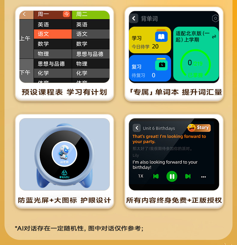 | Color Classification | [Explore Green]-Rui Ai Time Butler-Three Major Ai Models + One Hundred Thousand Whys,【Creative Blue】 - Ruizu Ai Time Butler - Three Major Ai Models + 100,000 "Why?" Questions,【Inspiration White】 - Ruizu Ai Time Butler - Three Major Ai Models + 100,000 "Why?" Questions,Ruizu Ai Time Manager: Includes Ruizu Premium Membership - Ai+ Materials + 100,000 Whys,In-Class Learning + Extracurricular Expansion + Self-Discipline Development + Independent Thinking |