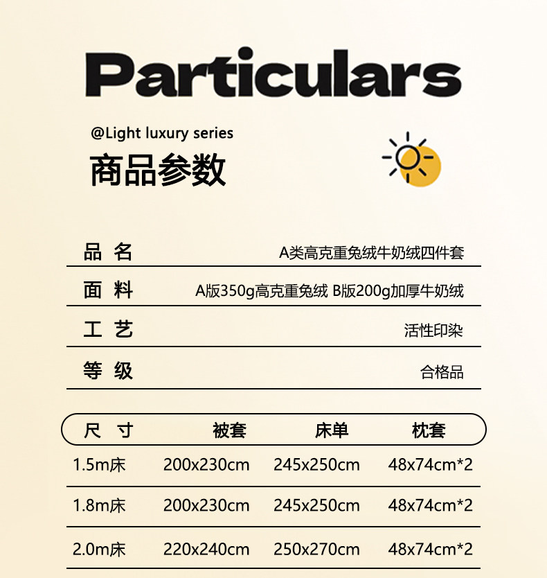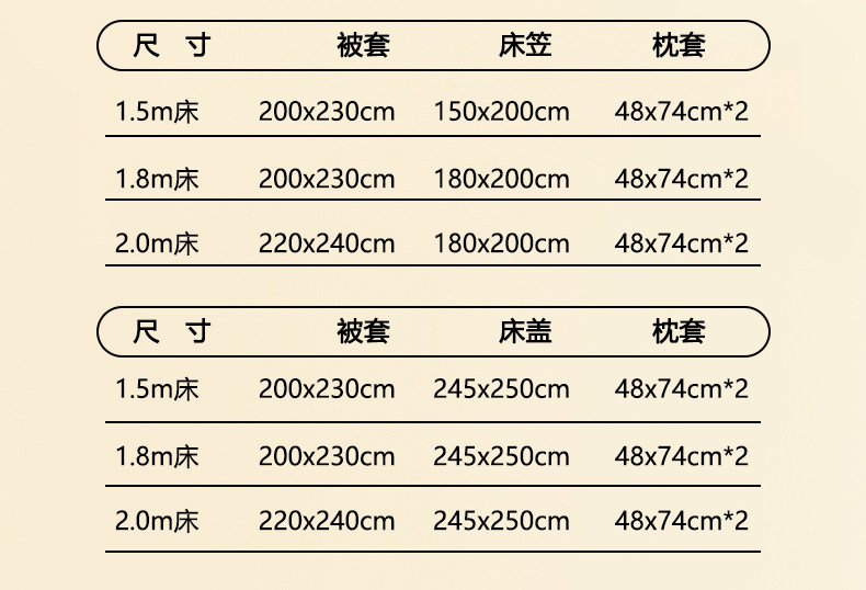 | Applicable Bed Size | [Bed Sheets] 0.9 Three-Piece Set - Quilt Cover 150X200,[Bed Sheets] 1.2 Three-Piece Set-Quilt Cover 150X200,[Bed Sheets] 1.5 Four-Piece Set - Quilt Cover 200X230,[Bed Sheets] 1.8 Four-Piece Set - Quilt Cover 200X230,[Bed Sheets] 2.0 Four-Piece Set - Duvet Cover 220X240,【Fitted Sheet Style】1.5M Four-Piece Bedding Set - Duvet Cover 200X230Cm,【Fitted Sheet Style】1.8M Four-Piece Bedding Set - Duvet Cover 200X230Cm,【Bedspread Style】1.5M Four-Piece Set - Duvet Cover 200X230Cm,【Bedspread Style】1.8M Four-Piece Set - Duvet Cover 200X230Cm,[Bed Cover Model] 2.0 Four-Piece Set-Quilt Cover 220X240 |