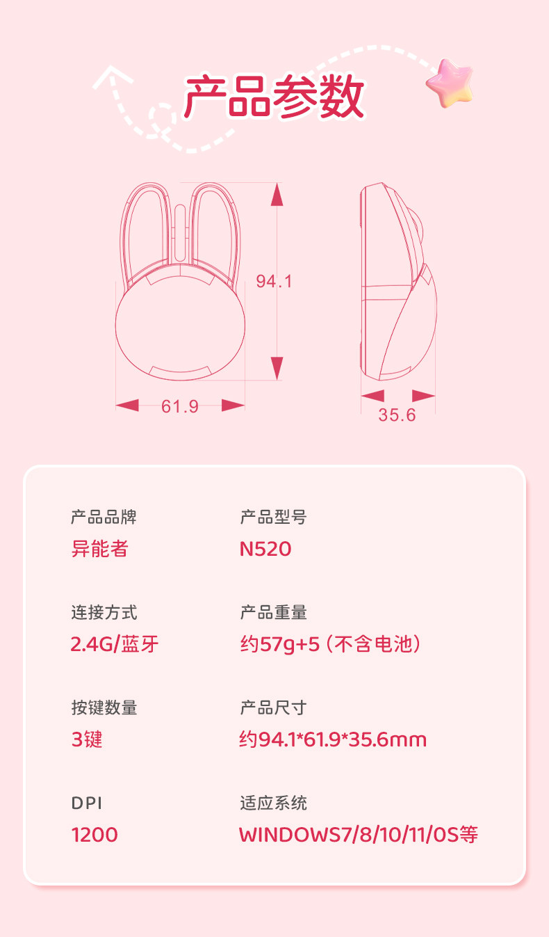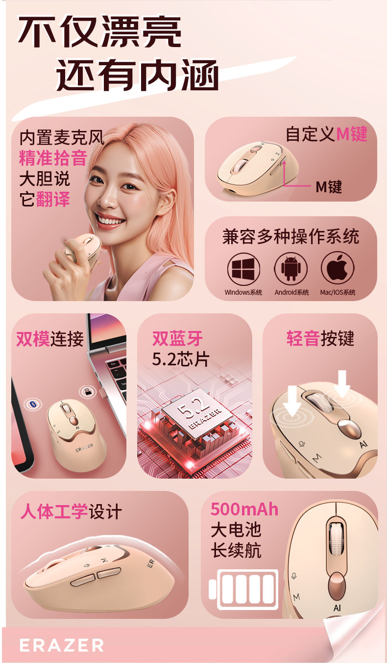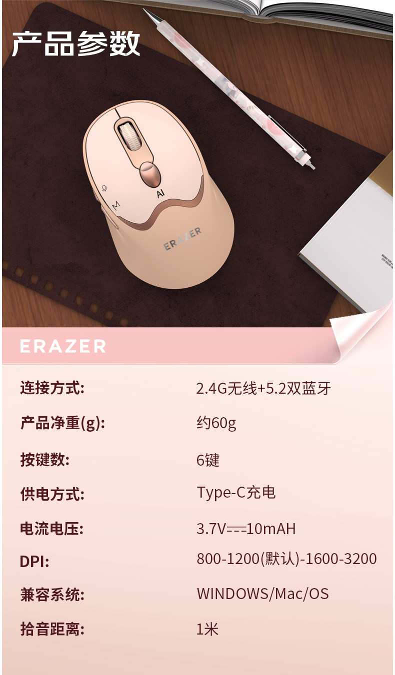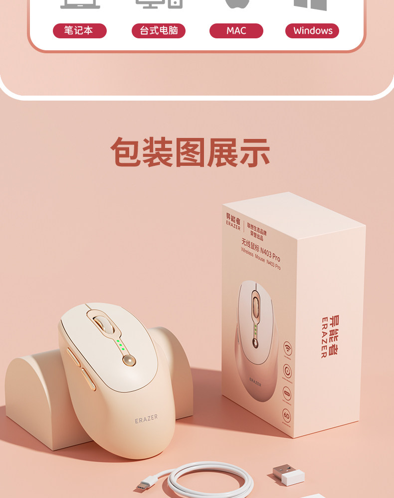 | Color Classification | Wireless Mouse Milk Tea Color N403,Wireless Dual-Mode Mouse Milk Tea Color N403 Pro,Wireless Mouse - Cute Ear Pink Tangerine N520,Wireless Mouse Cute Ear Milk Apricot N520,Wireless Mouse Cute Ear Firefly Pink N520,Wireless Mouse - Gilded Rose N520 with Cute Ear Design,Wireless Smart Mouse Apricot N330,Wireless Smart Mouse Pink N330 |
