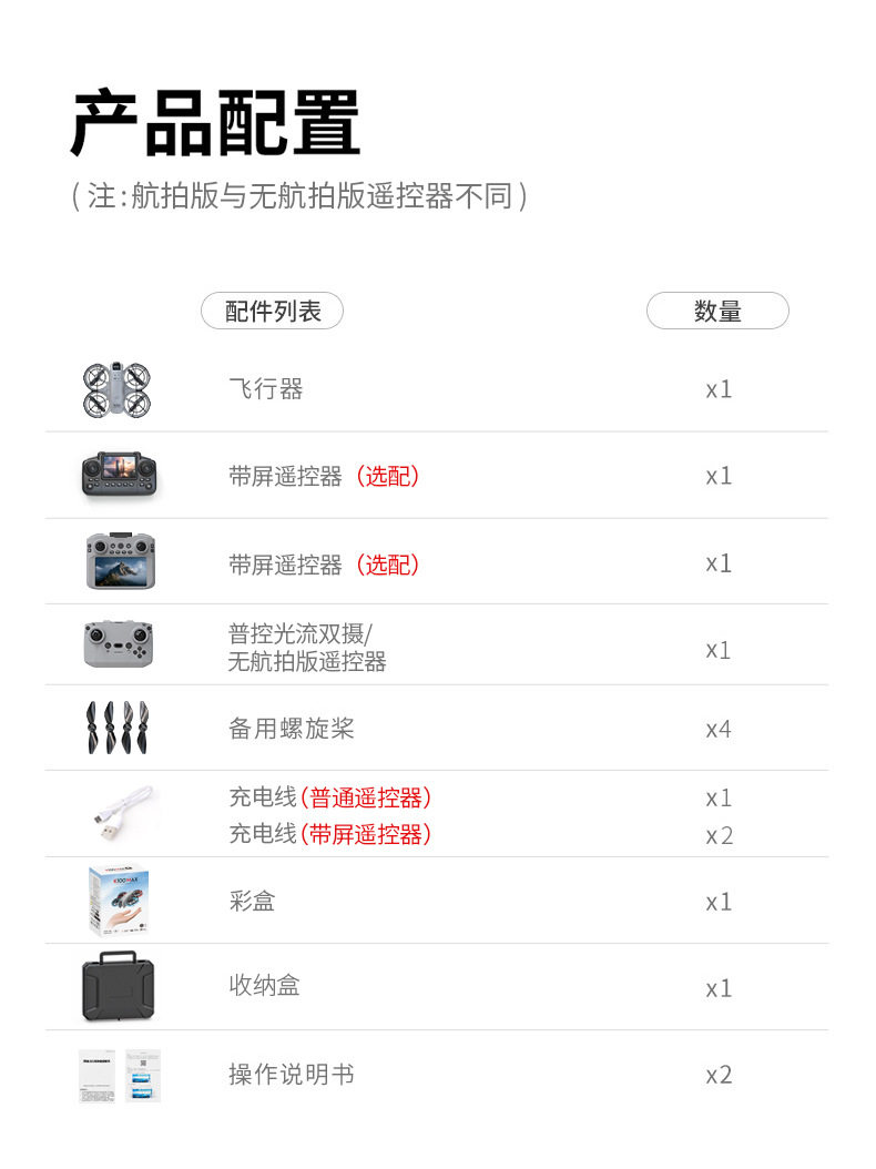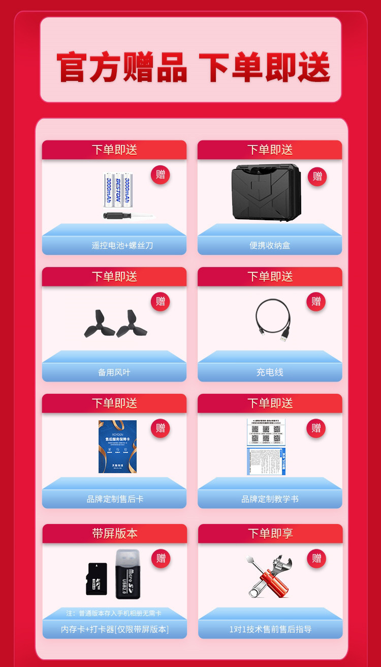 | Package Type | Official Standard Configuration,An Aircraft Battery[Comes with Storage Box + Vulnerable Accessories + Flight Instructions + Charging Cable],Two Aircraft Batteries[Comes with Storage Box + Vulnerable Accessories + Flight Instructions + Charging Cable],Three Aircraft Batteries[Includes Storage Case + Consumable Parts + Flight Guide + Multiple Charging Cables],Four Aircraft Batteries[Includes Storage Case + Consumable Parts + Flight Guide + Multiple Charging Cables] |