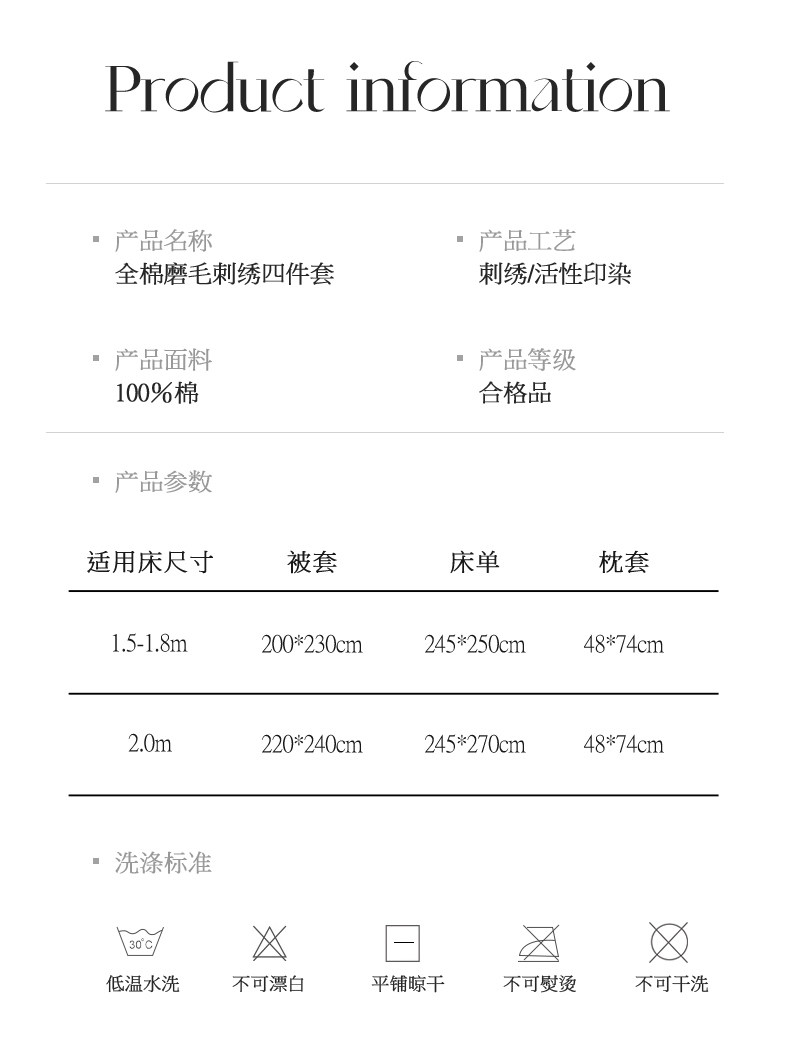 | Applicable Bed Size | 1.5m Bed Sheet Four-Piece Set[Quilt Cover 200*230cm],1.8m Bed Sheet Four-Piece Set[Quilt Cover 200*230cm],2.0m Bed Sheet Four-Piece Set[Large Quilt Cover 220*240cm],1.5m Fitted Sheet Set of Four[Quilt Cover 200*230cm],1.8m Fitted Sheet Set of Four[Quilt Cover 200*230cm],1.8m Fitted Sheet Set of Four[Large Quilt Cover 220*240cm] |