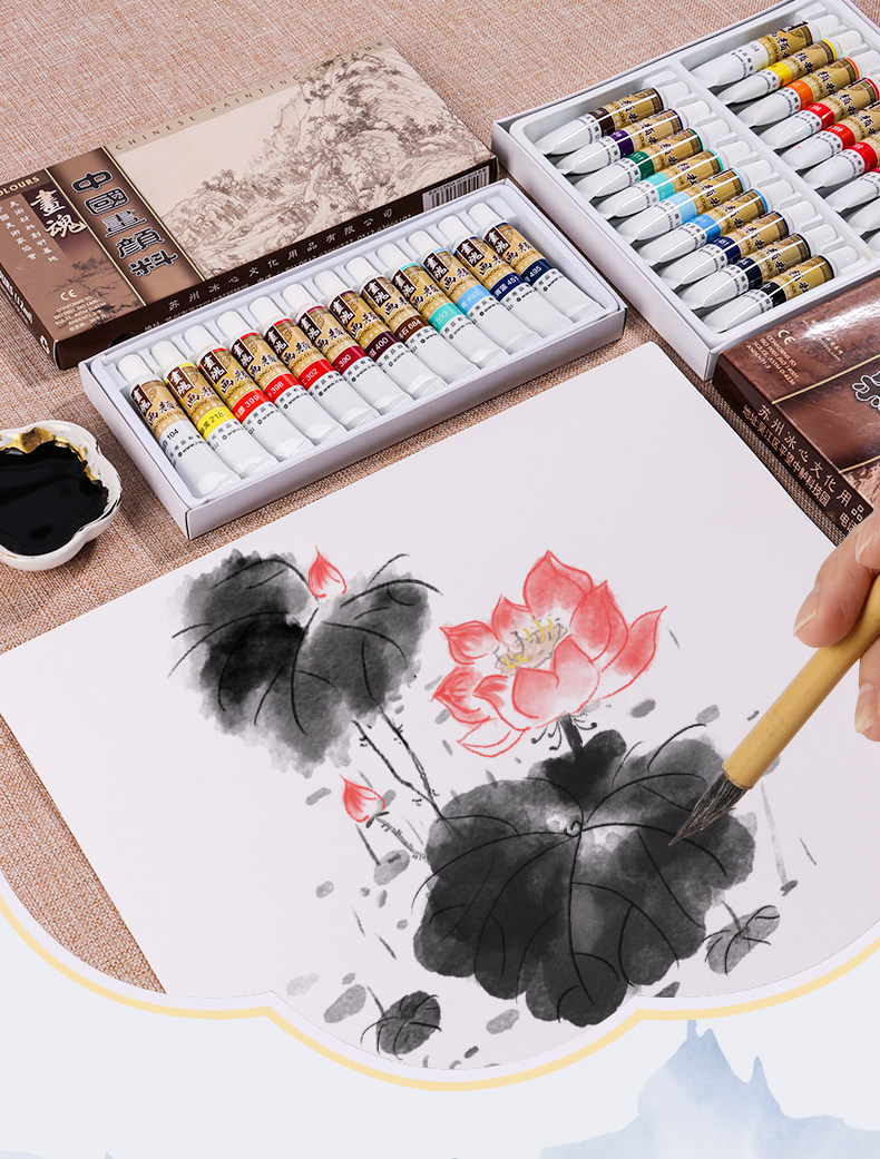 Chinese Painting Beginner Set Storage Tote Bag 24-Color Paint Art Supplies Basic Tools Complete Set Ink Painting Fine Brush Painting Materials 8K Rice Paper 12-Color Elementary School Students Children Art Students Beginner Use