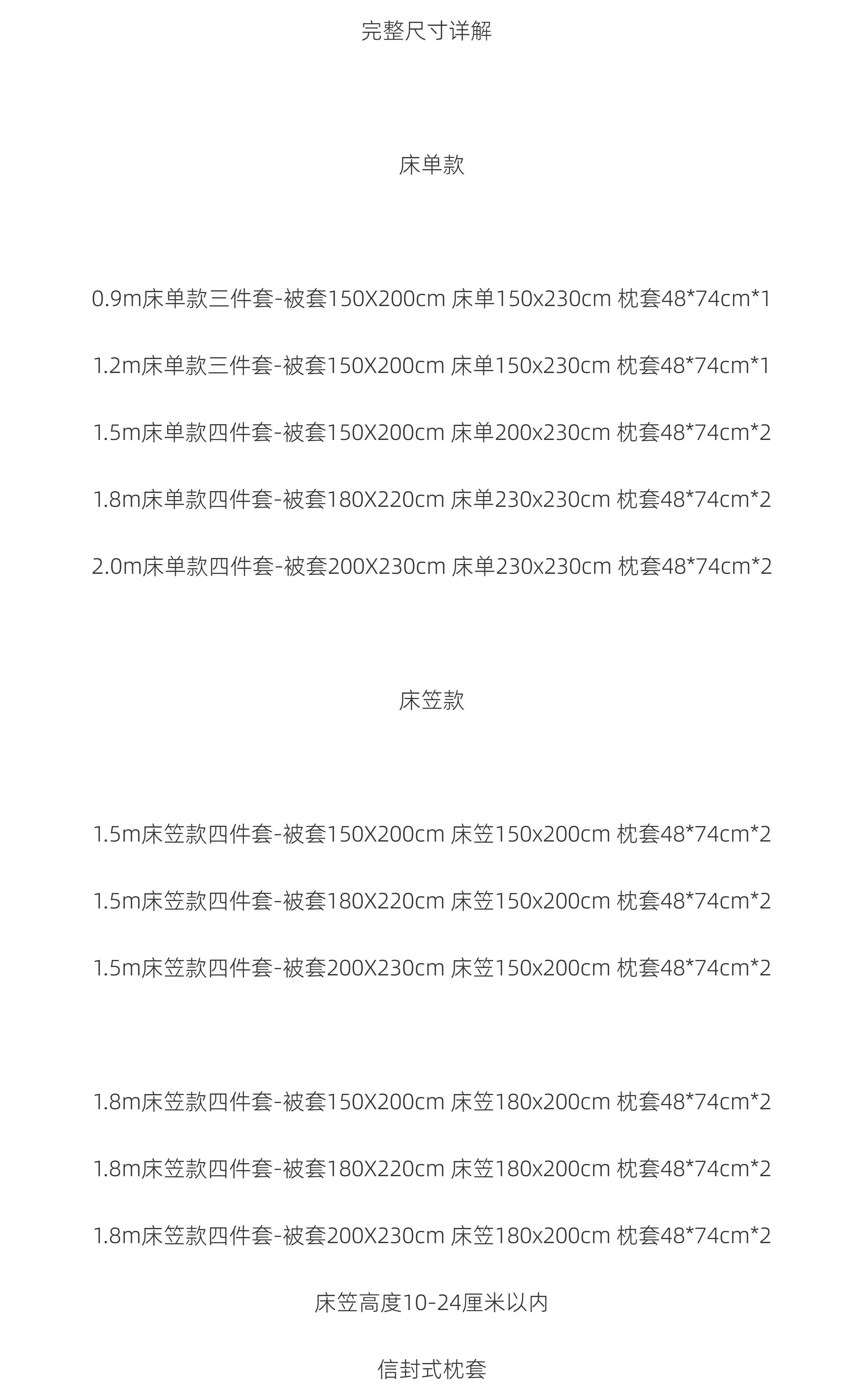 | Applicable Bed Size | 0.9m Bed Sheet Three-Piece Set: Duvet Cover 150*200cm,1.2 Three-Piece Bed Sheet Set: Quilt Cover 150*200cm,1.5 Bed Sheet Four-Piece Set: Quilt Cover 150*200cm,1.8 Bed Sheets Four-Piece Set: Quilt Cover 180*220cm,2.0 Bed Sheet Four-Piece Set: Quilt Cover 200*230cm,1. 5m [Fitted Sheet Style] Four-Piece Bedding Set: Duvet Cover 150*200 cm,1. 5m [Fitted Sheet Style] Four-Piece Bedding Set: Duvet Cover 180*220 cm,1. 5m Fitted Sheet Four-Piece Bedding Set: Duvet Cover 200*230 cm,1.8 [Fitted Sheet Style] Four-Piece Bedding Set: Duvet Cover 150*200 cm,1.8 [Fitted Sheet Style] Four-Piece Bedding Set: Duvet Cover 180*220 cm,1.8 [Fitted Sheet Style] Four-Piece Bedding Set: Duvet Cover 200*230 cm |