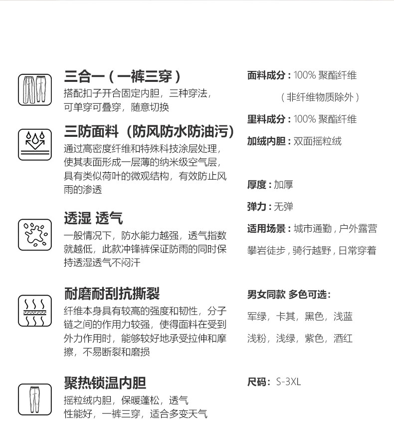 | Color | Light Purple [Three-In-One - Removable Liner] Same Style for Men and Women,Light Green [Three-In-One-Detachable Liner] Same Style for Men and Women,Military Green [Three-In-One-Detachable Liner] Same Style for Men and Women,Light Blue [Three-In-One-Detachable Liner] Same Style for Men and Women,Burgundy [Three-In-One-Detachable Liner] Same Style for Men and Women,Purple [Three-In-One-Detachable Liner] Same Style for Men and Women,Black [Three-In-One-Detachable Liner] Same Style for Men and Women,Khaki [3-in-1 - Detachable Liner] Unisex,Khaki [Spring and Autumn Style-Single Pants] Same Style for Men and Women,Army Green [Spring and Autumn Style-Single Pants] Same Style for Men and Women,Light Green [Spring and Autumn Style-Single Pants] Same Style for Men and Women,Light Blue [Spring and Autumn Style-Single Pants] Same Style for Men and Women,Light Purple [Spring and Autumn Style-Single Pants] Same Style for Men and Women,Burgundy [Spring and Autumn Style-Single Pants] Same Style for Men and Women,Purple [Spring and Autumn Style-Single Pants] Same Style for Men and Women,Black [Spring and Autumn Style-Single Pants] Same Style for Men and Women |