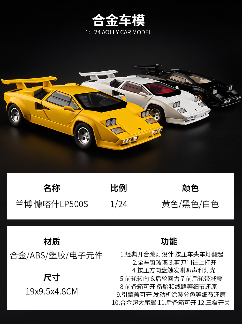 | Color Classification | Yellow Lambo Kantash Lp500S [Boxed],White Lambo Countach Lp500S [Boxed],Black Lambo Countach Lp500S [Boxed],Yellow Lambo Cantis Lp500S [Naked Car],White Lambo Countach Lp500S [Bare Car],Black Lambo Countach Lp500S [Bare Car] |