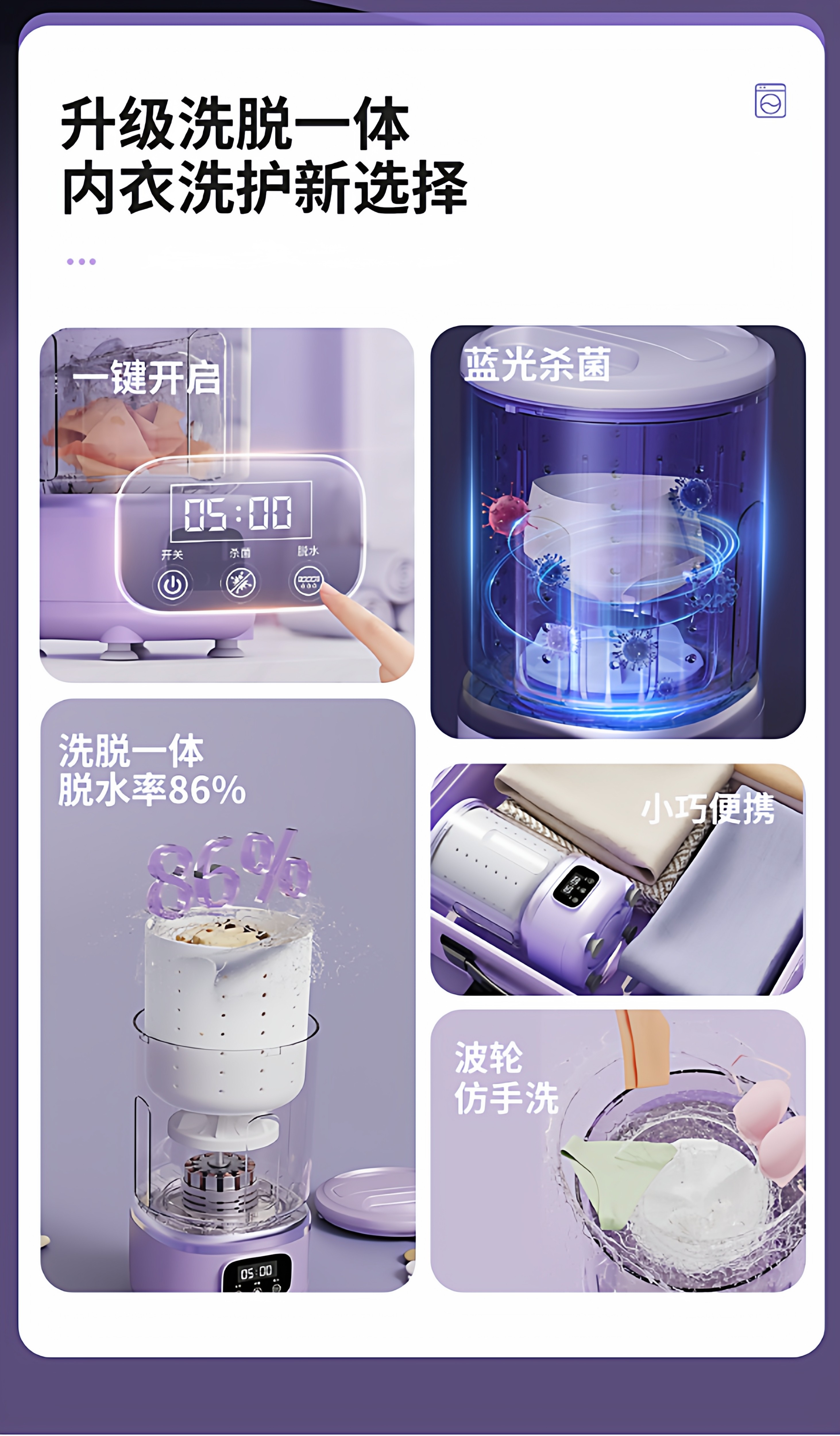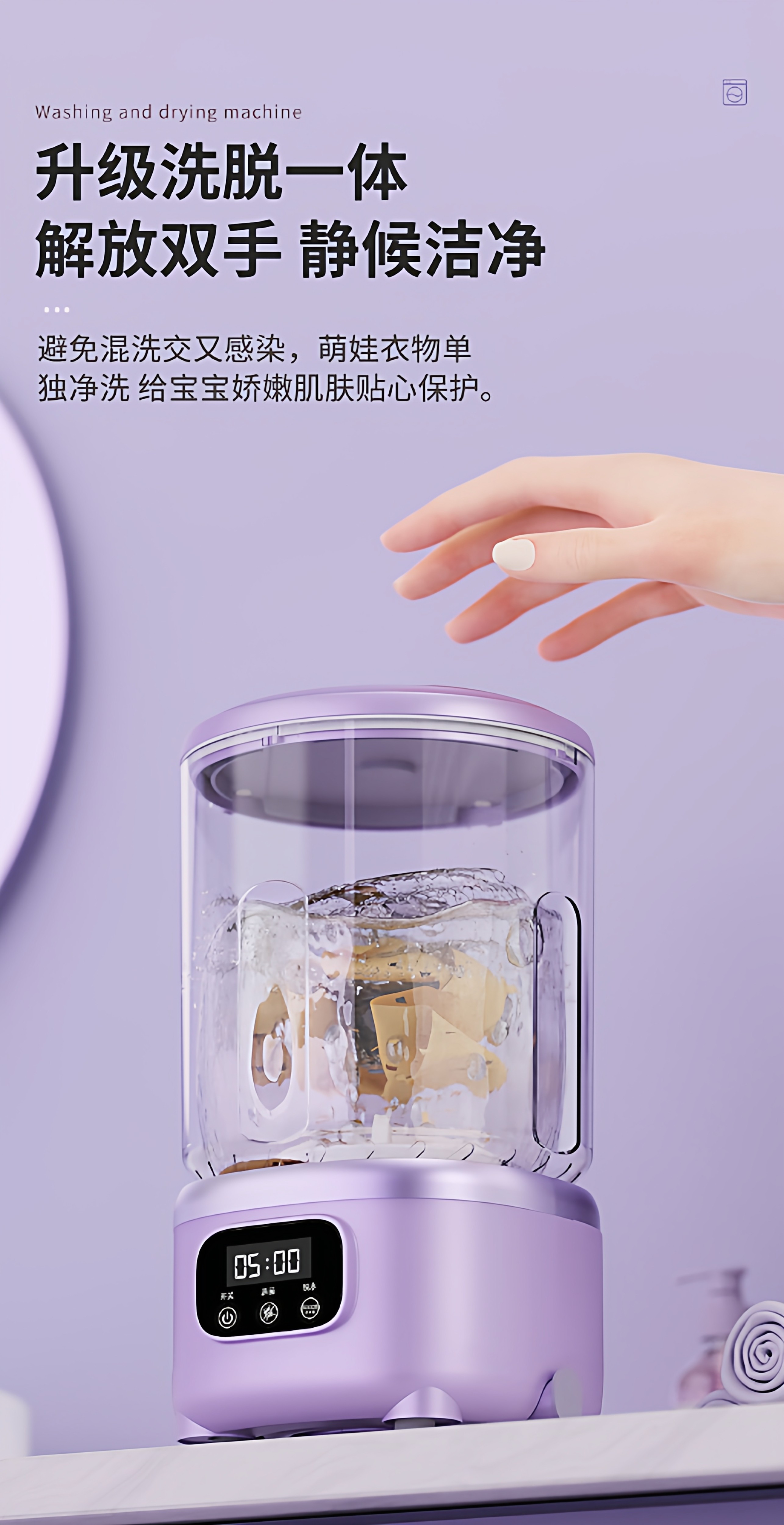 | Color Classification | Flagship Model Off-White[Uv Sterilization of Underwear + Integrated Washing and Elution + Multi-Level Adjustment + Automatic Water Discharge + Six-Fold Anti-Shake],Flagship Model Cherry Blossom Pink[Uv Sterilization of Underwear + Integrated Washing and Elution + Multi-Level Adjustment + Automatic Water Discharge + Six-Fold Anti-Shake],Flagship Model Lavender Purple[Uv Sterilization of Underwear + Integrated Washing and Elution + Multi-Level Adjustment + Automatic Water Discharge + Six-Fold Anti-Shake],Upgraded Model Off-White[Integrated Washing and Drying + Multi-Level Adjustment],Upgraded Version Cherry Blossom Powder[Integrated Washing and Drying + Multi-Level Adjustment],Upgraded Model Lavender Purple[Integrated Washing and Drying + Multi-Level Adjustment],Flagship Model 2 Pack Off-White + Cherry Blossom Pink[Separate Washing of Clothes and Socks + Uv Sterilization of Underwear + Integrated Washing and Discharging + Multi-Level Adjustment + Automatic Water Discharge + Six-Fold Anti-Shake],Flagship Model 2 Pack Off-White + Smoked Purple[Separate Washing of Clothes and Socks + Uv Sterilization of Underwear + Integrated Washing and Discharging + Multi-Level Adjustment + Automatic Water Discharge + Six-Fold Anti-Shake],Flagship Model 2 Pack, Lavender Purple + Cherry Blossom Pink[Separate Washing of Clothes and Socks + Uv Sterilization of Underwear + Integrated Washing and Discharging + Multi-Level Adjustment + Automatic Water Discharge + Six-Fold Anti-Shake],Classic Pink[Single Wash Function],Classic Purple[Single Wash Function],Classic Beige[Single Wash Function],[Add to Favorites + Add to Cart]24 Hours Fast Delivery★7-Day Free Trial, Money-Back Guarantee,[Notice!]Tmall Washing Machine Industry Leading Brand★Beware of Market Imitations!,[True Sterilization!]Red and Blue Light Disinfection Testing and Certification |