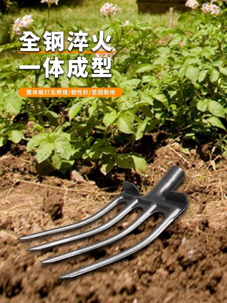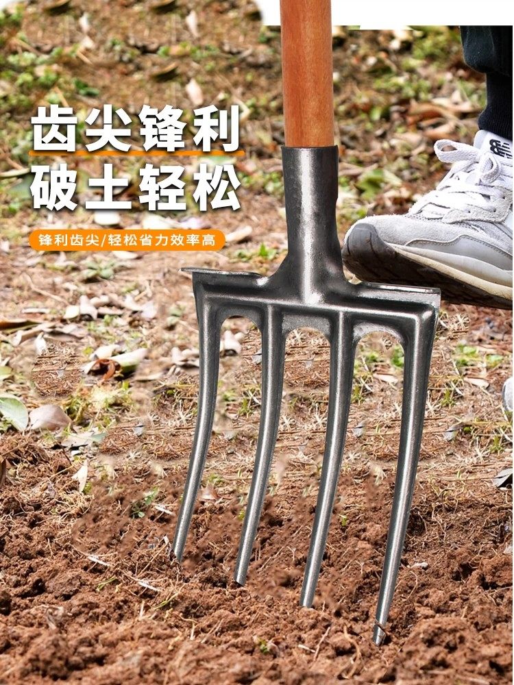 Four-Toothed All-Steel Fork for Loosening Soil, Five-Toothed Fork with Wooden Handle for Farming, Ginger Fork