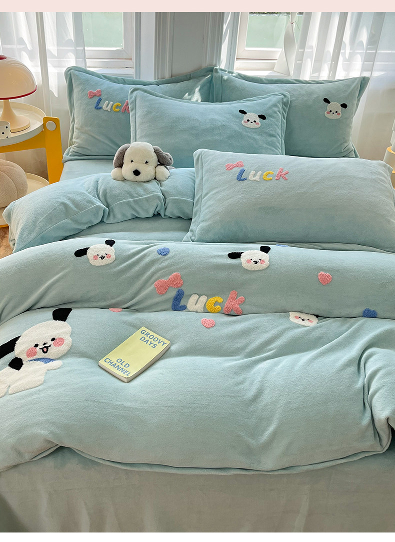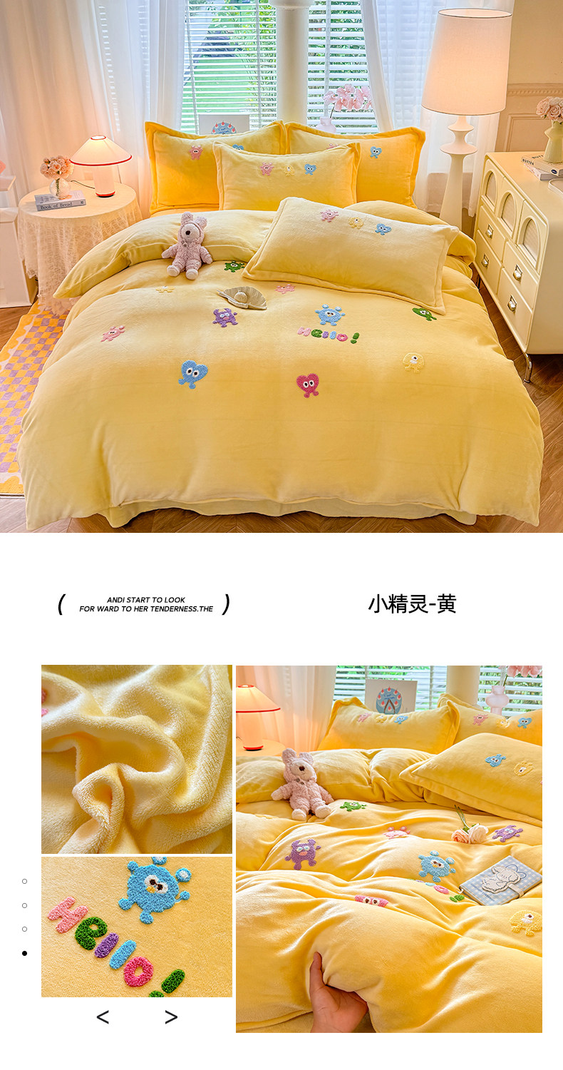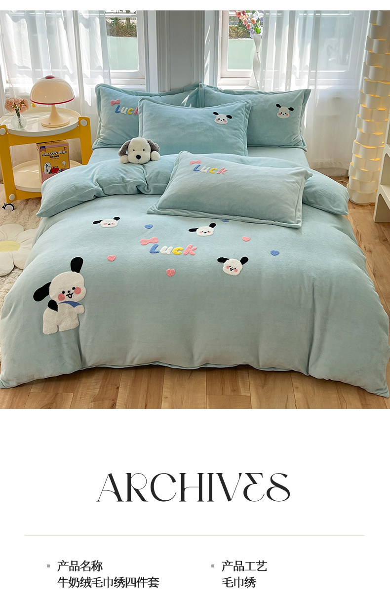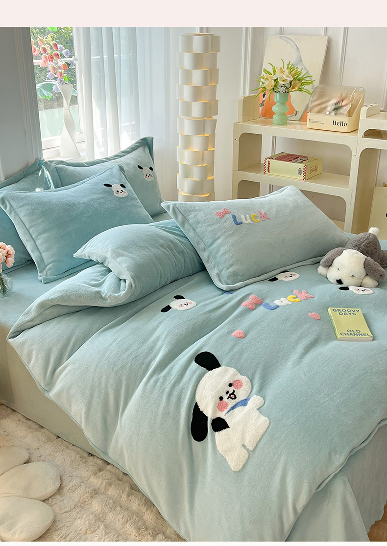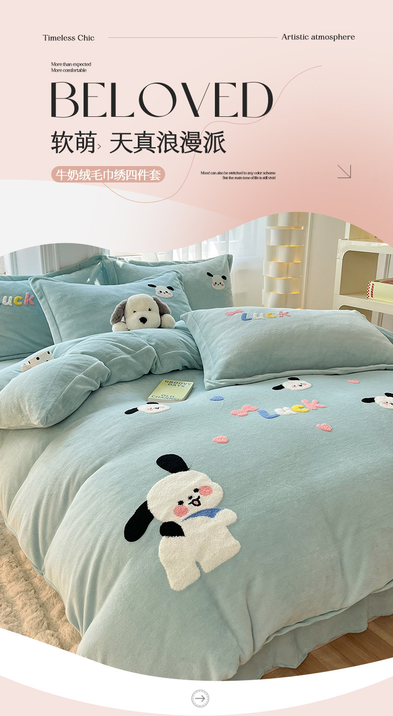 Class a New Cartoon Towel Embroidery Milk Velvet Four-Piece Set, Thickened and Warm Bed Sheet, Duvet Cover, Fleece-Lined Bedding