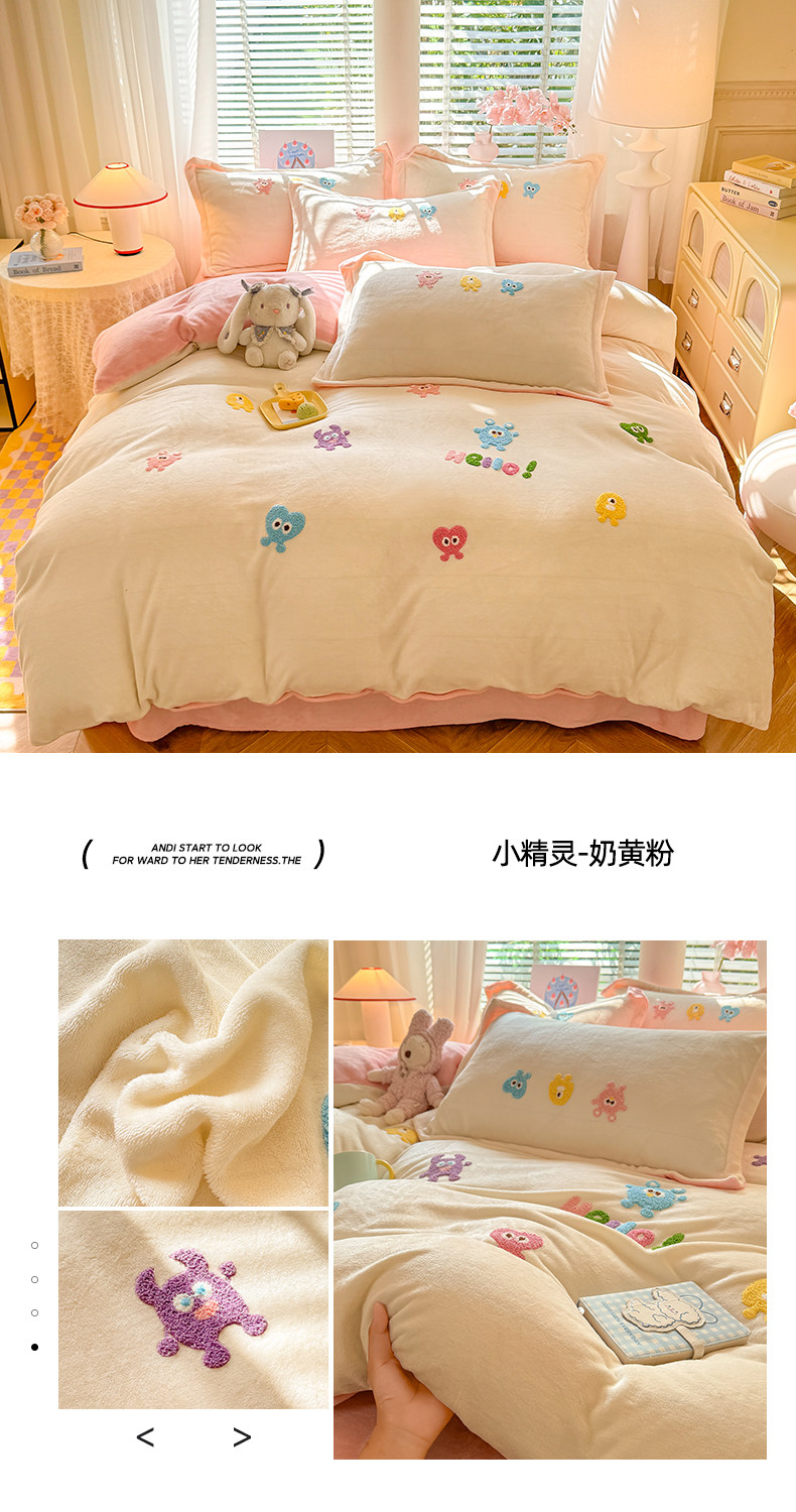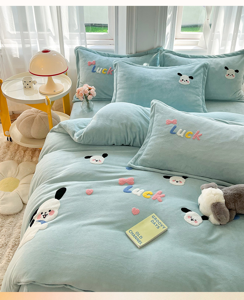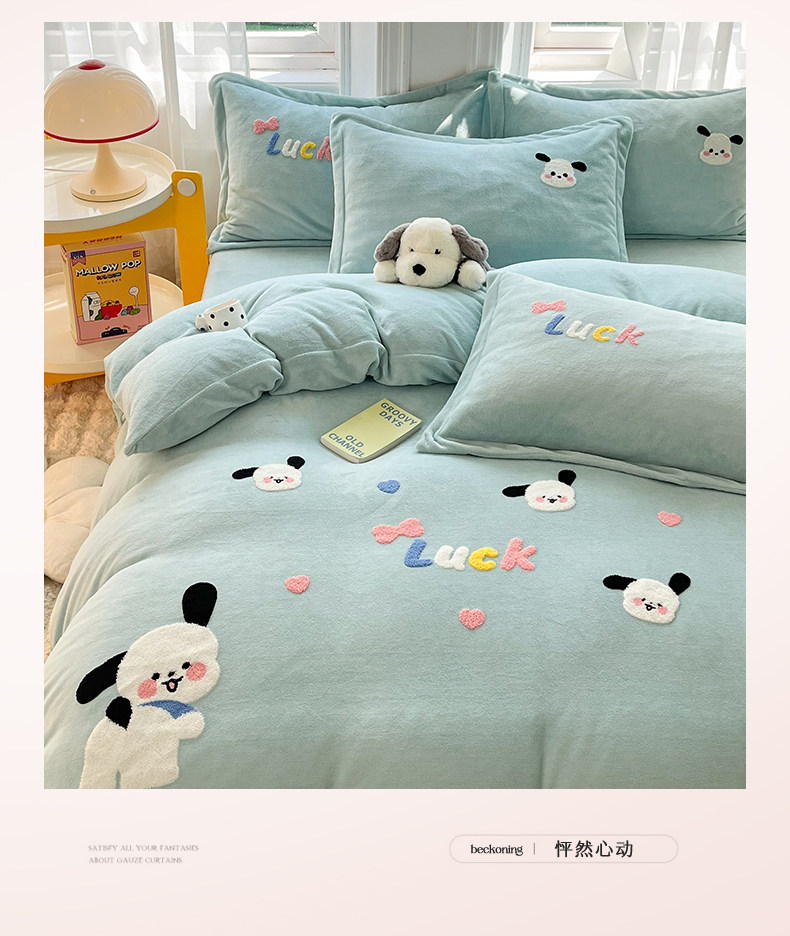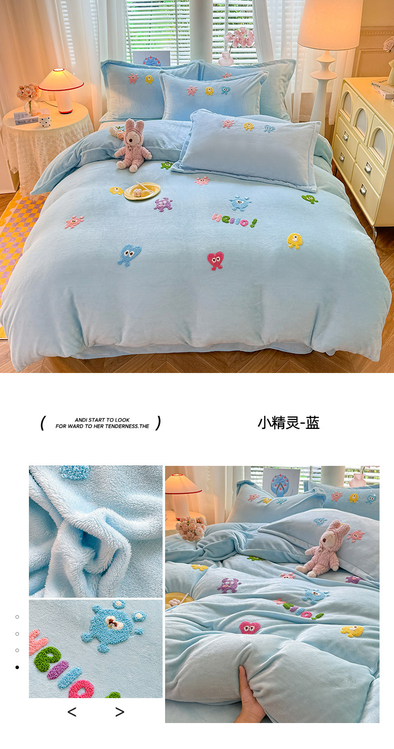 Class a New Cartoon Towel Embroidery Milk Velvet Four-Piece Set, Thickened and Warm Bed Sheet, Duvet Cover, Fleece-Lined Bedding
