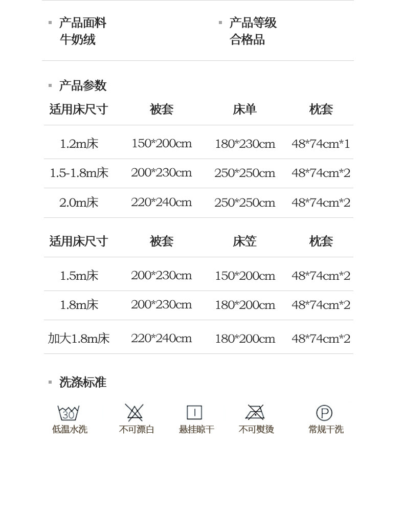 | Applicable Bed Size | 1.2m Bed[Three-Piece Bed Sheet Set]Suitable for 150×200 Quilt,1.5m Bed[Bed Sheet Four-Piece Set]Suitable for 200×230 Quilt,1.8m Bed[Bed Sheet Four-Piece Set]Suitable for 200×230 Quilt,2.0m Bed[Bed Sheet Four-Piece Set]Suitable for 220×240 Quilt,[Four Piece Set 1.5m Fitted Sheet]Suitable for 200×230 Quilt,[Four Piece Set 1.8m Fitted Sheet]Suitable for 200×230 Quilt,[Four Piece Set 1.8m Fitted Sheet Large Quilt Cover]Suitable for 220×240 Quilt |