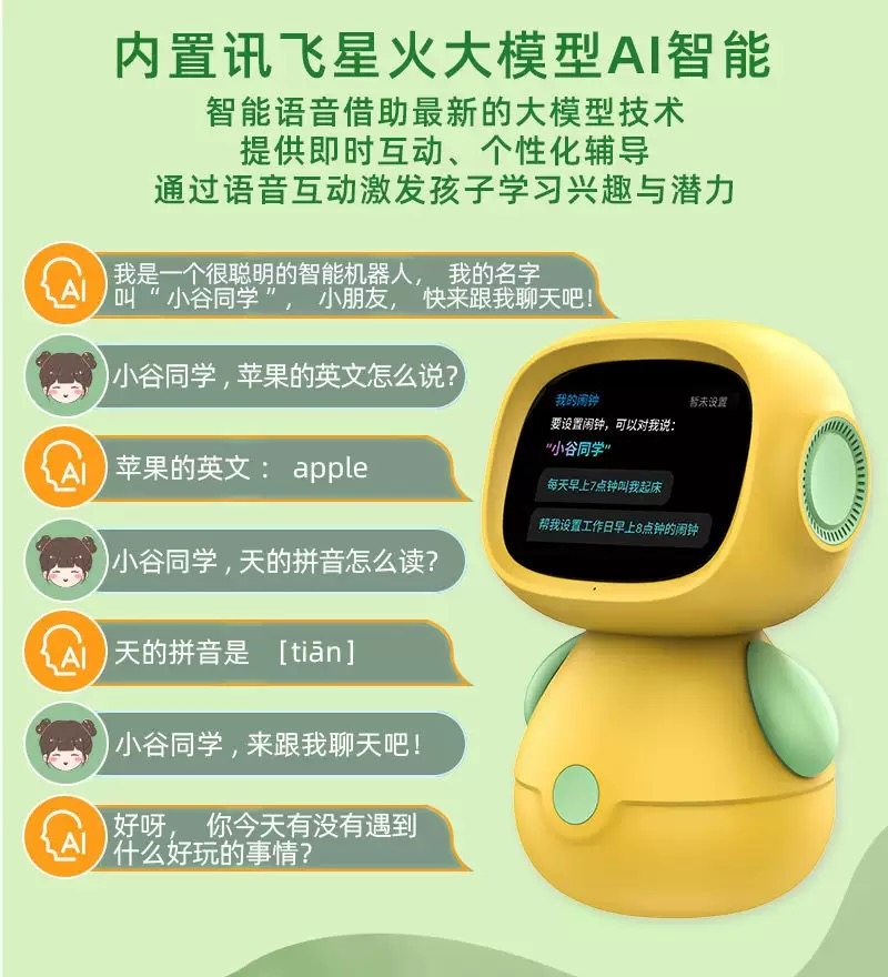 | Color Classification | Xiaogu Classmates + Spark Large Model + Massive Content + Ultra-Clear Screen + 5 Hours of Long Battery Life,wifi[Super Model]+Voice on Demand Voice Wake up,Astronaut Pink + Smart Bluetooth Speaker (Must Be Connected to a Mobile Phone to Use),Astronaut Blue + Smart Bluetooth Speaker (Must Be Connected to a Mobile Phone to Use),Mango Yellow Xiaowei Xiaowei + Smart Alarm Clock Early Education Learning Robot,Apple Green Xiaowei Xiaowei + Smart Alarm Clock Early Education Learning Robot |